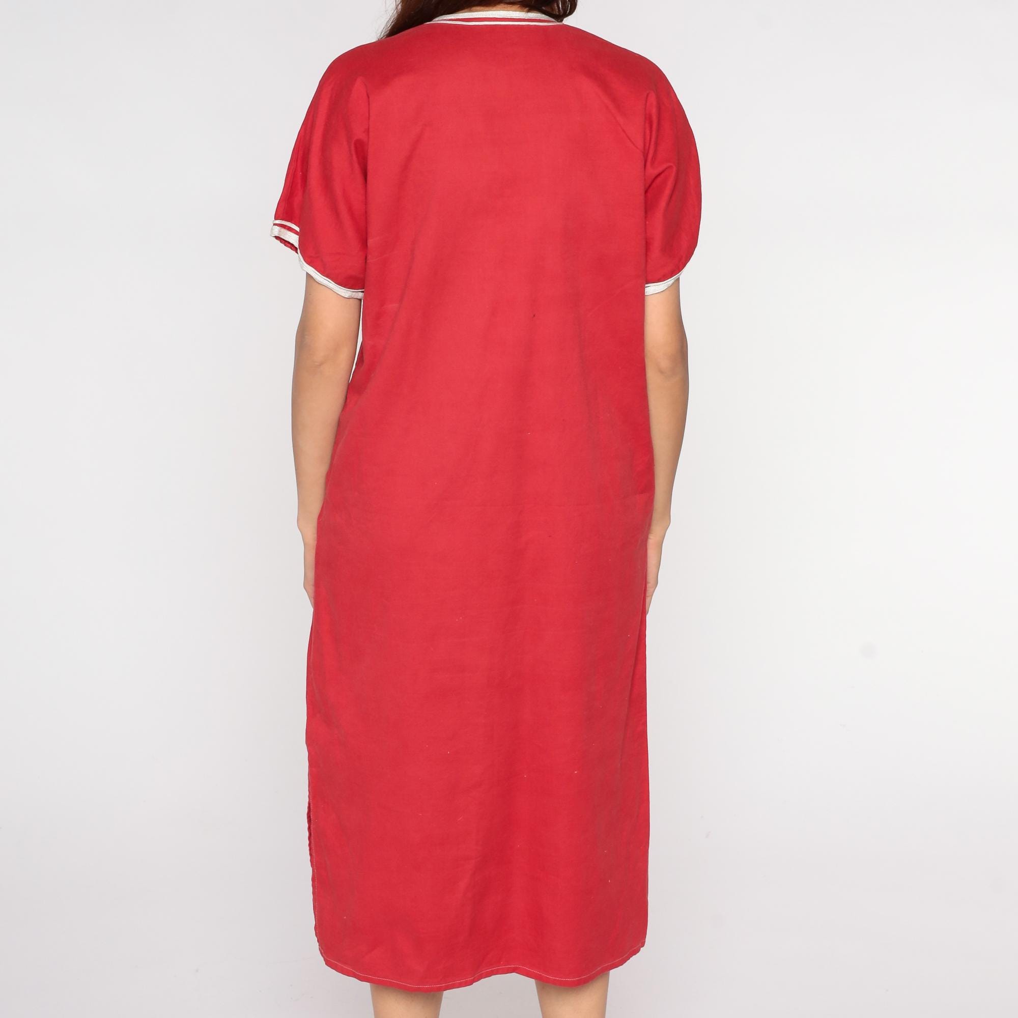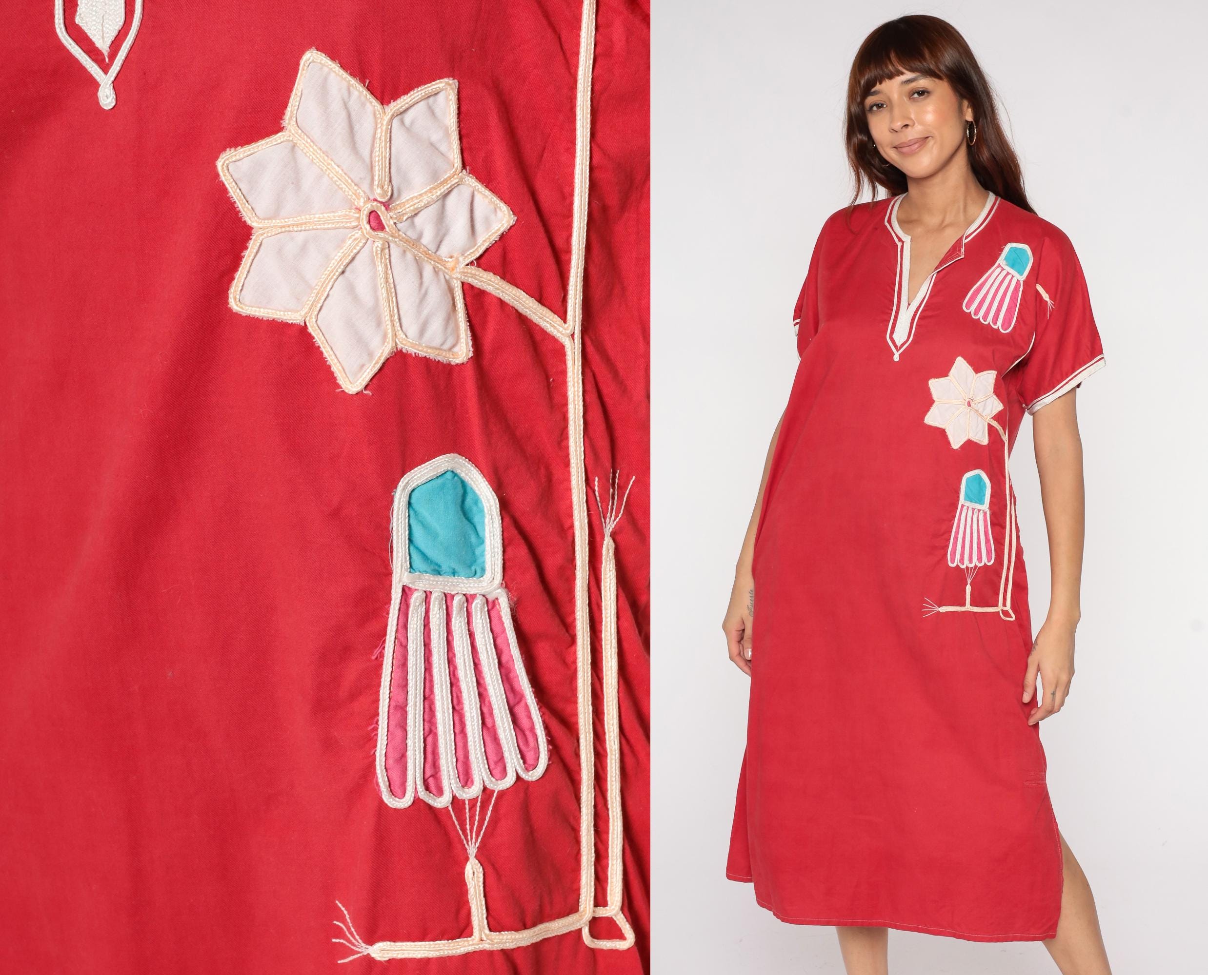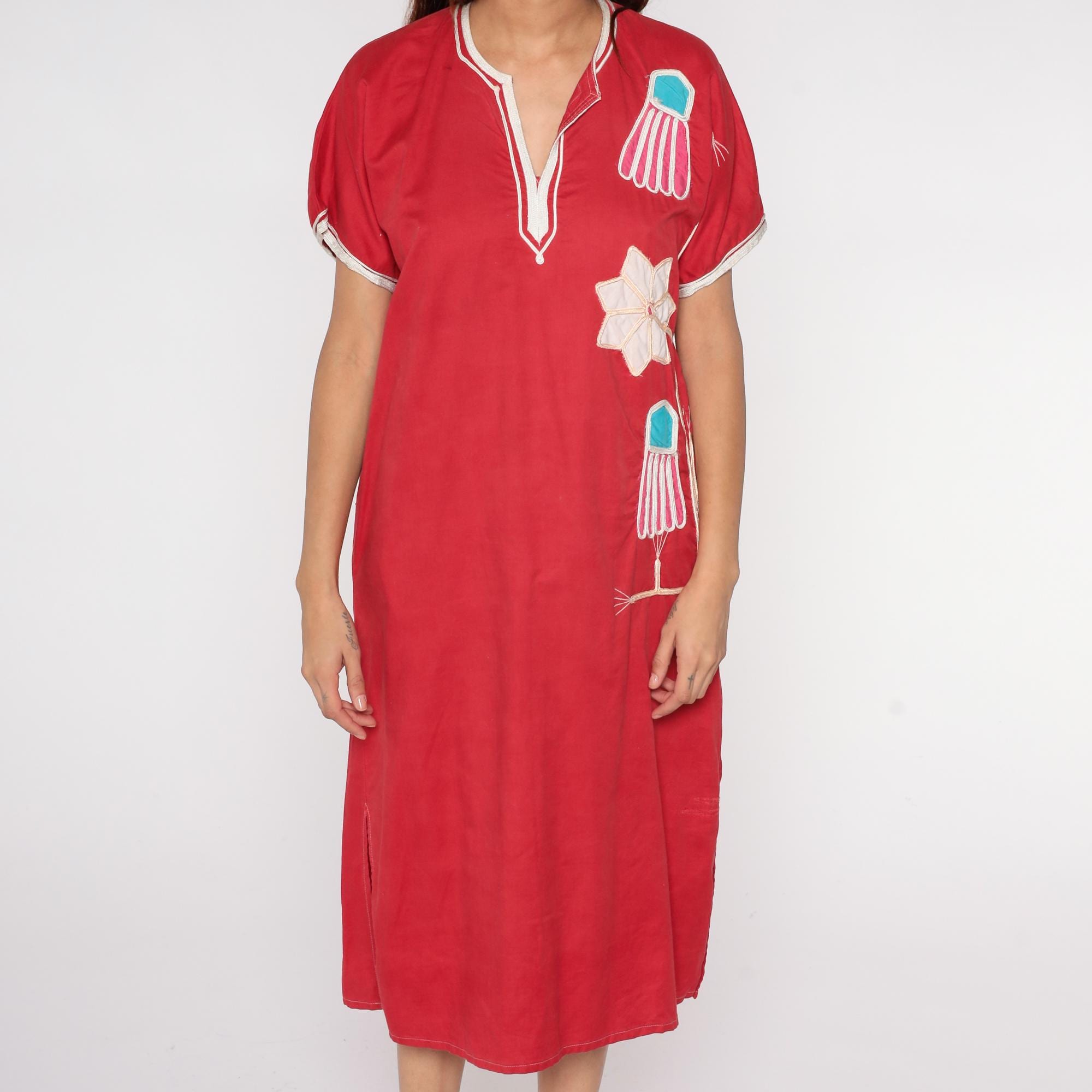 80s red cotton blend kaftan dress featuring unique embroidered appliqués of jellyfish in turquoise and white flower motifs. V-neckline with white piping trim and short sleeves. Loose, flowing fit with side slits