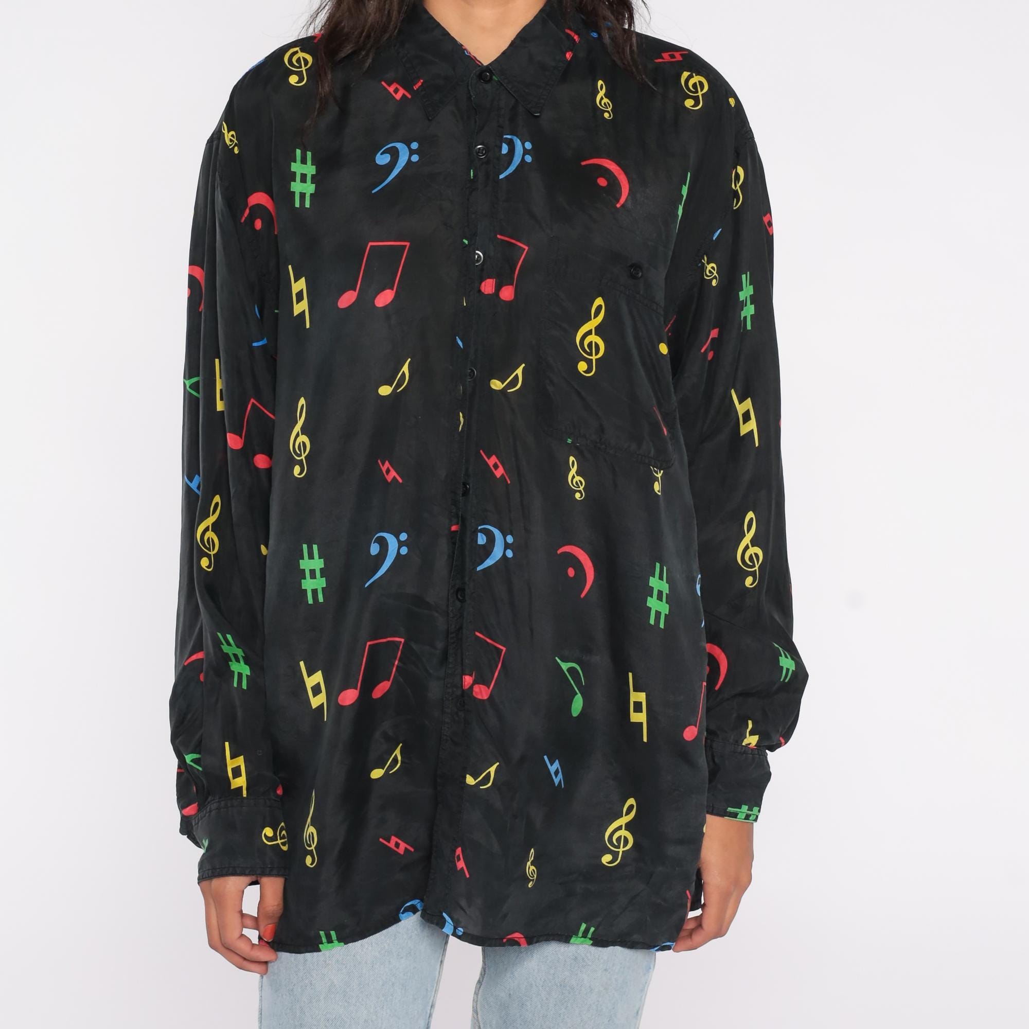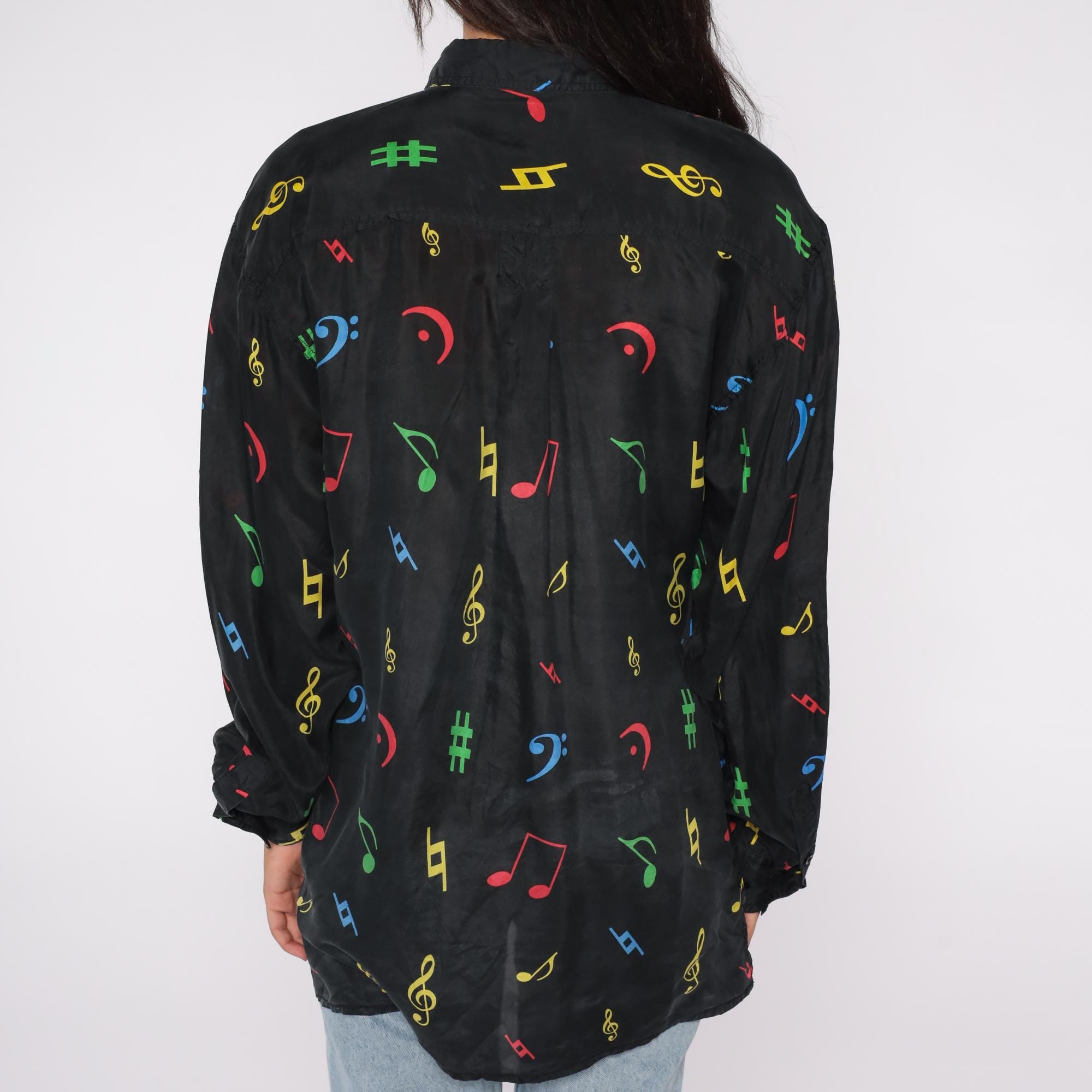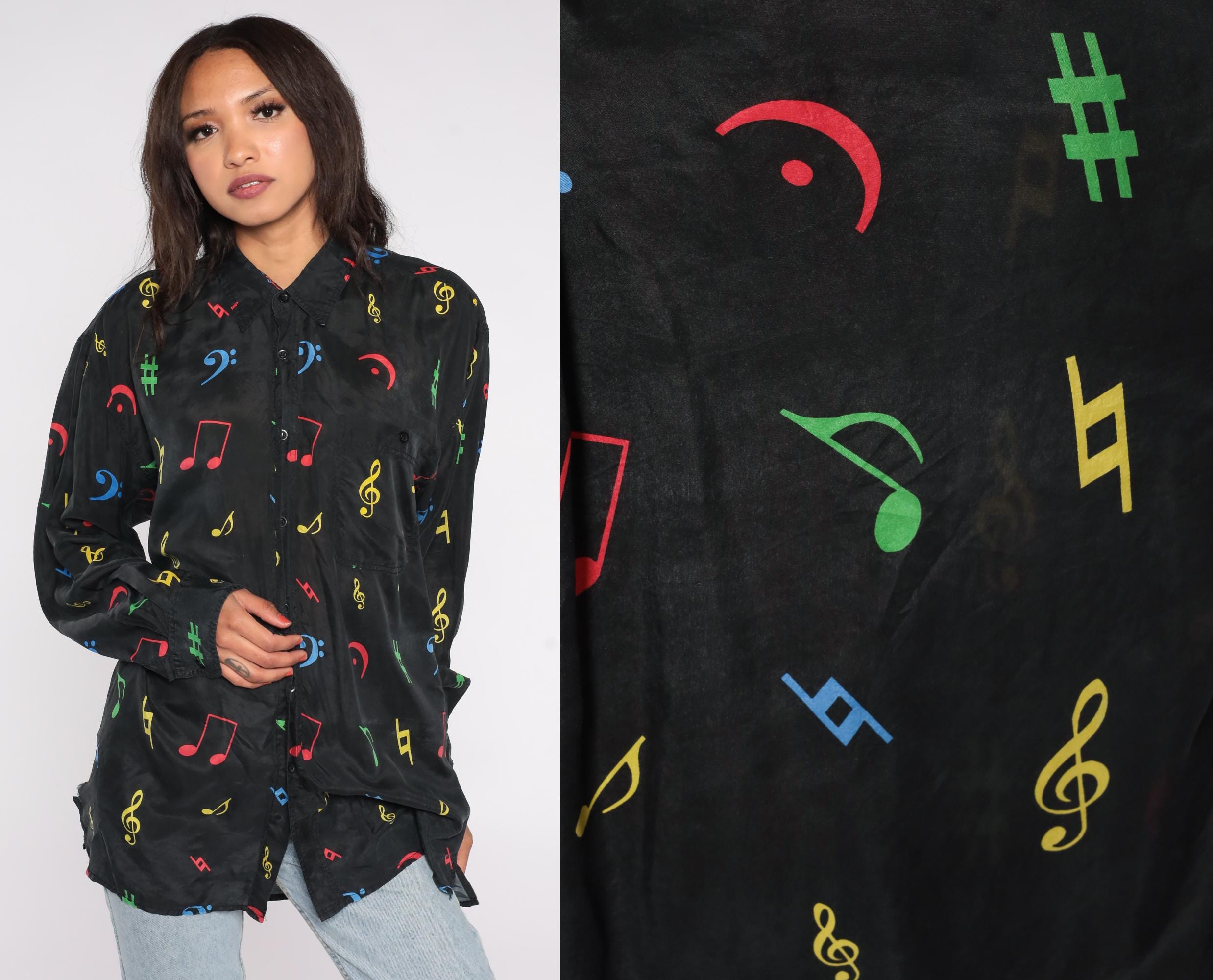 90s button-down shirt features colorful music notes and symbols printed on 100% black silk. The eye-catching pattern showcases musical notation including treble clefs, bass clefs, notes, and sharp symbols in bright red, blue, yellow, and green colors. The shirt has a standard pointed collar, full button front, and a comfortable loose fit with straight hem.