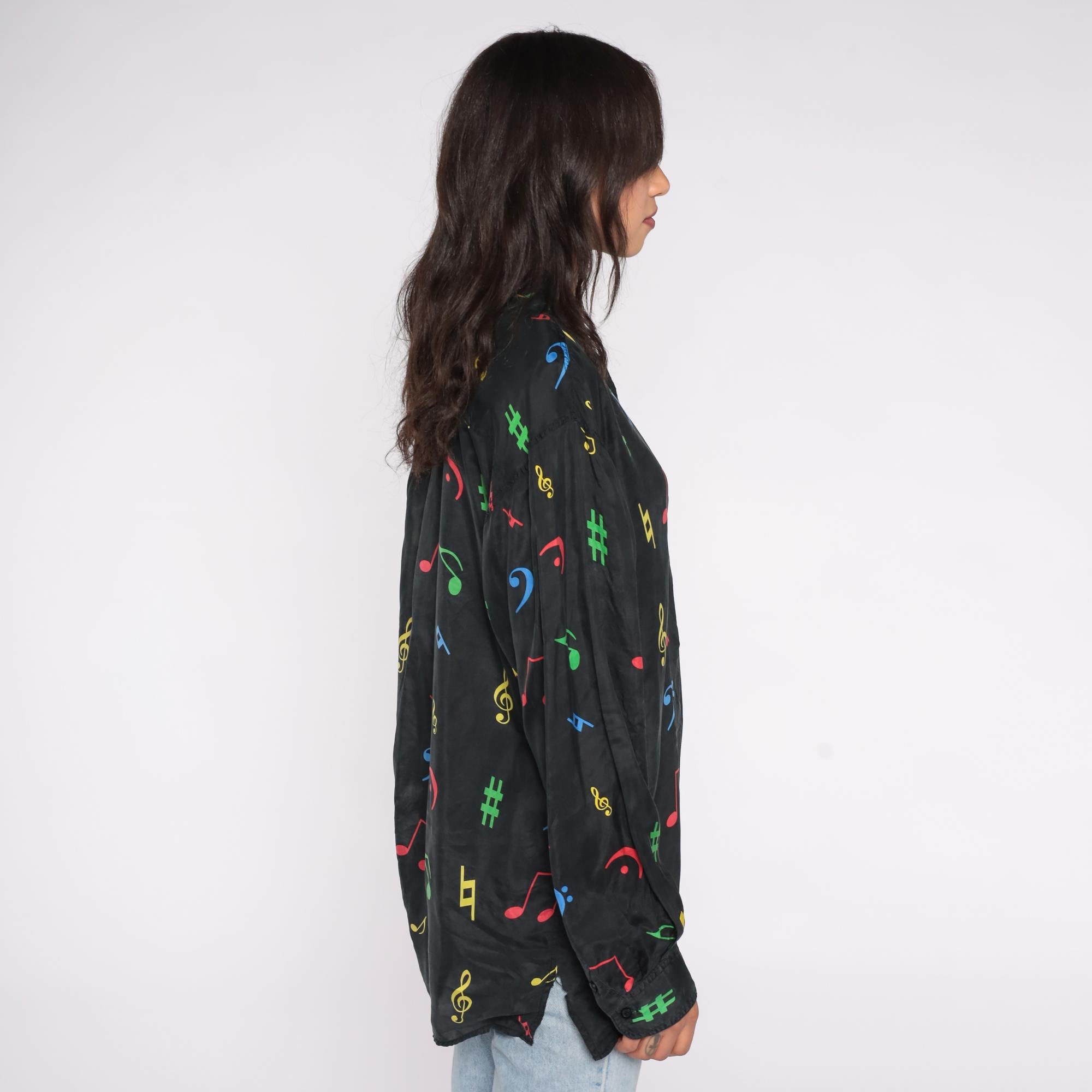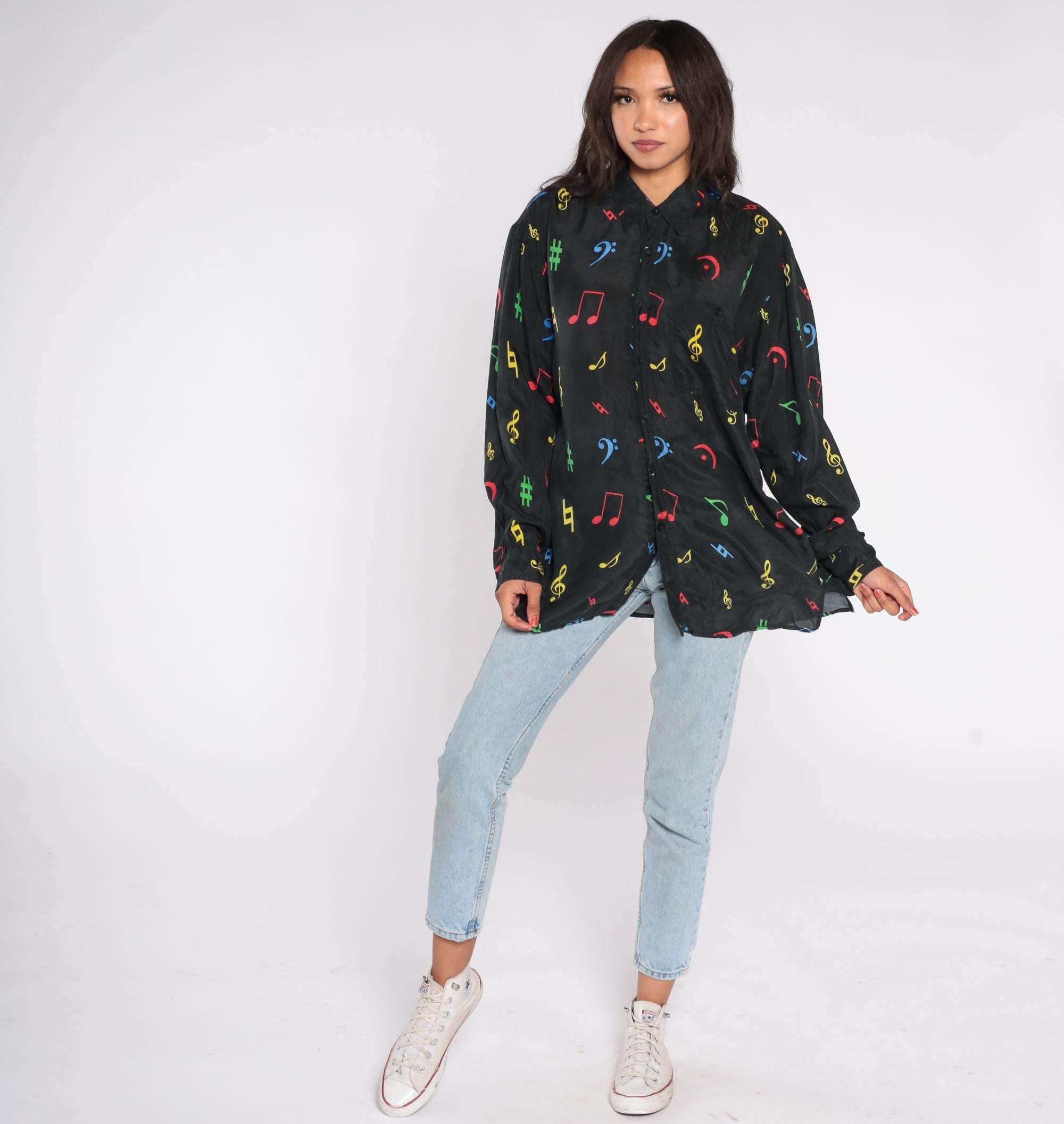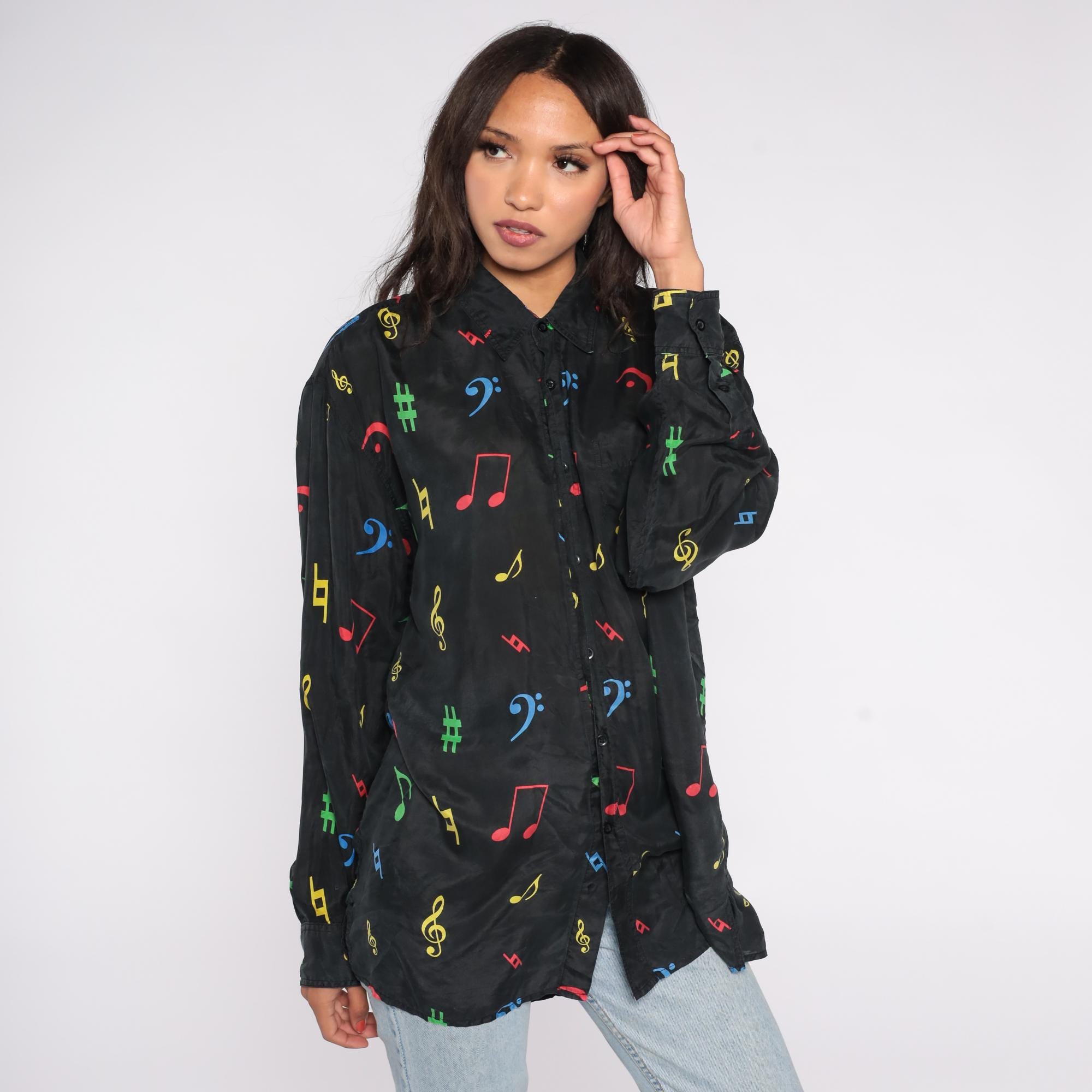 90s button-down shirt features colorful music notes and symbols printed on 100% black silk. The eye-catching pattern showcases musical notation including treble clefs, bass clefs, notes, and sharp symbols in bright red, blue, yellow, and green colors. The shirt has a standard pointed collar, full button front, and a comfortable loose fit with straight hem.