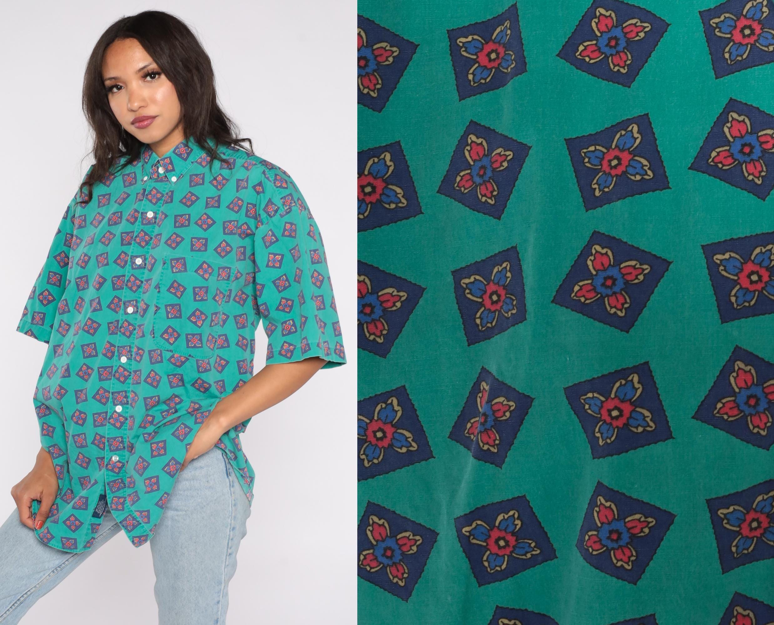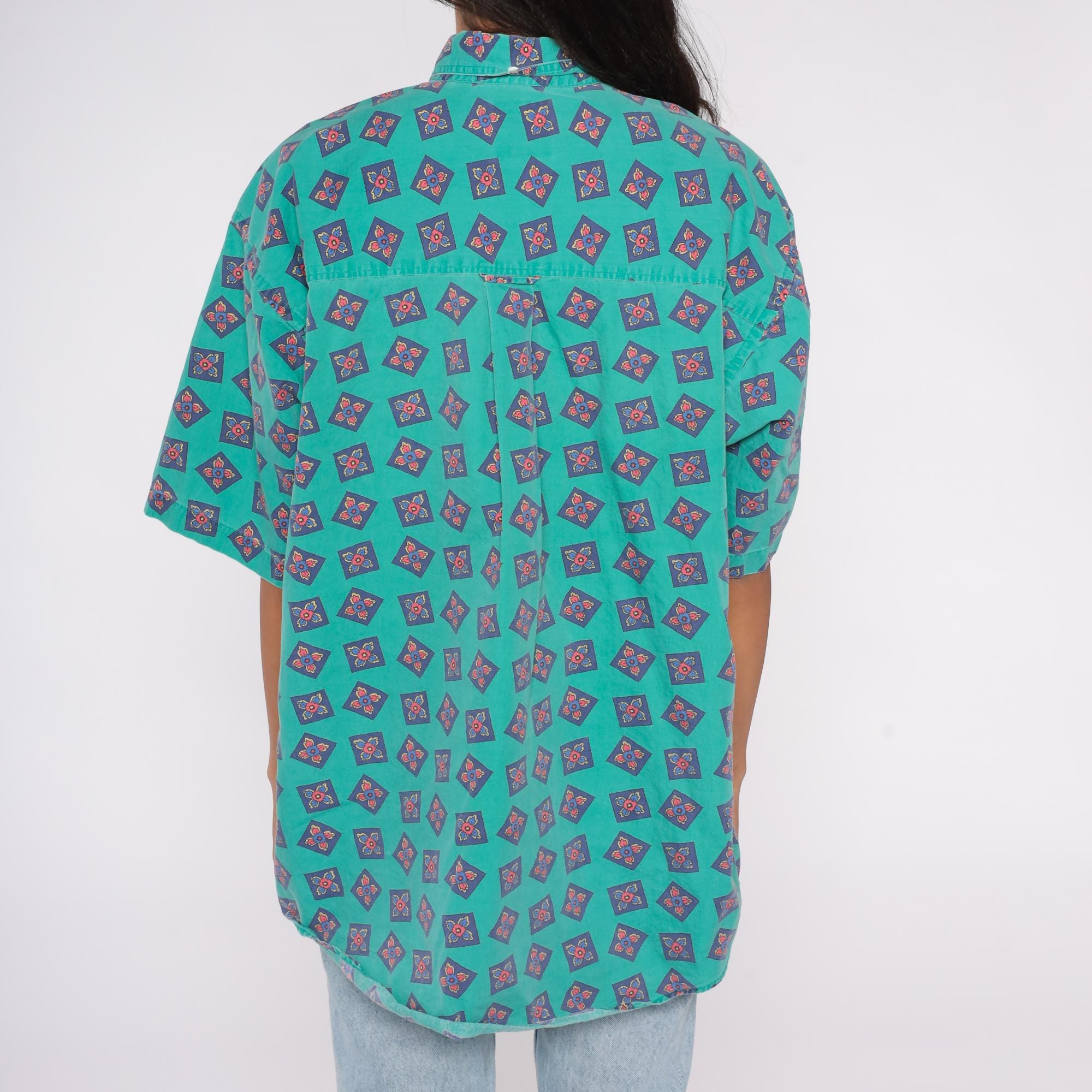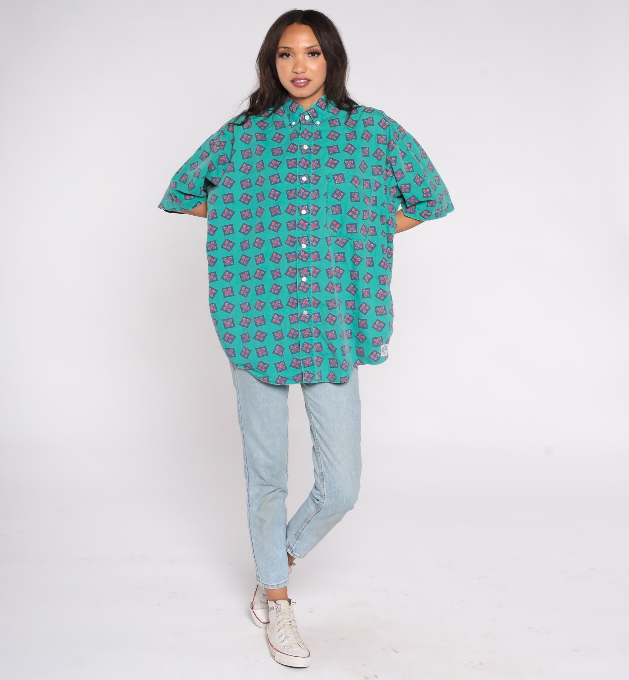 90s button-down shirt features a vibrant turquoise background with navy blue diamond patterns containing red and blue floral designs. The shirt includes a front chest pocket, straight hem, and classic button front closure.