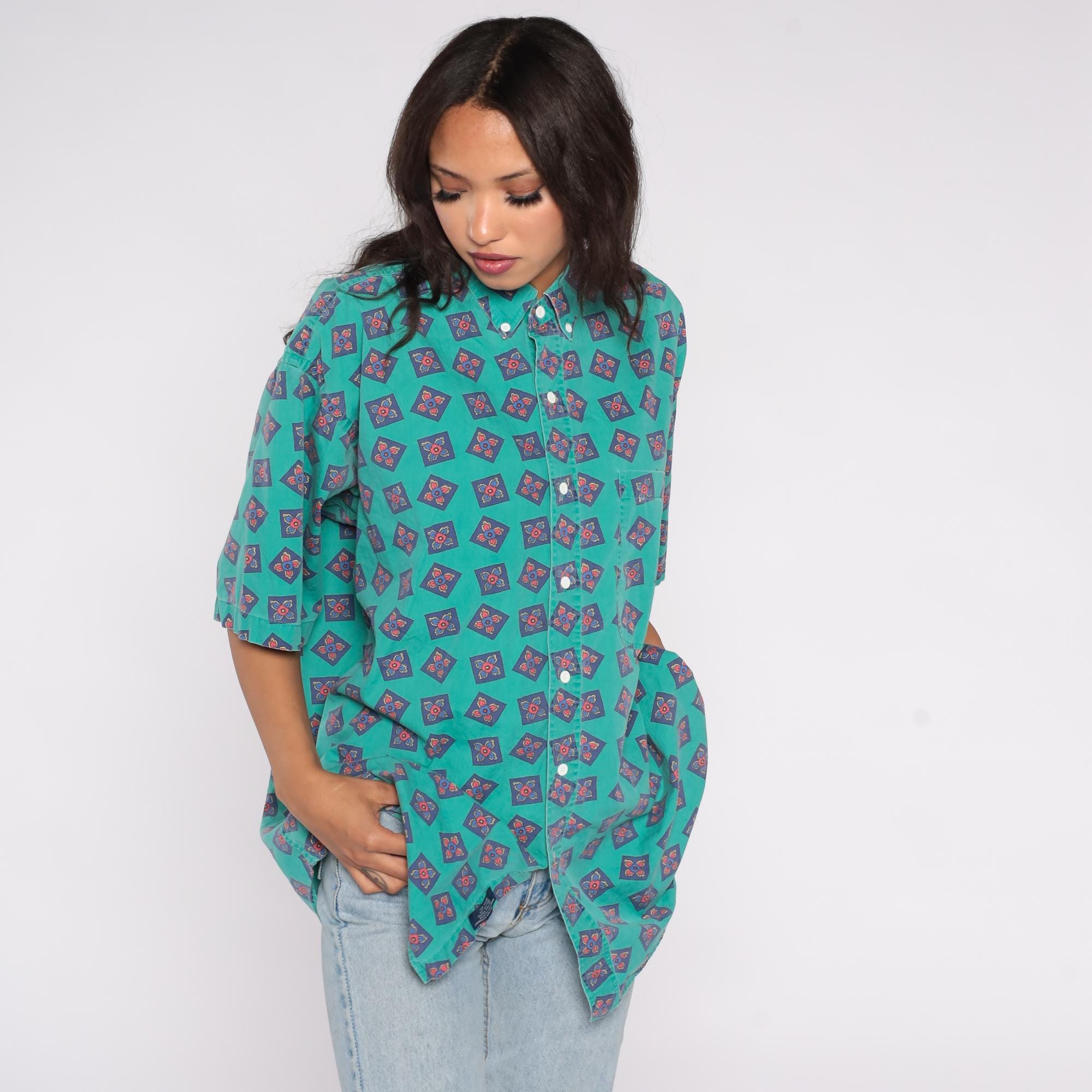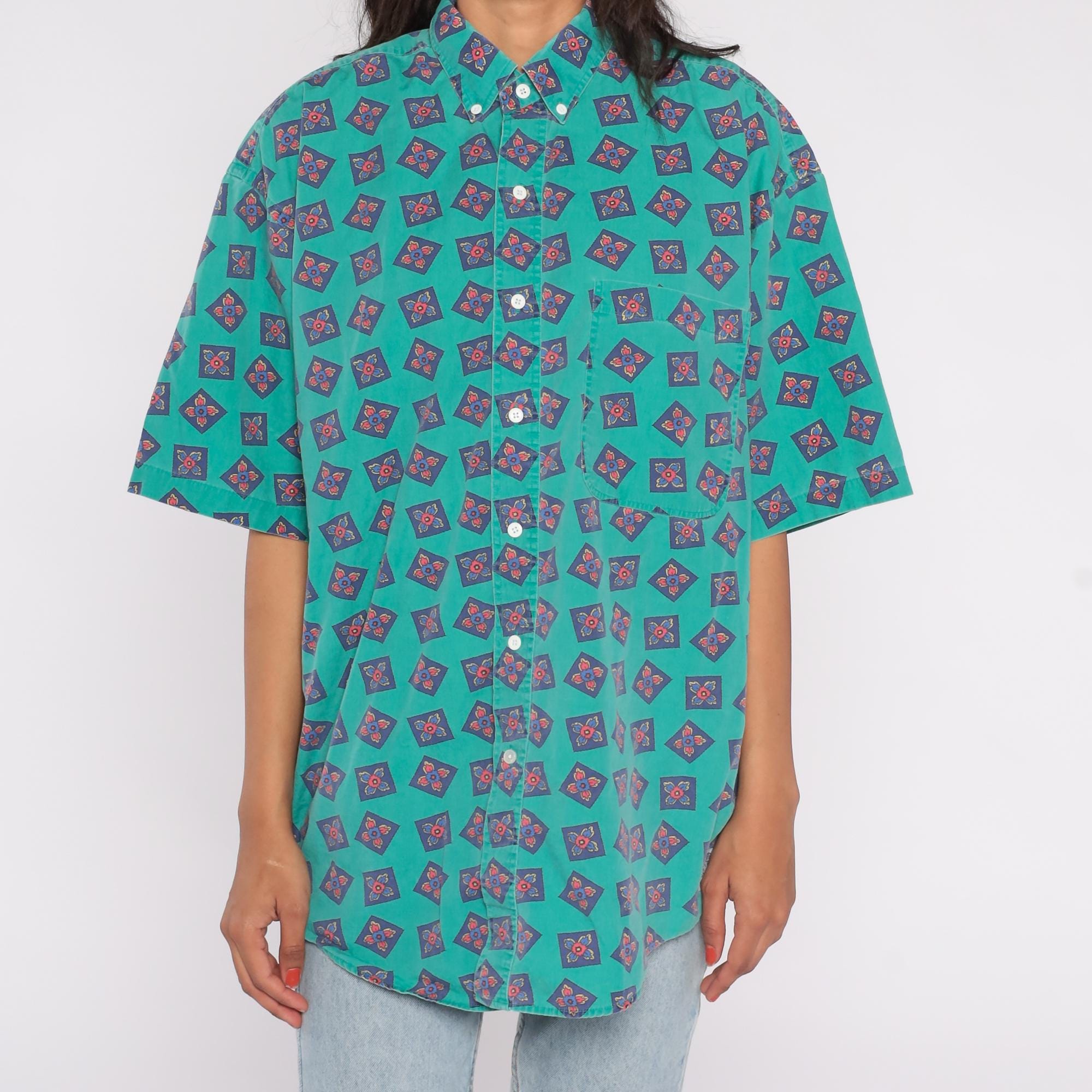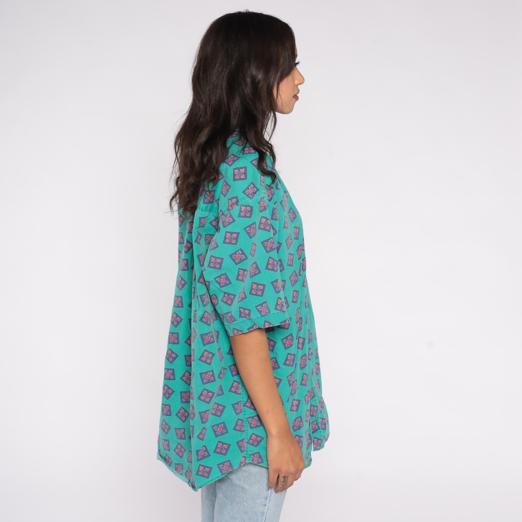 90s button-down shirt features a vibrant turquoise background with navy blue diamond patterns containing red and blue floral designs. The shirt includes a front chest pocket, straight hem, and classic button front closure.