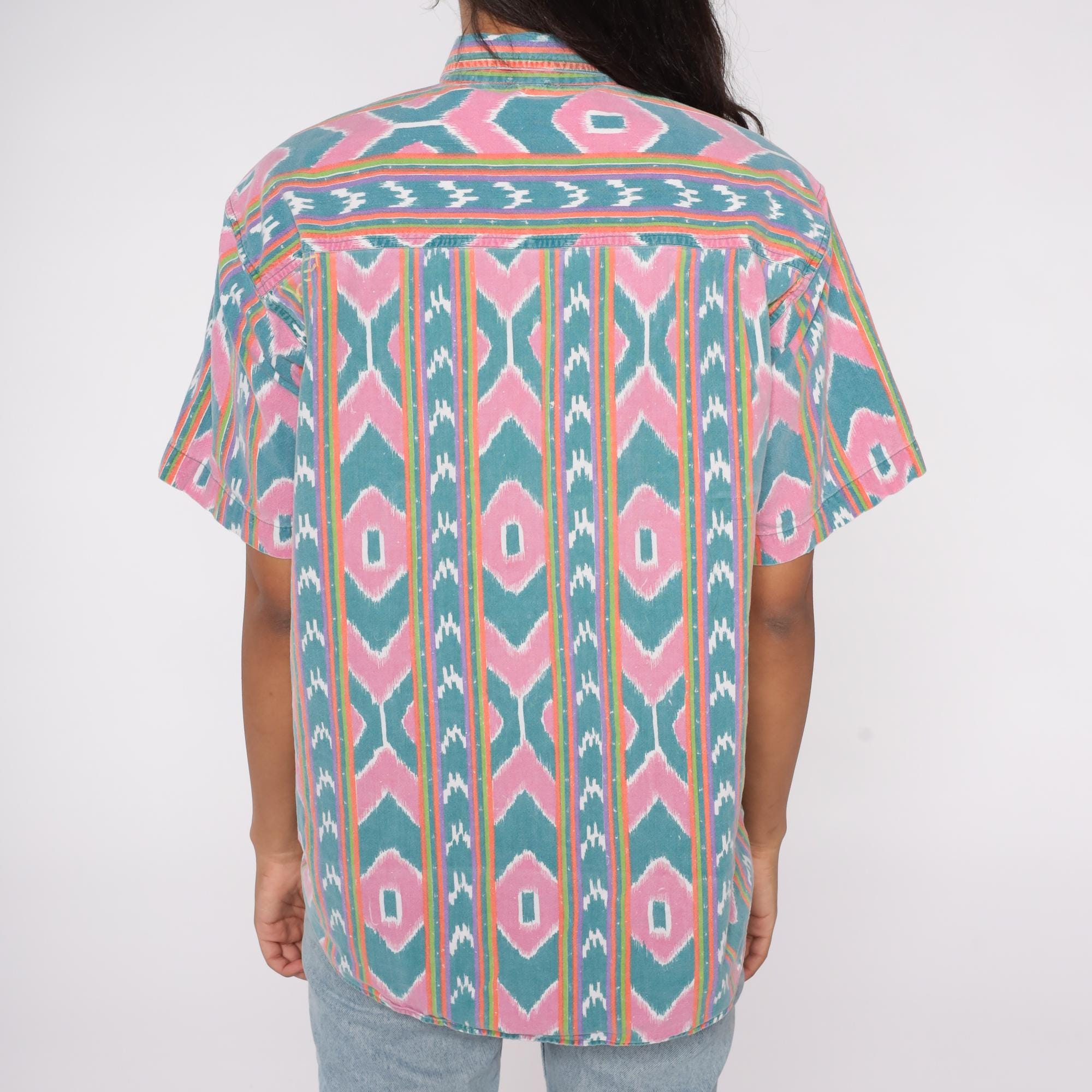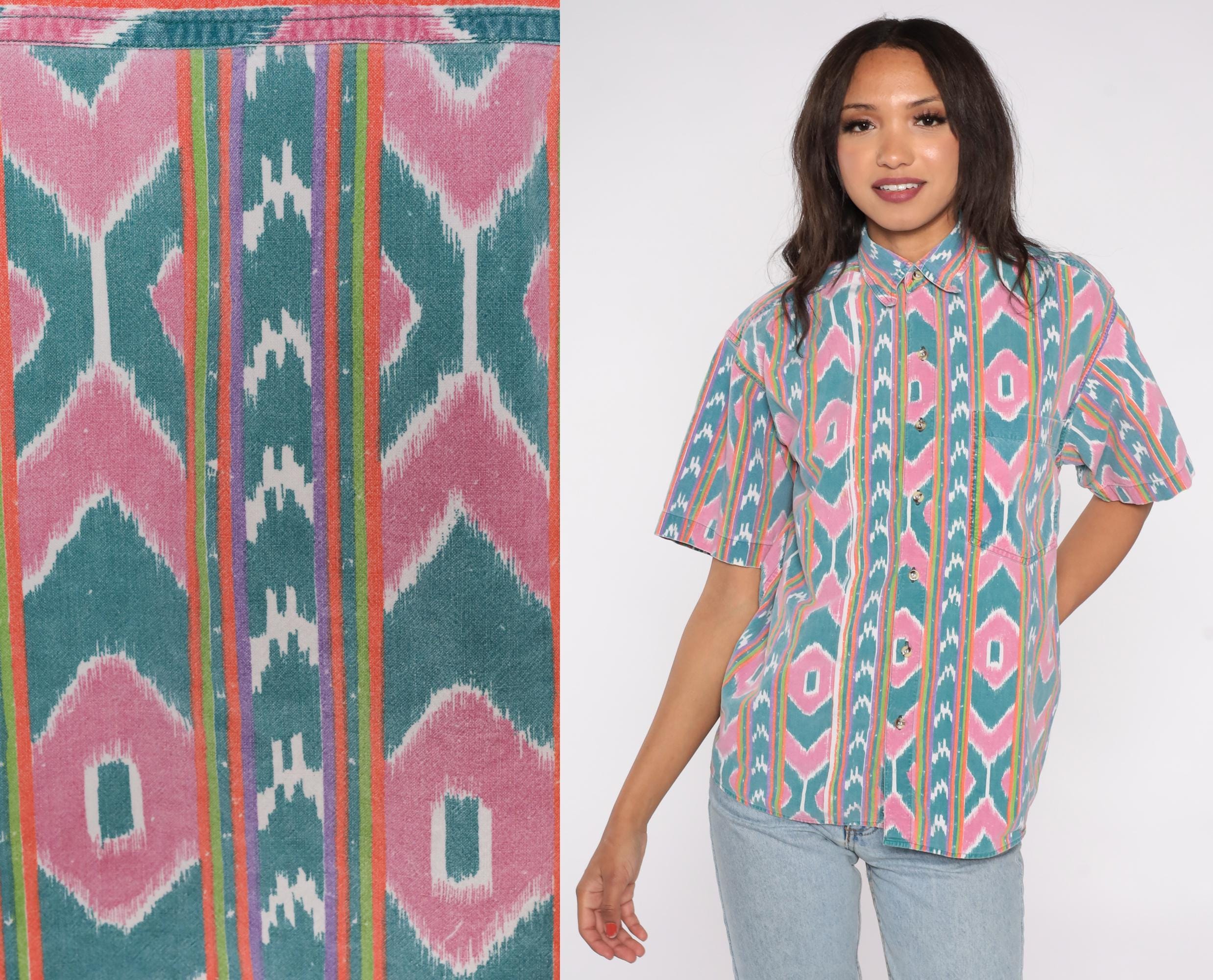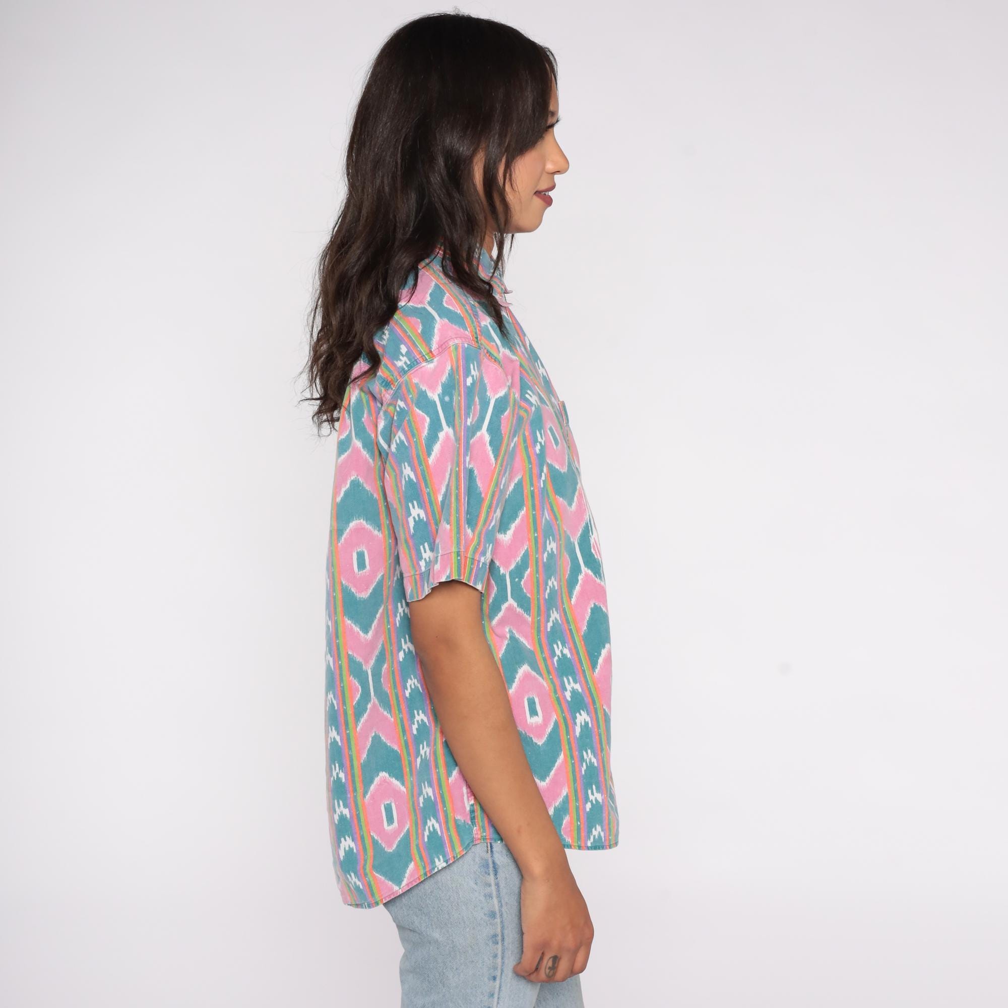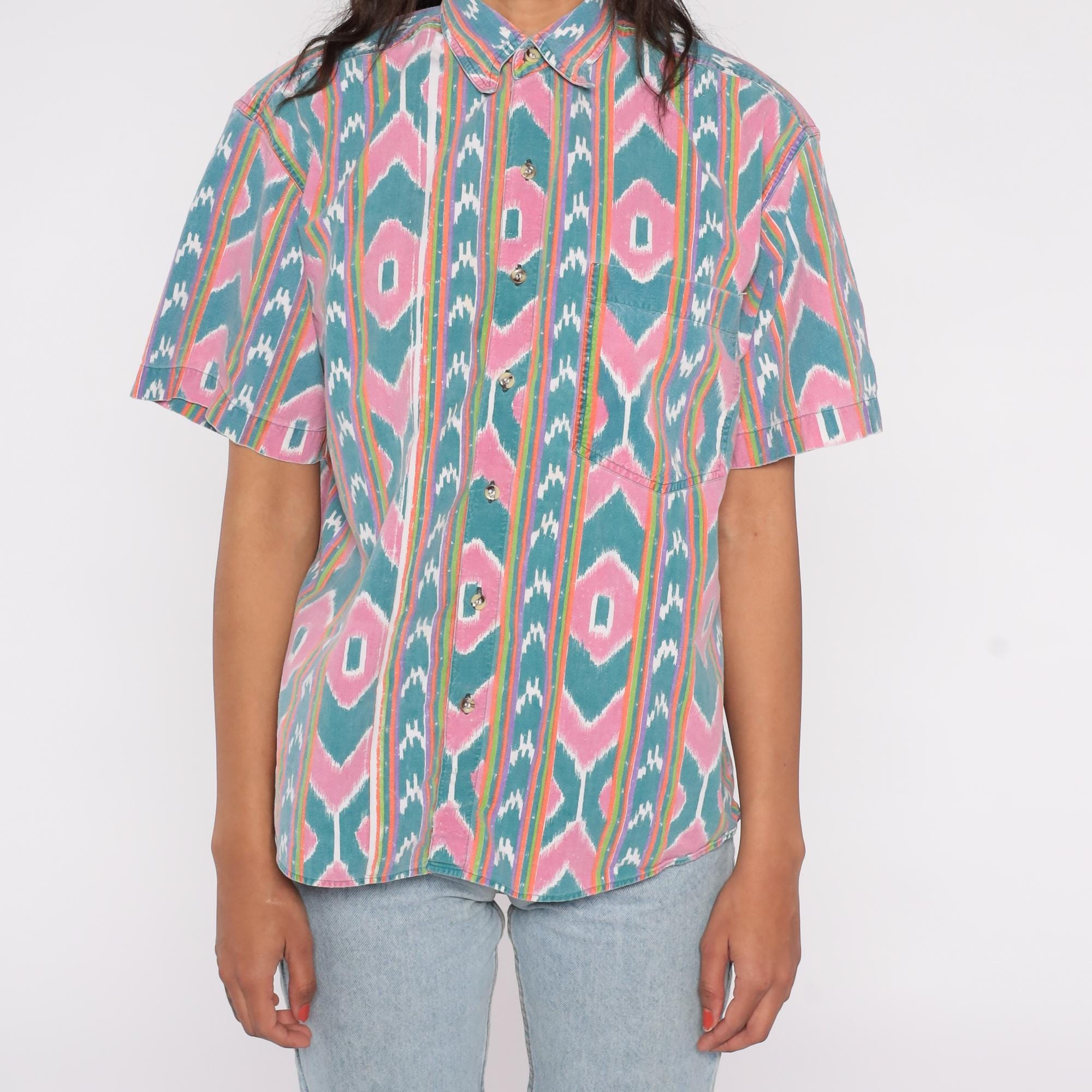 90s button-up shirt features a vibrant ikat-inspired pattern in pink and teal with colorful rainbow stripes. The geometric southwestern design showcases diamond motifs arranged in vertical stripes across the fabric.
