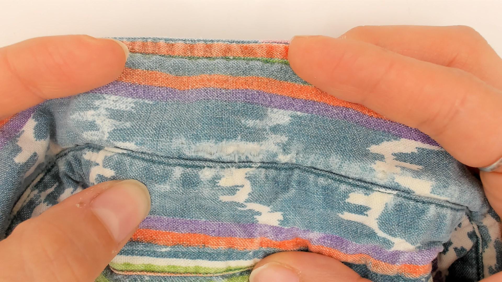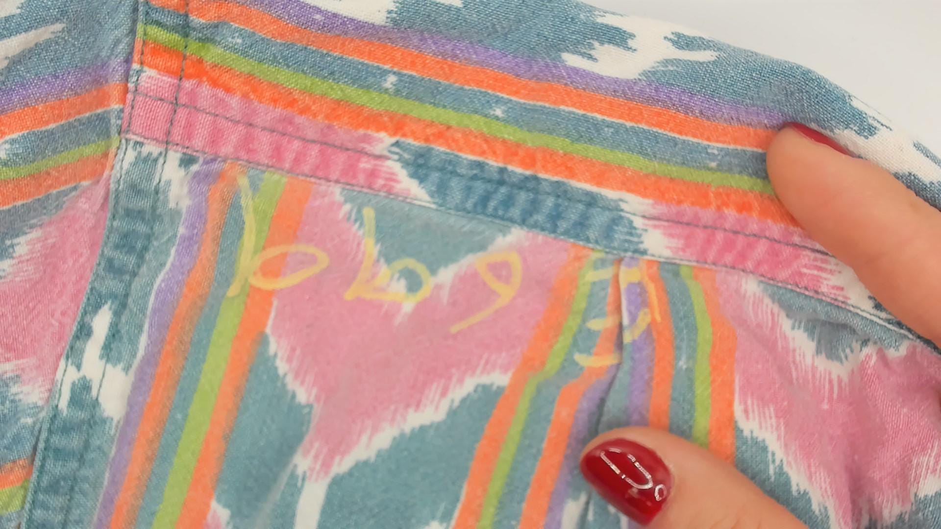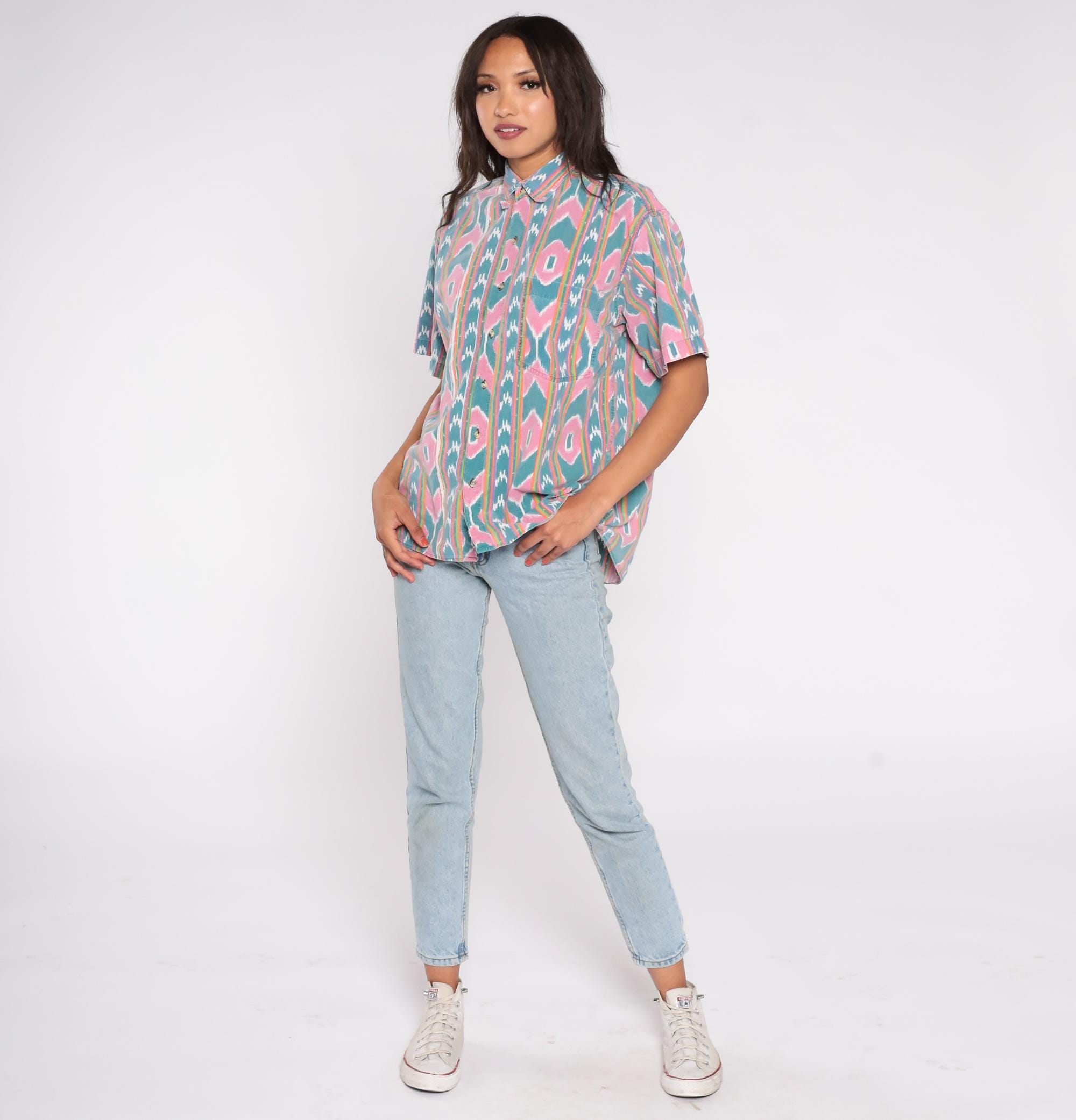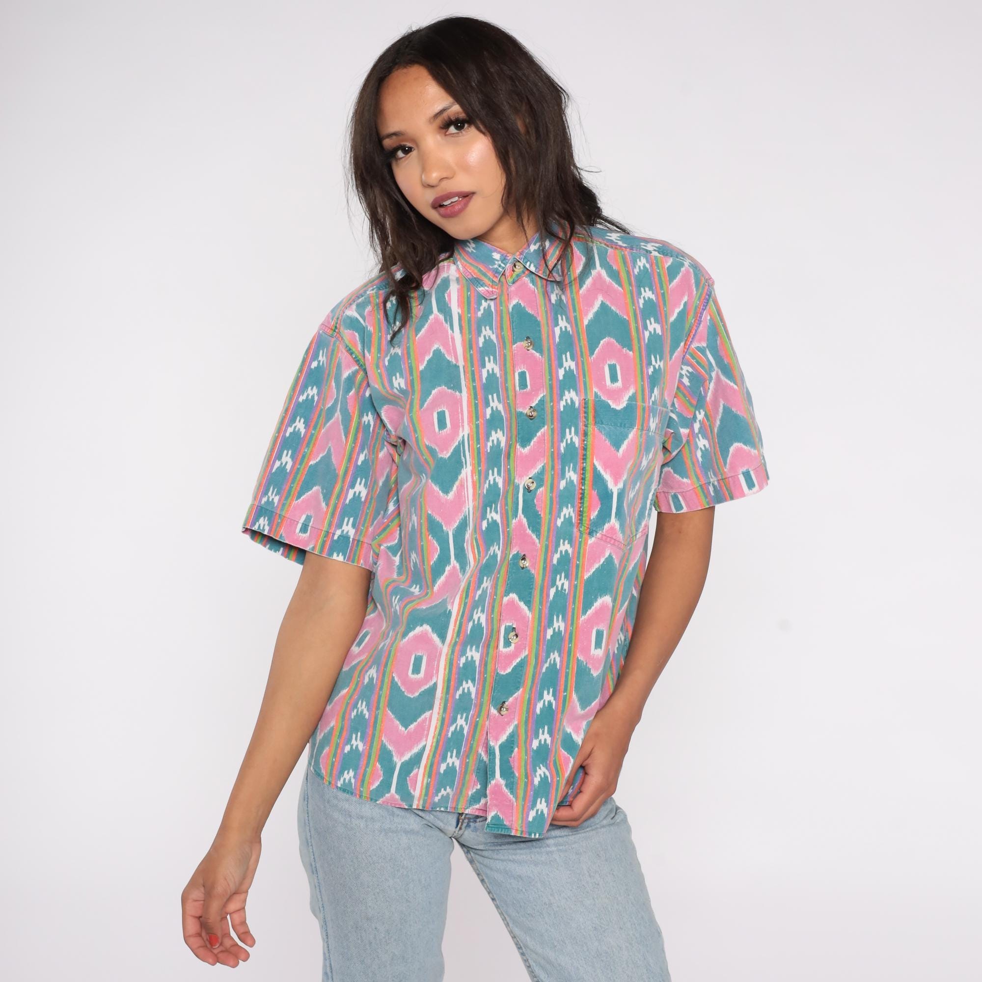 90s button-up shirt features a vibrant ikat-inspired pattern in pink and teal with colorful rainbow stripes. The geometric southwestern design showcases diamond motifs arranged in vertical stripes across the fabric.