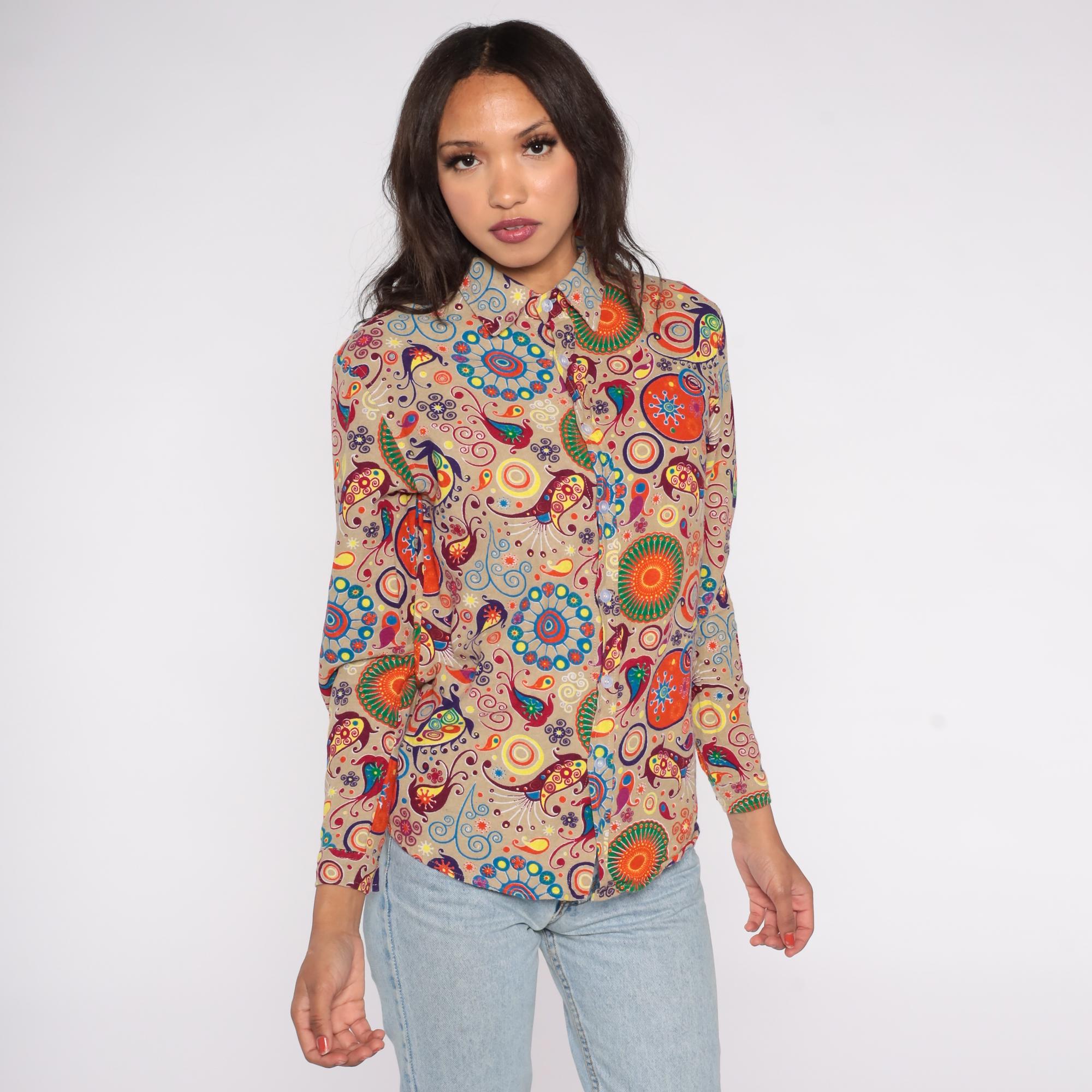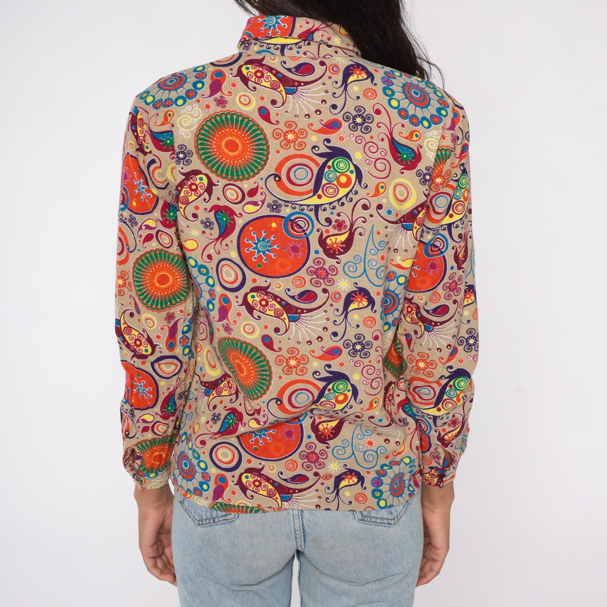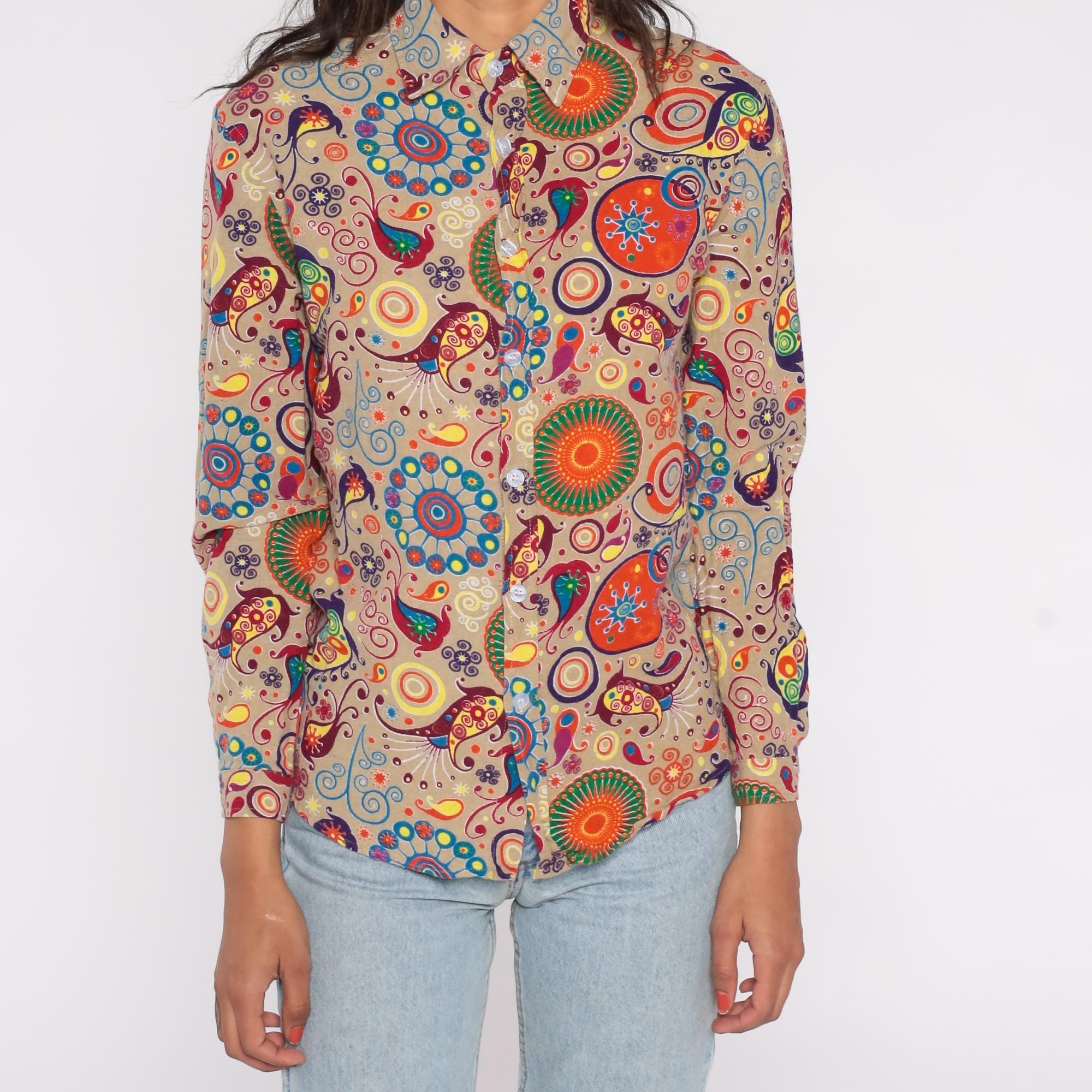Y2K button-down shirt features an eye-catching psychedelic print on a beige background. The colorful pattern includes orange sunbursts, blue spirals, purple swirls, and multicolor paisley motifs. Made from a cotton/polyester blend with a soft feel, this long sleeve shirt has a classic collar, front button closure, and standard cuffs.