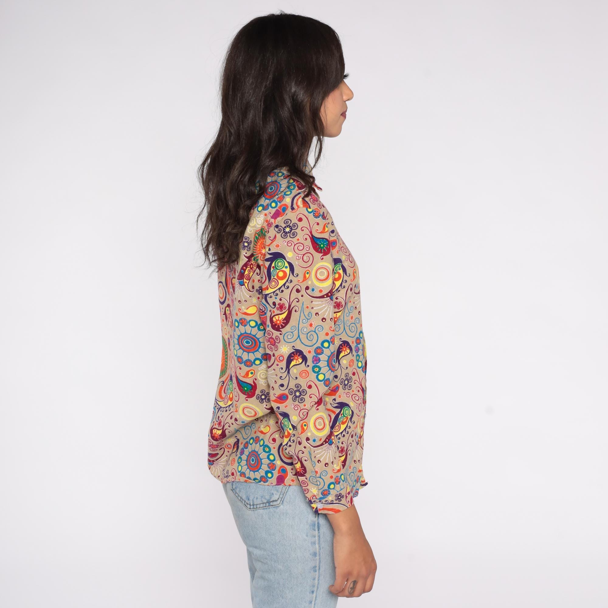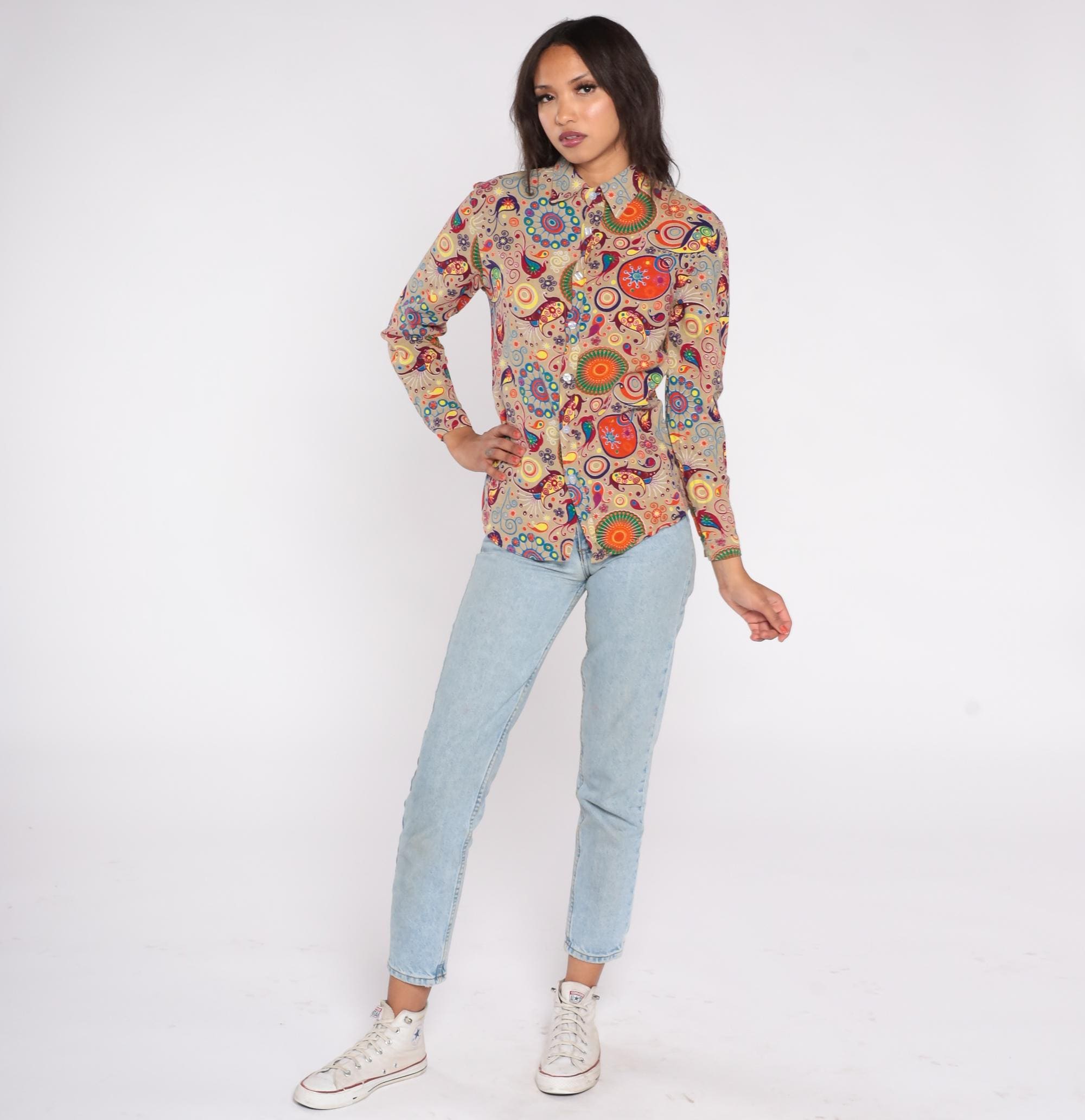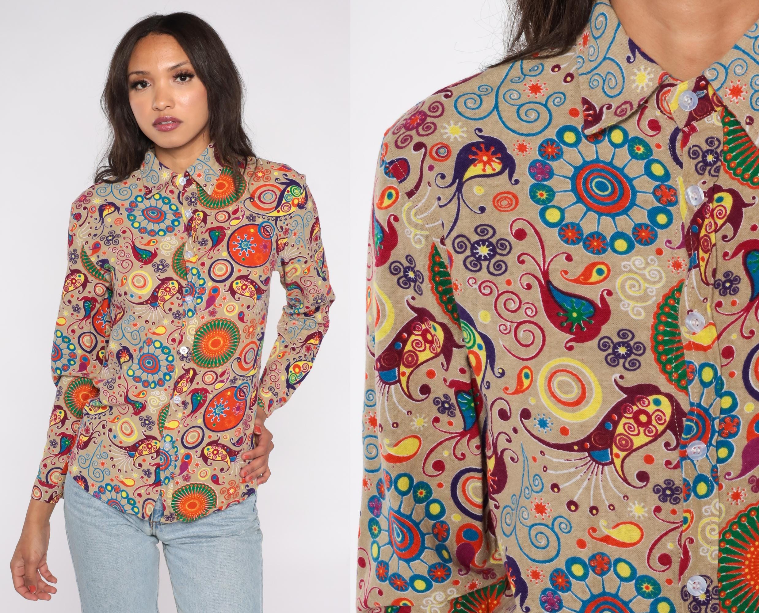 Y2K button-down shirt features an eye-catching psychedelic print on a beige background. The colorful pattern includes orange sunbursts, blue spirals, purple swirls, and multicolor paisley motifs. Made from a cotton/polyester blend with a soft feel, this long sleeve shirt has a classic collar, front button closure, and standard cuffs.