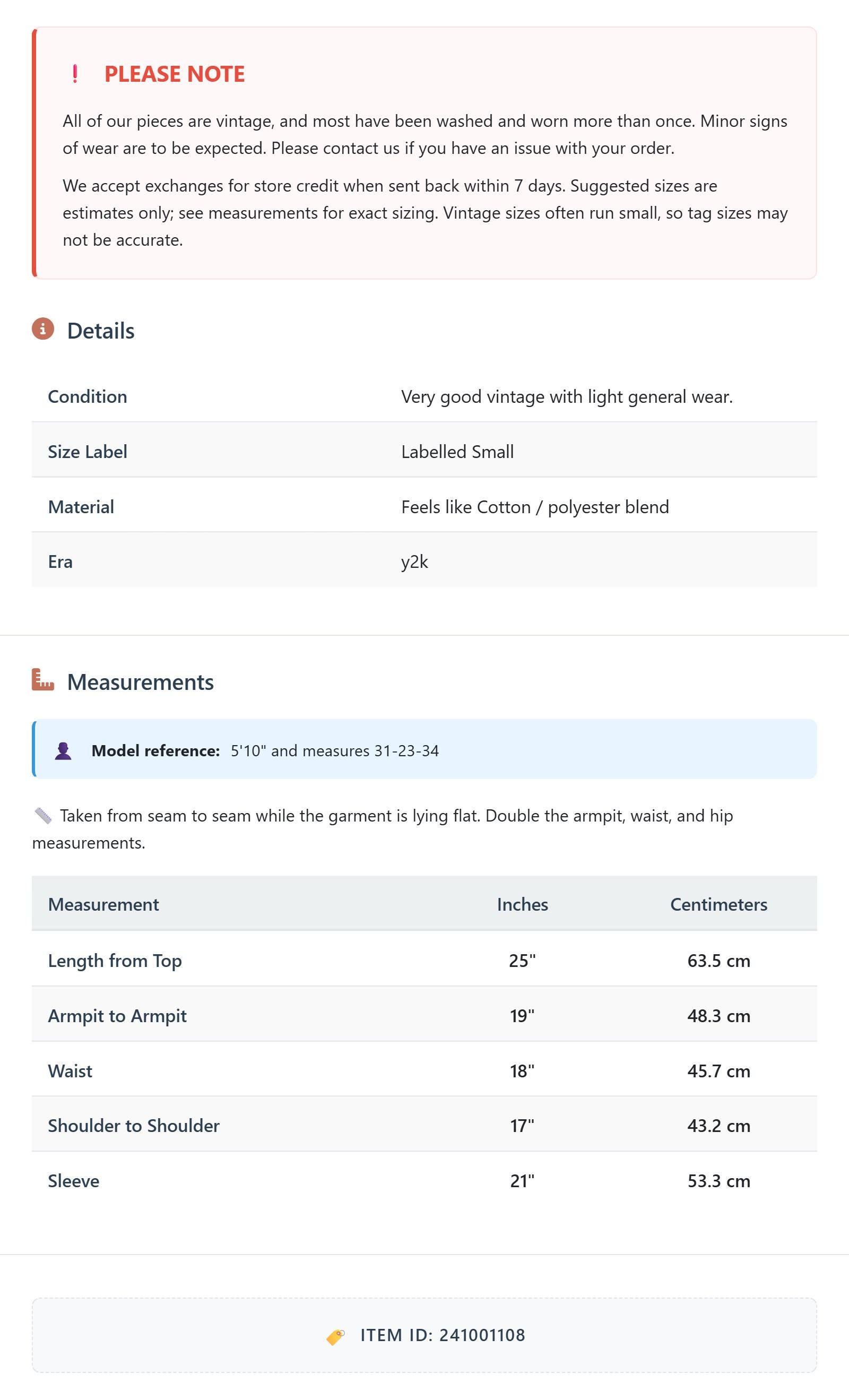 All of our pieces are vintage, and most have been washed and worn more than once. Minor signs of wear are to be expected. Please contact us if you have an issue with your order. We accept exchanges for store credit when sent back within 7 days.