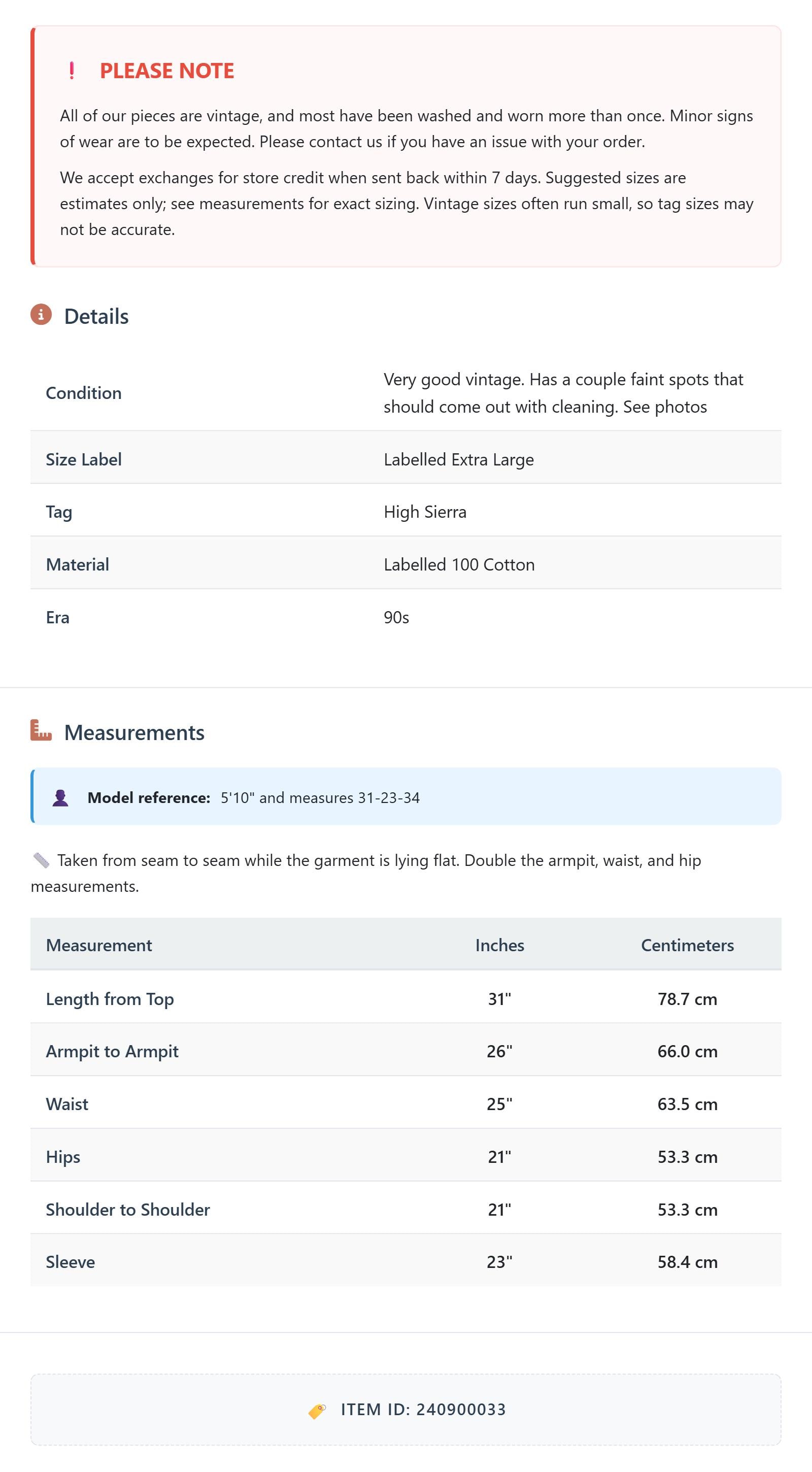 All of our pieces are vintage, and most have been washed and worn more than once. Minor signs of wear are to be expected. Please contact us if you have an issue with your order. We accept exchanges for store credit when sent back within 7 days.