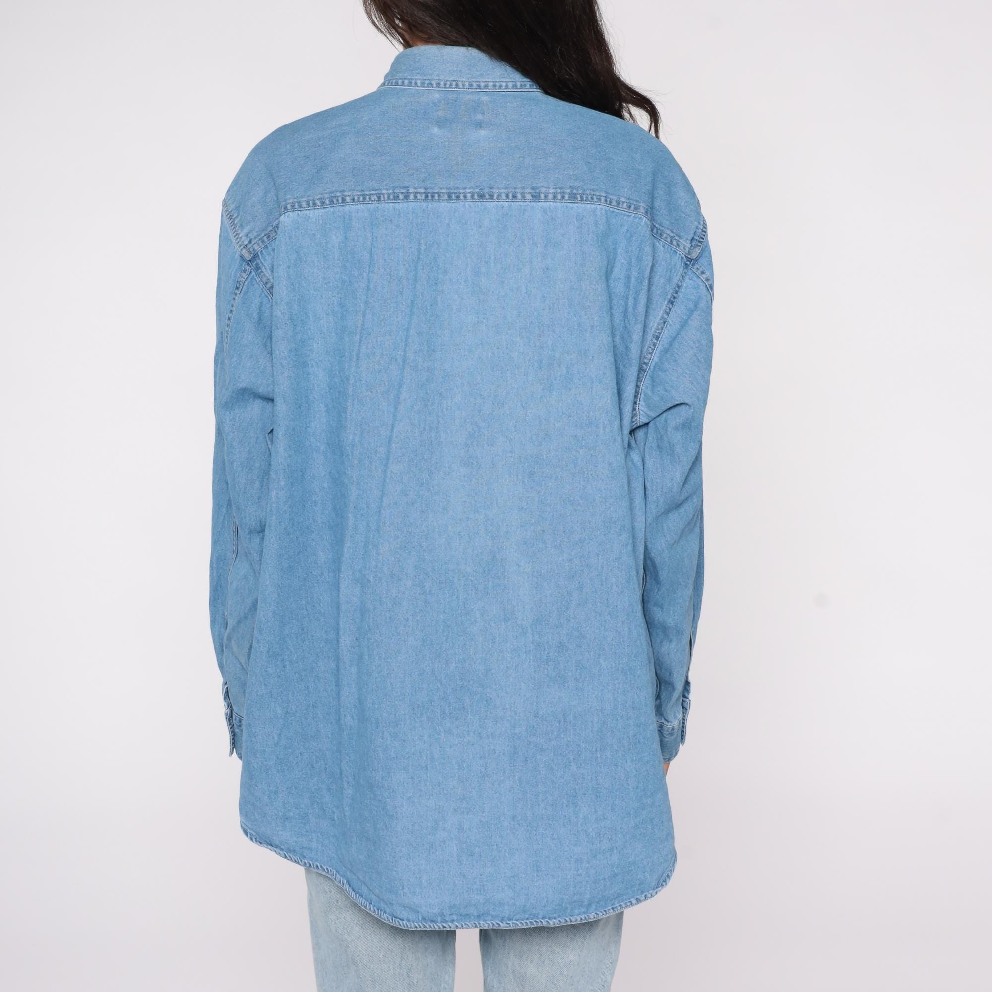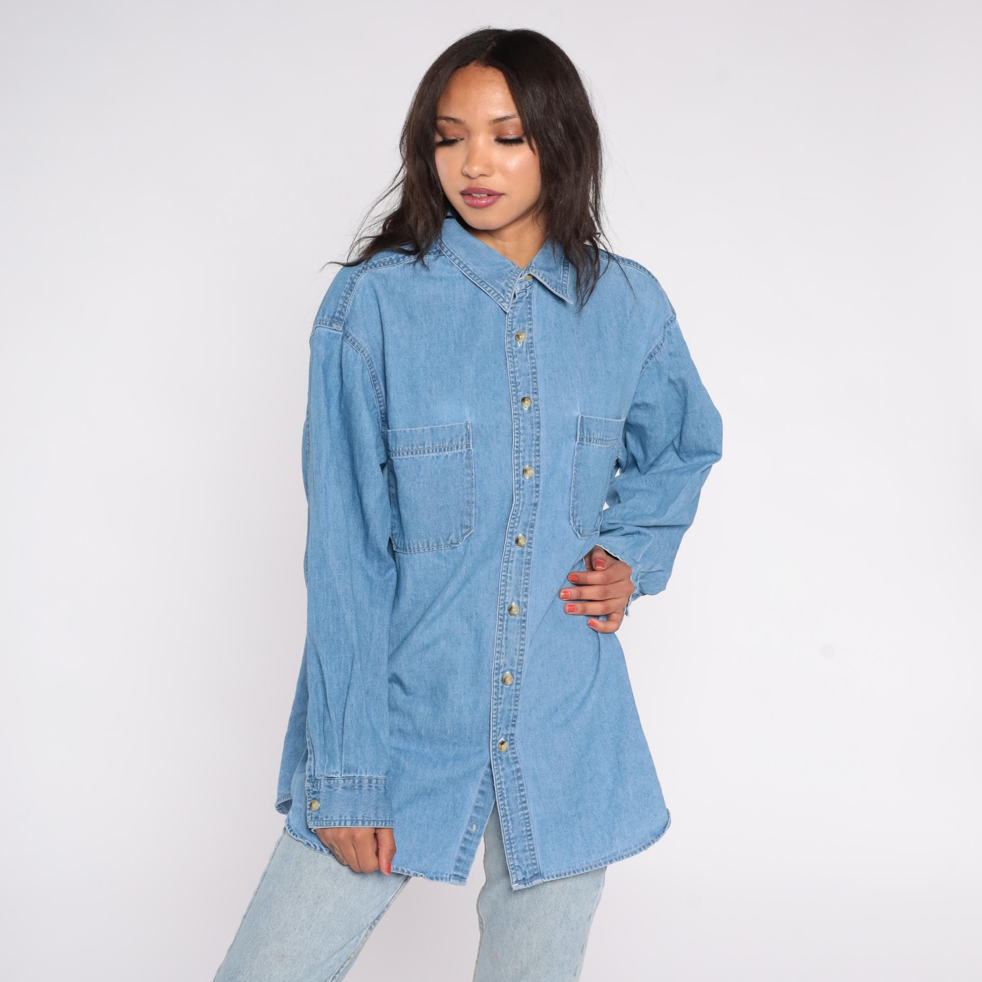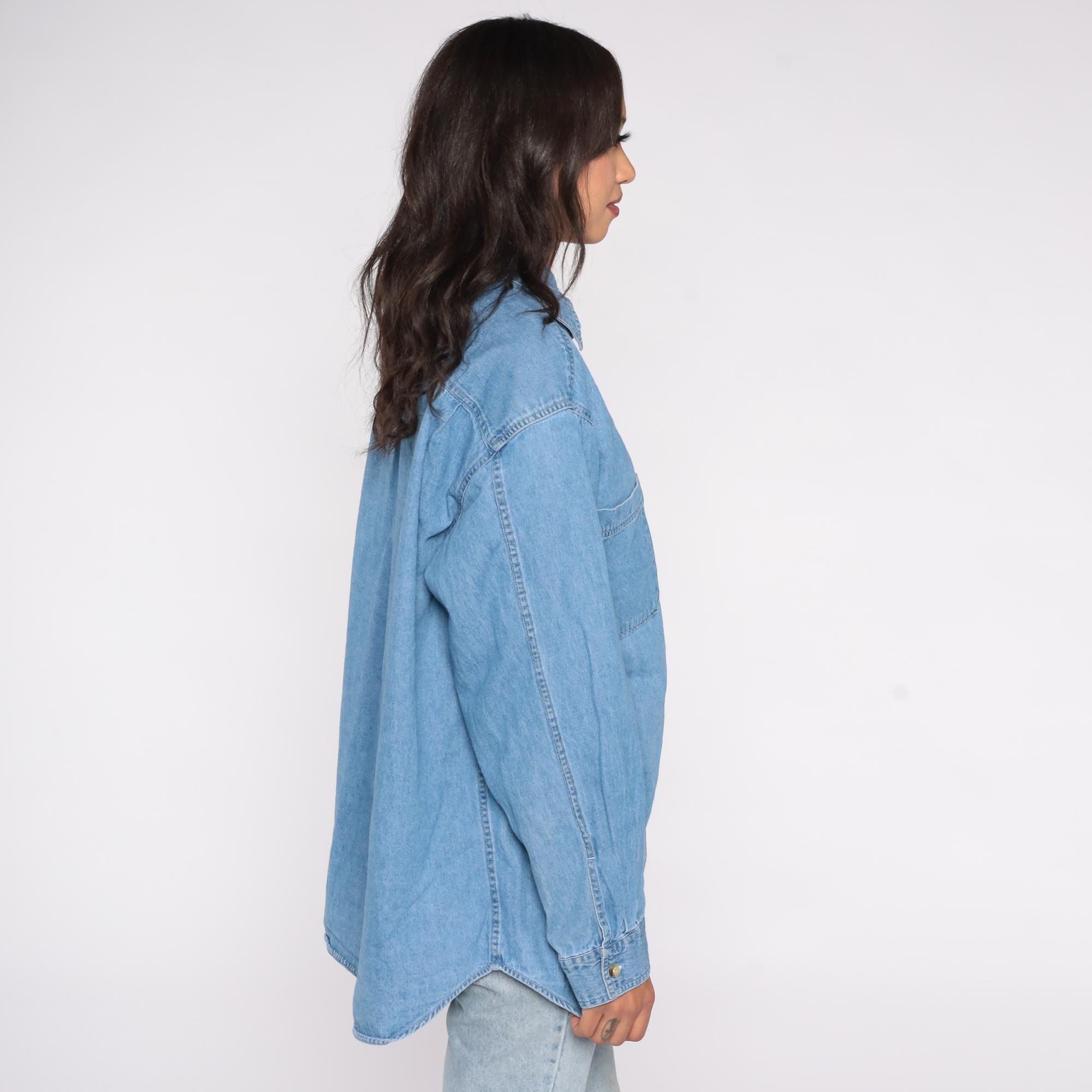 90s High Sierra denim shirt features a classic medium wash in 100% cotton. The oversized button-down has a relaxed fit with dropped shoulders and two front chest pockets. Details include traditional point collar, full button front with pearlized buttons, and adjustable button cuffs.