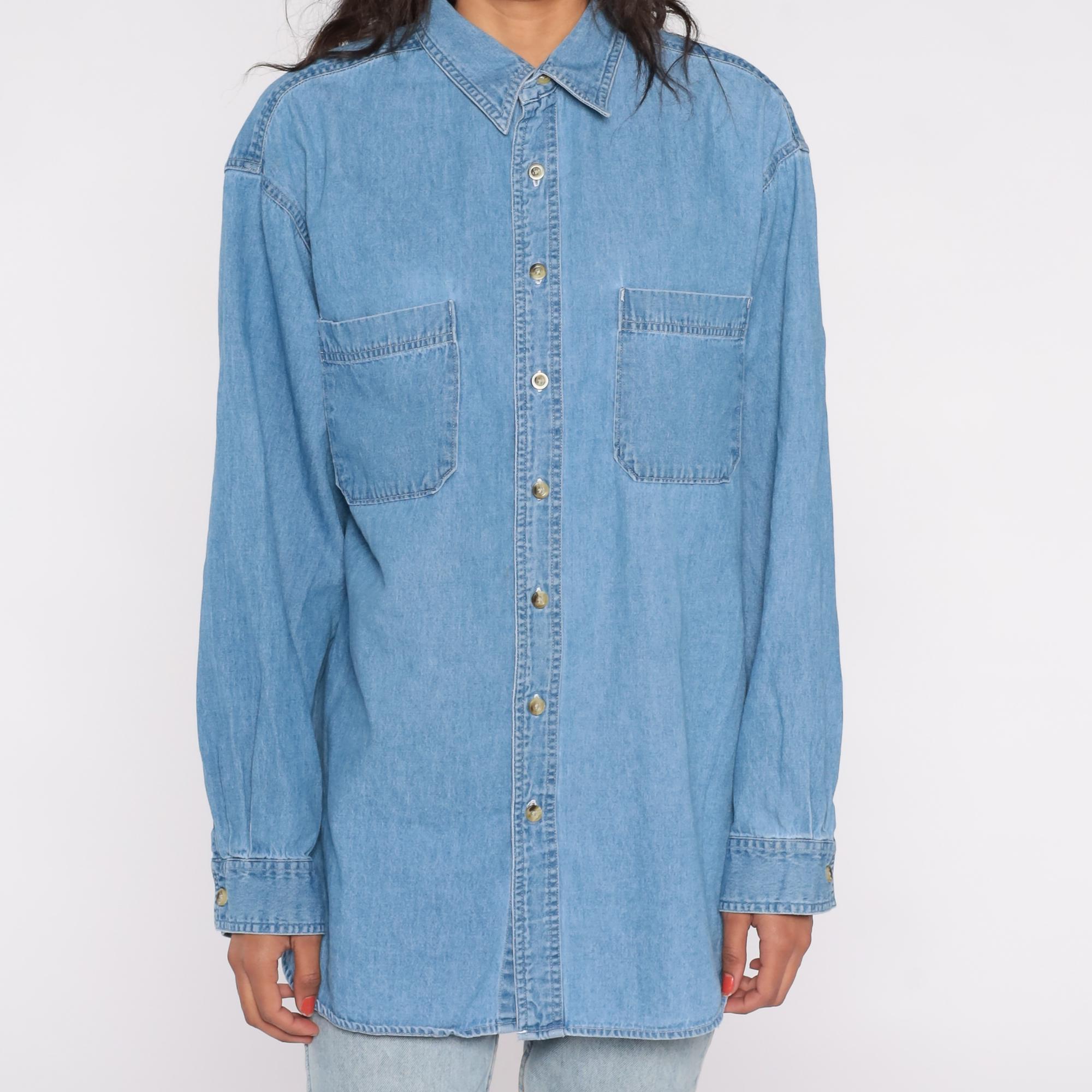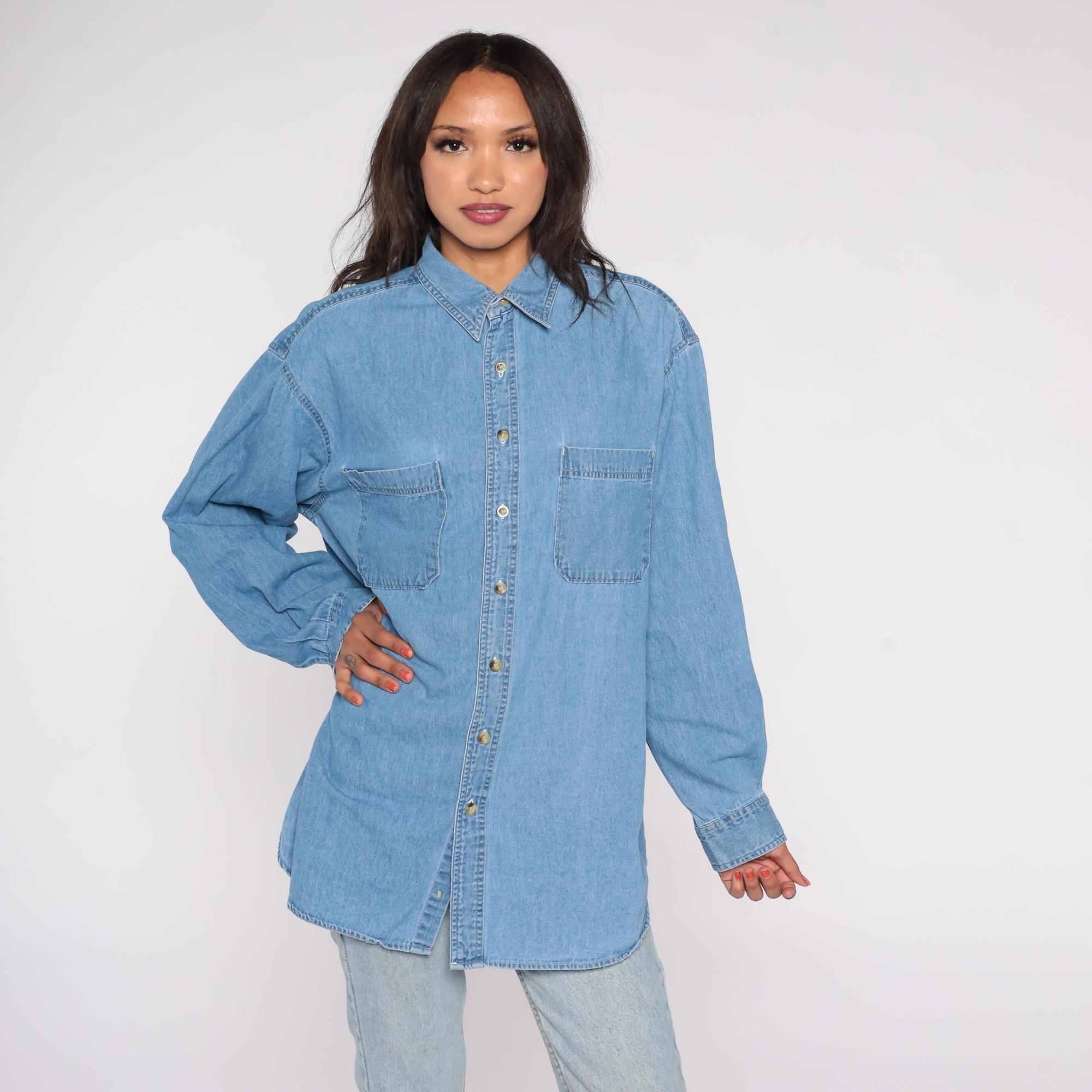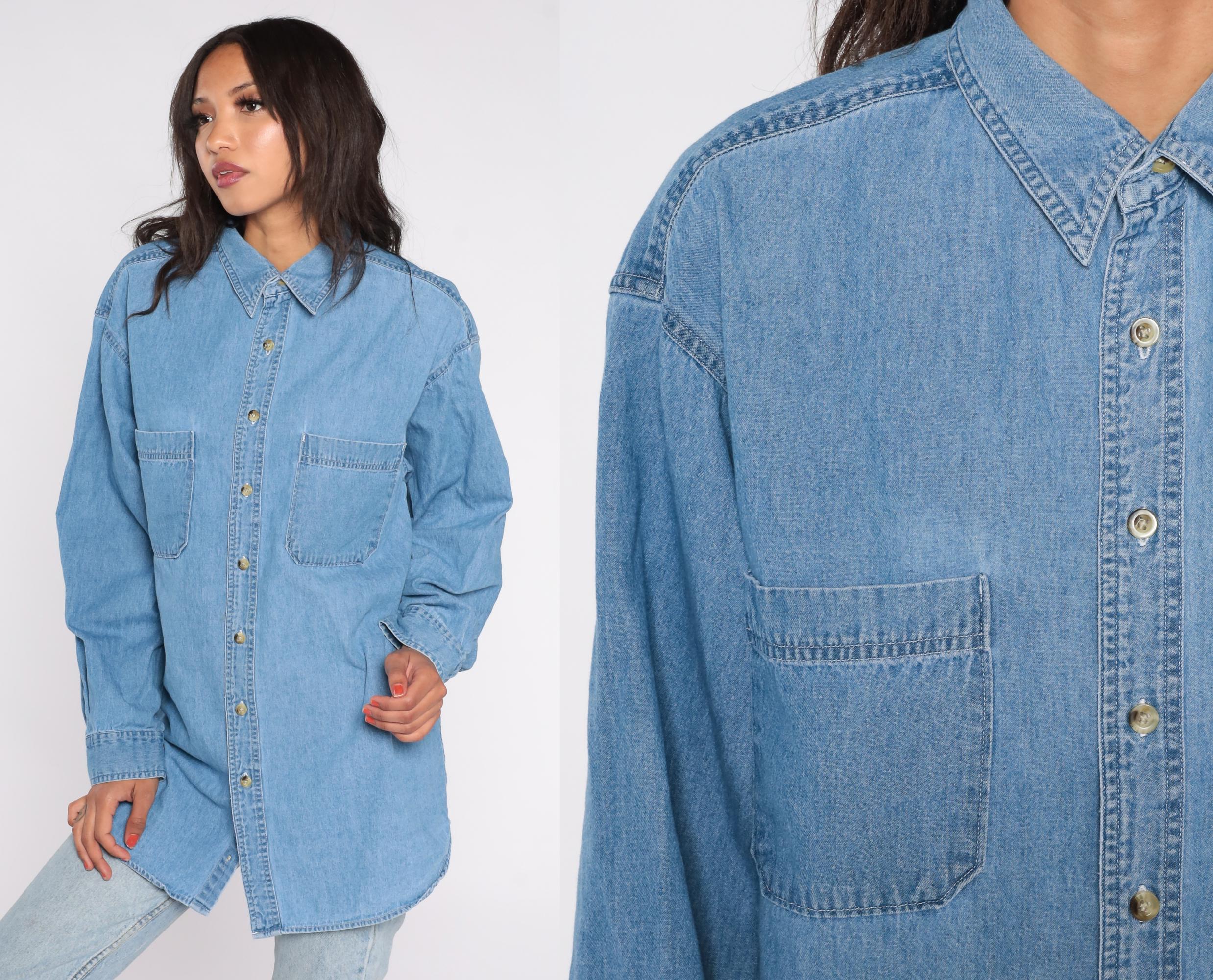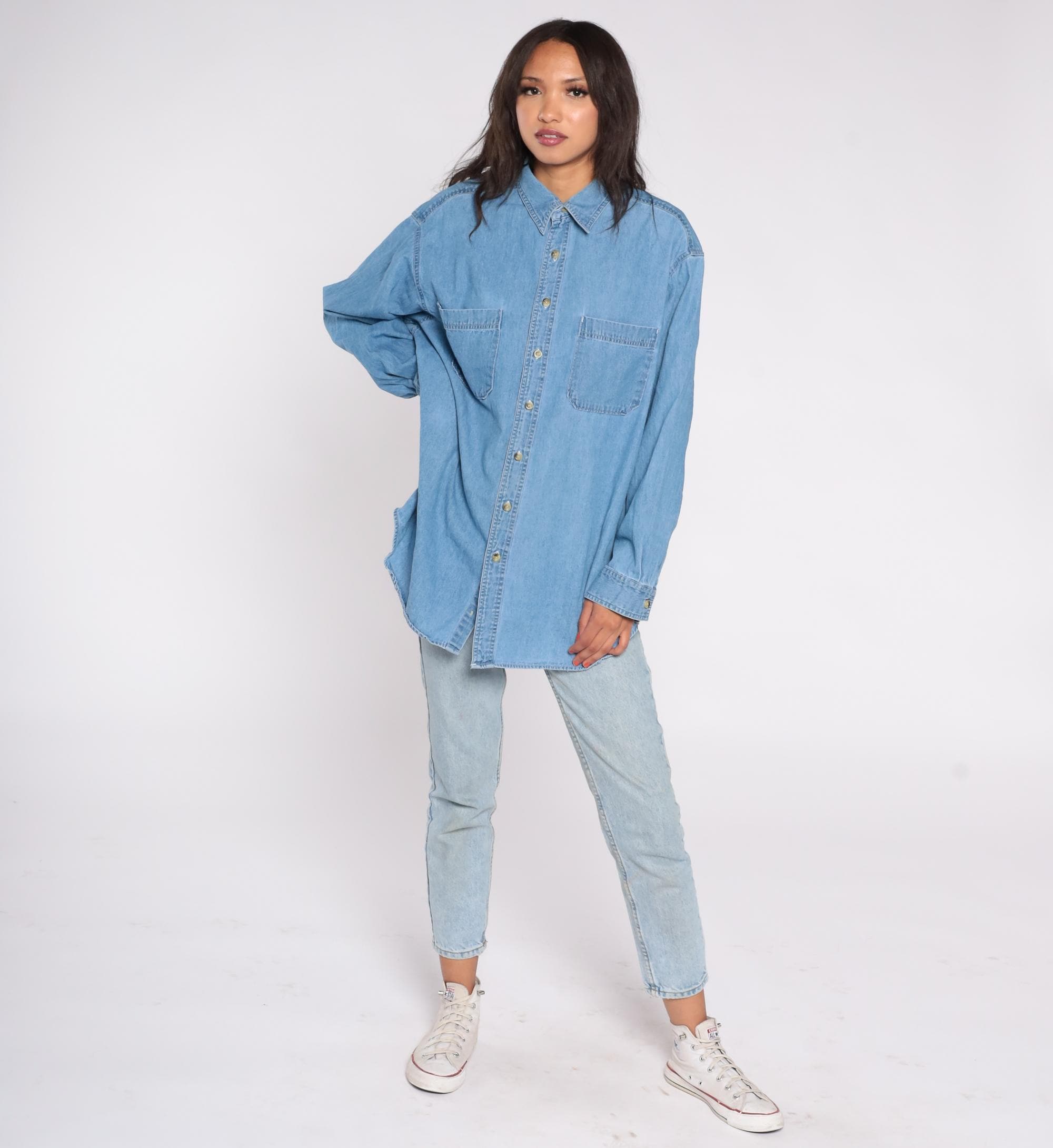 90s High Sierra denim shirt features a classic medium wash in 100% cotton. The oversized button-down has a relaxed fit with dropped shoulders and two front chest pockets. Details include traditional point collar, full button front with pearlized buttons, and adjustable button cuffs.