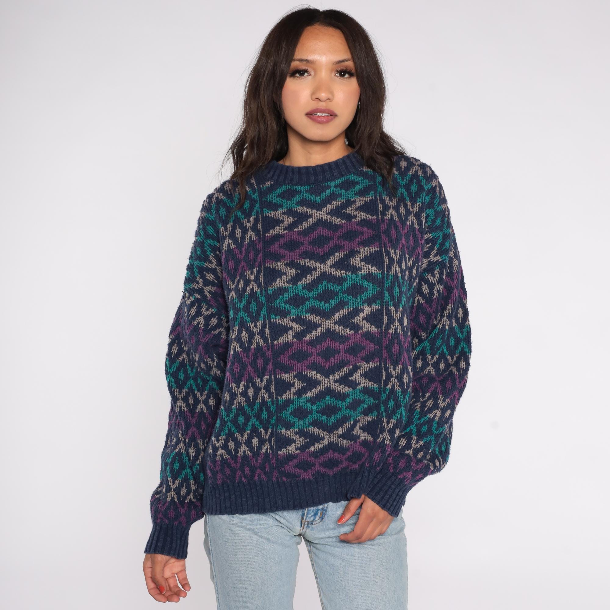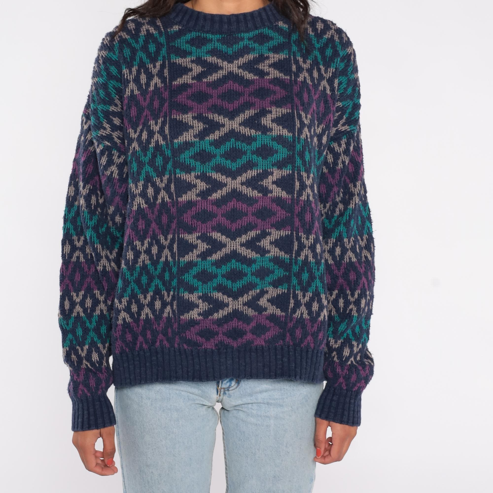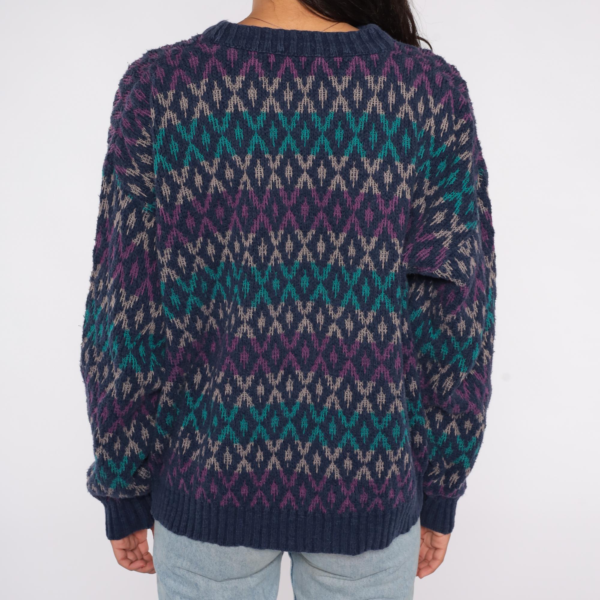 90s sweater features a striking geometric diamond pattern in navy blue, teal green, and purple with tan accents. Made by Patrick James, known as a "Purveyor to Gentlemen," this high-quality 100% cotton sweater offers both style and comfort. The classic crewneck design with ribbed collar, cuffs, and hem provides a timeless silhouette.