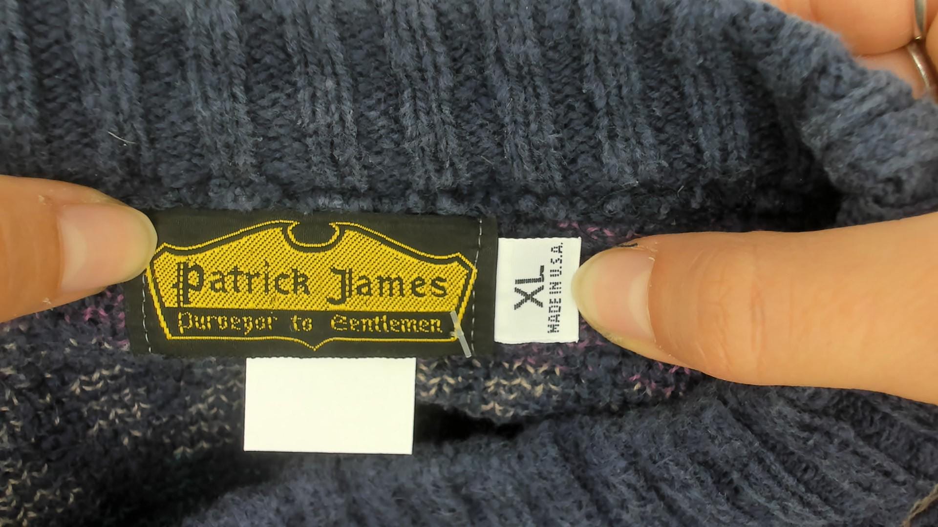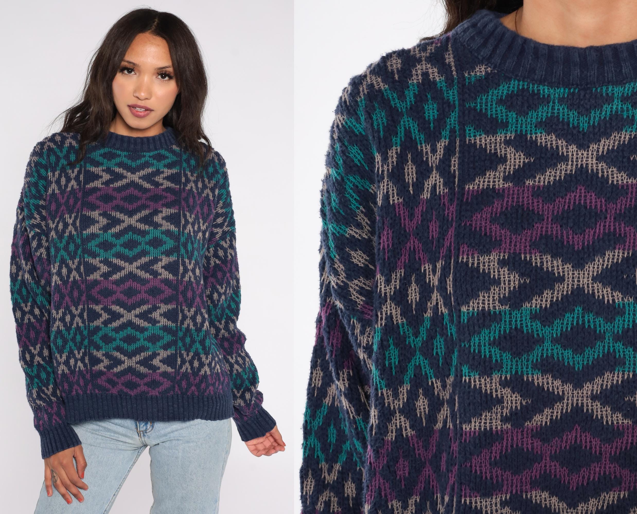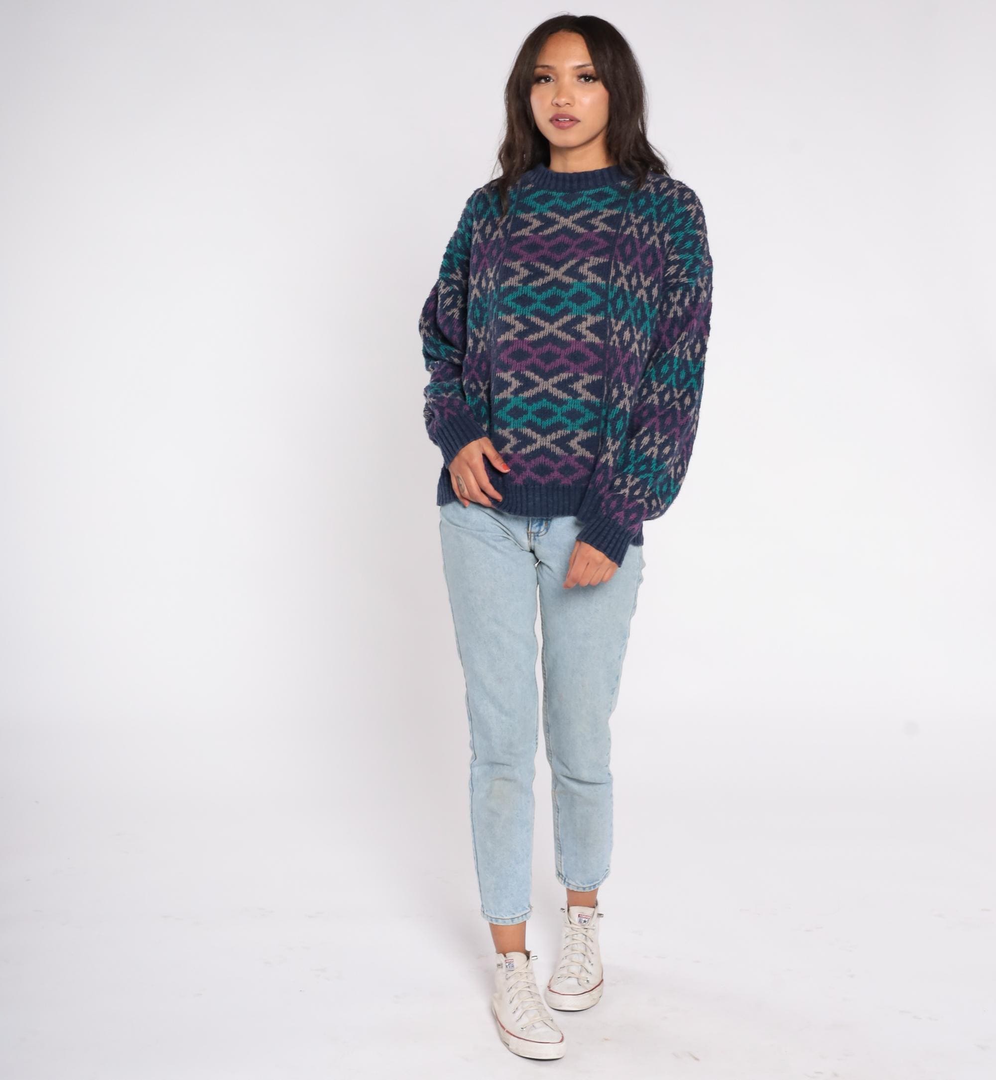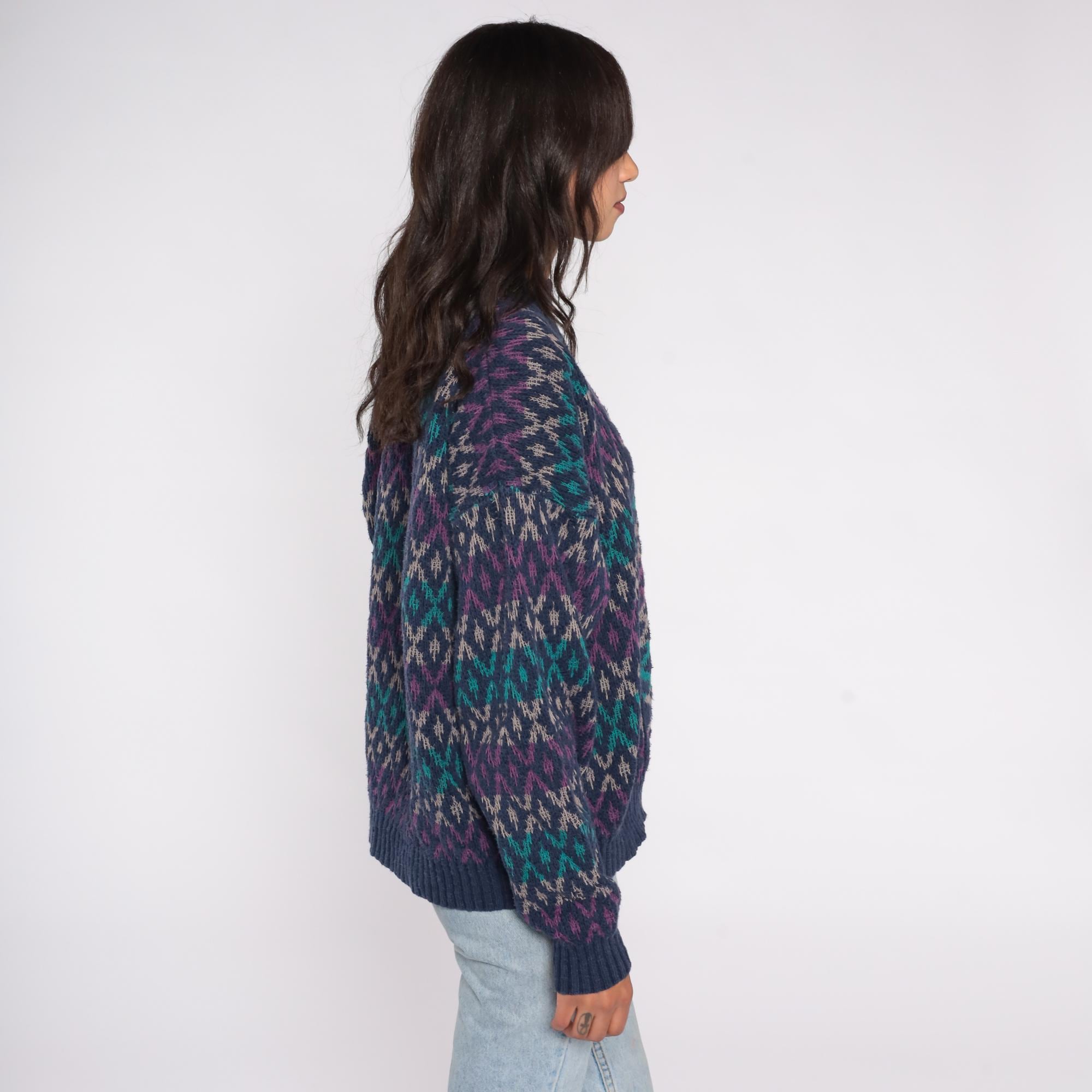 90s sweater features a striking geometric diamond pattern in navy blue, teal green, and purple with tan accents. Made by Patrick James, known as a "Purveyor to Gentlemen," this high-quality 100% cotton sweater offers both style and comfort. The classic crewneck design with ribbed collar, cuffs, and hem provides a timeless silhouette.