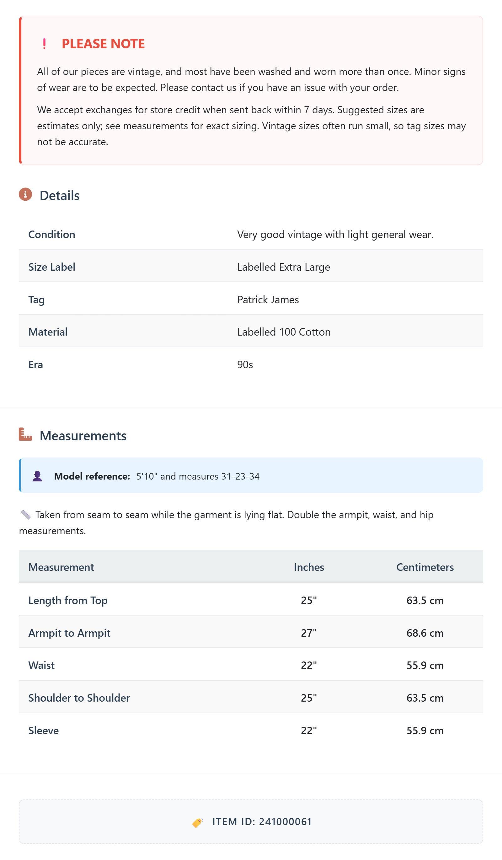 All of our pieces are vintage, and most have been washed and worn more than once. Minor signs of wear are to be expected. Please contact us if you have an issue with your order. We accept exchanges for store credit when sent back within 7 days.