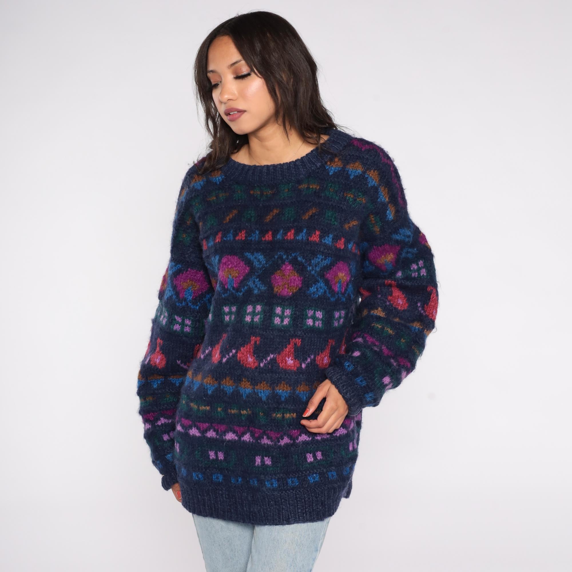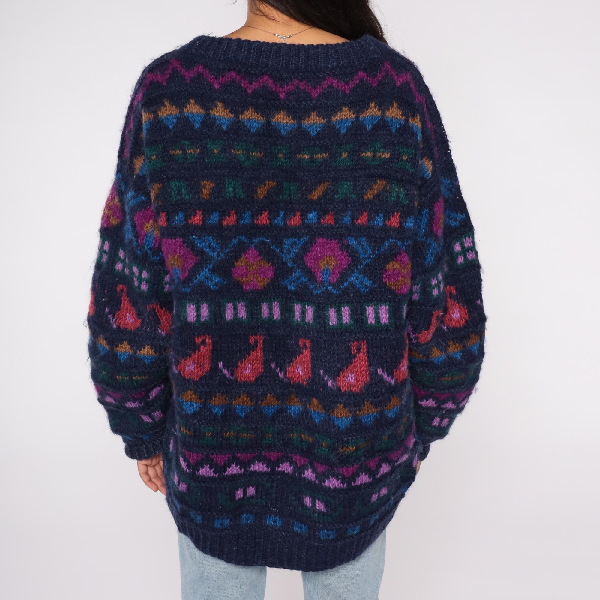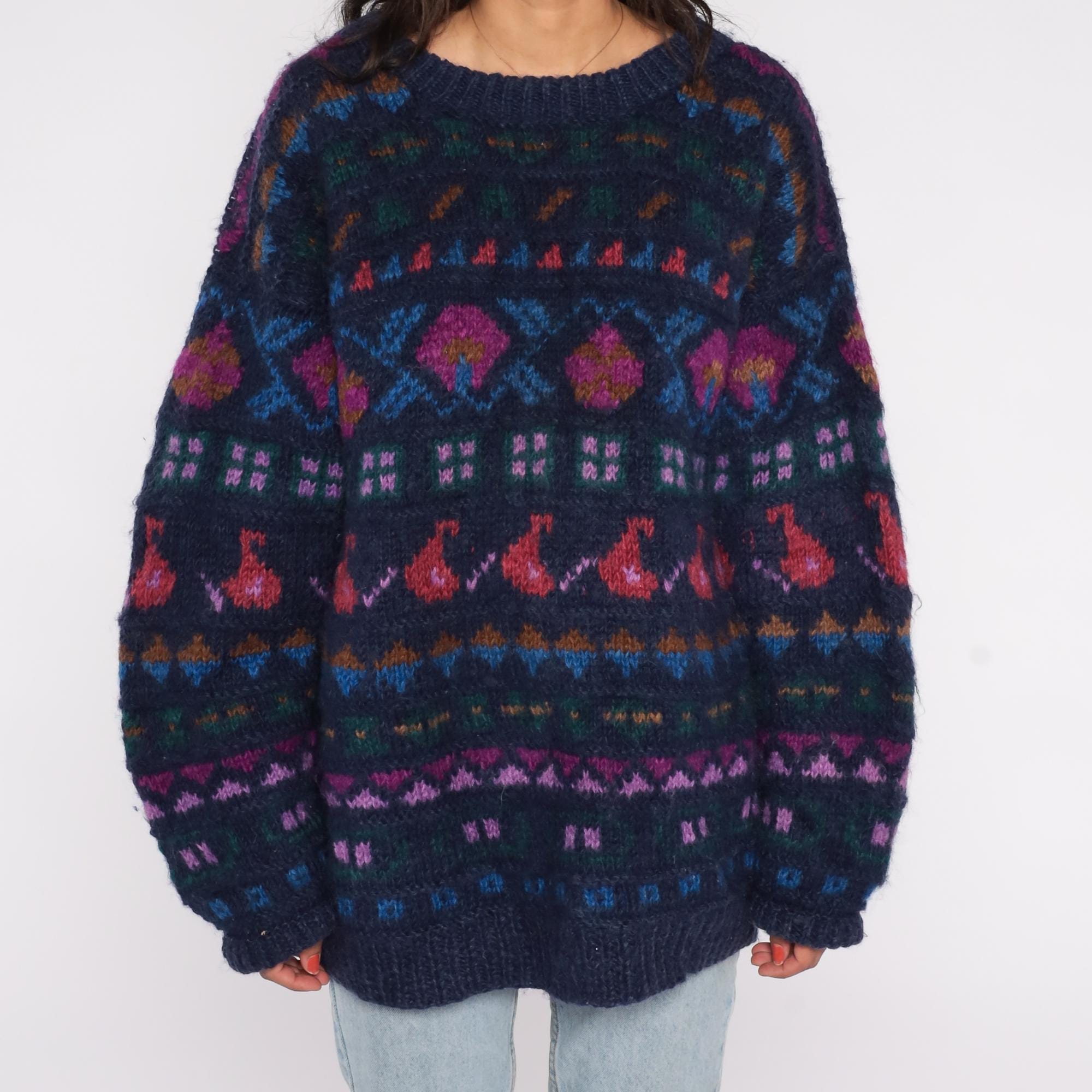 90s Ganesh Himal sweater hand knit in Nepal from 100% wool. Features a navy blue base with multicolor geometric Fair Isle pattern in shades of red, purple, green, and blue. Designed with a crew neckline, long sleeves, and ribbed cuffs and hem.