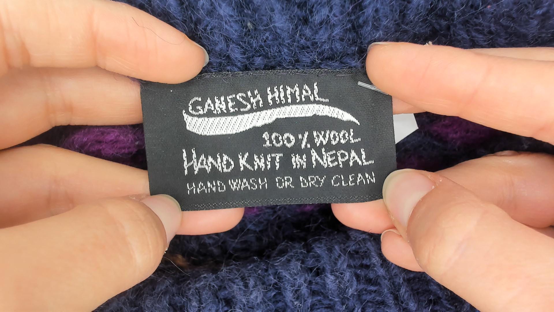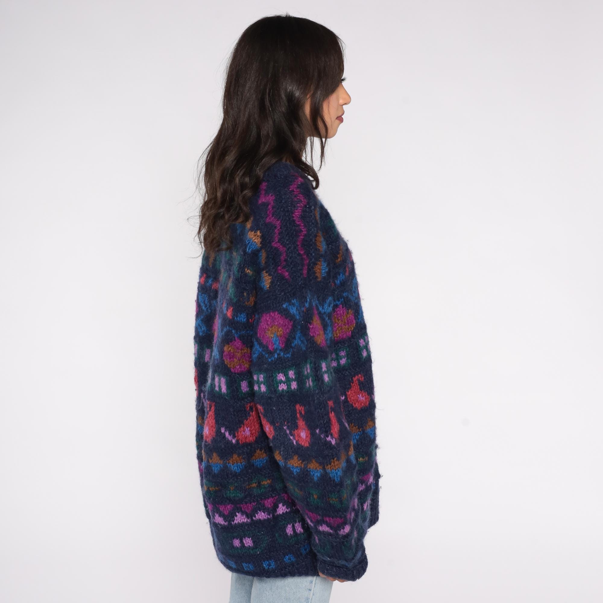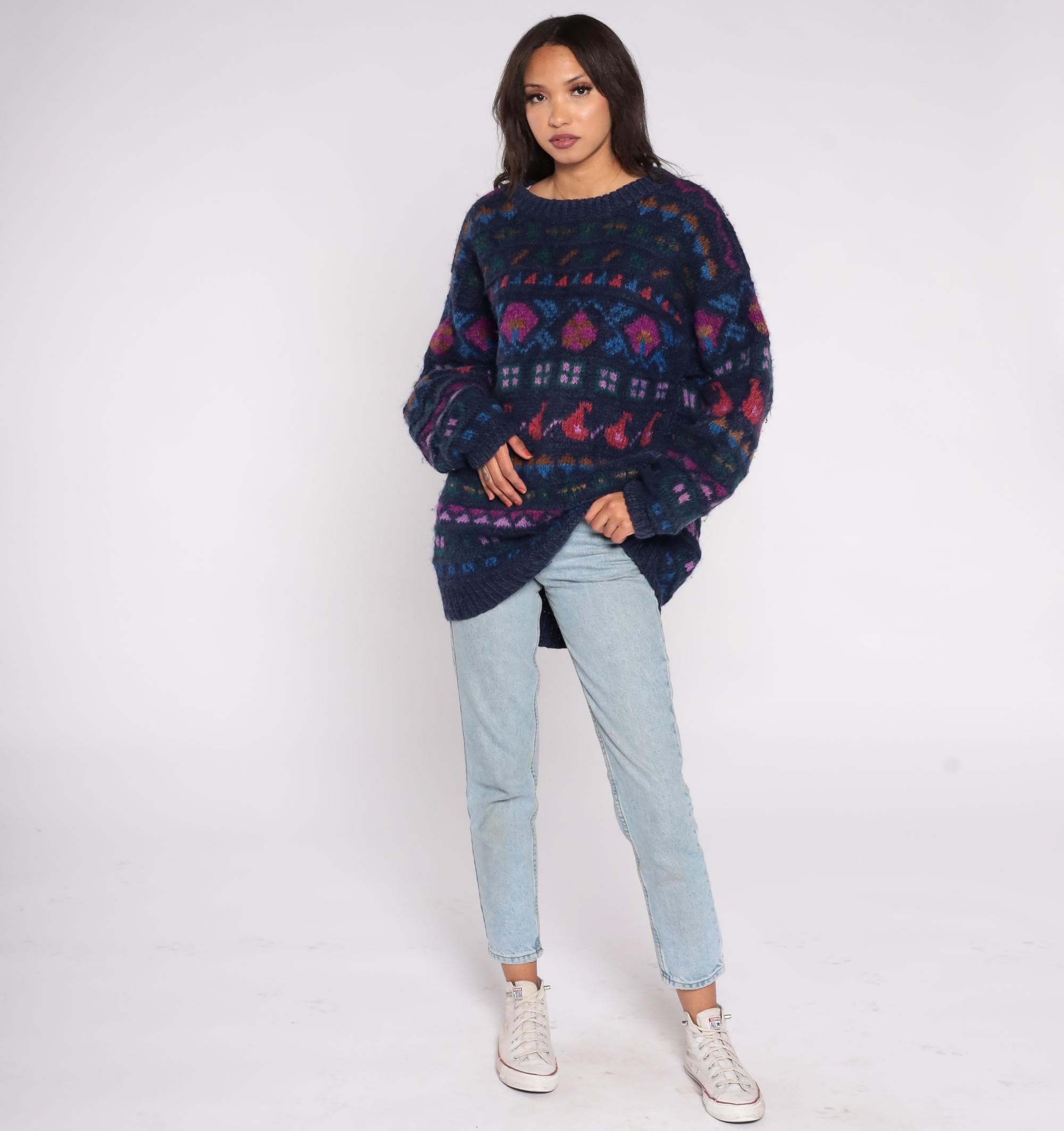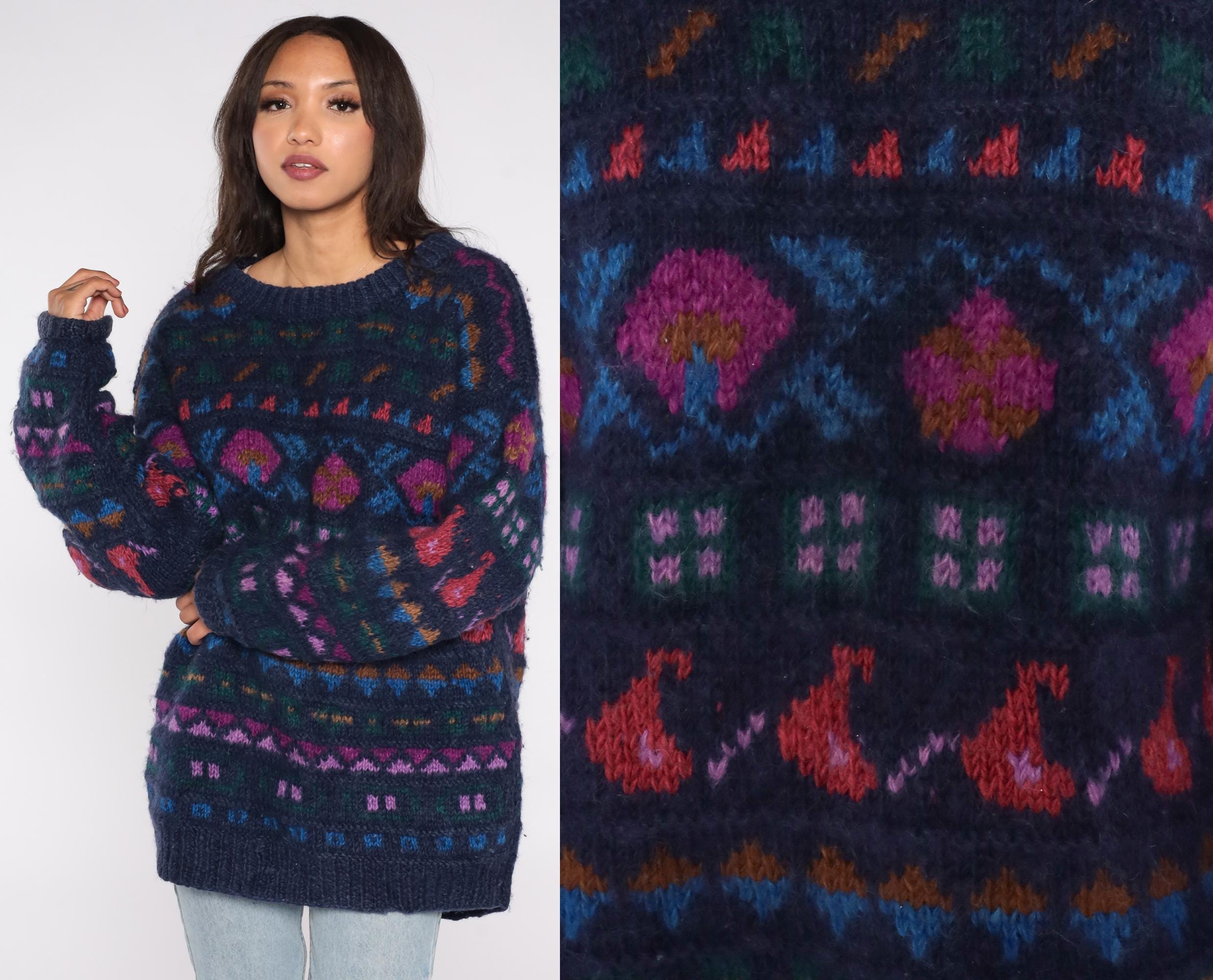 90s Ganesh Himal sweater hand knit in Nepal from 100% wool. Features a navy blue base with multicolor geometric Fair Isle pattern in shades of red, purple, green, and blue. Designed with a crew neckline, long sleeves, and ribbed cuffs and hem.