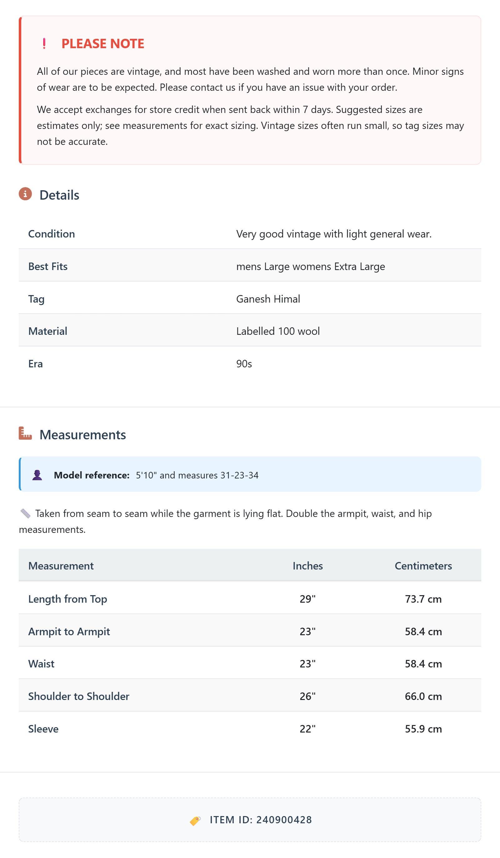 All of our pieces are vintage, and most have been washed and worn more than once. Minor signs of wear are to be expected. Please contact us if you have an issue with your order. We accept exchanges for store credit when sent back within 7 days.
