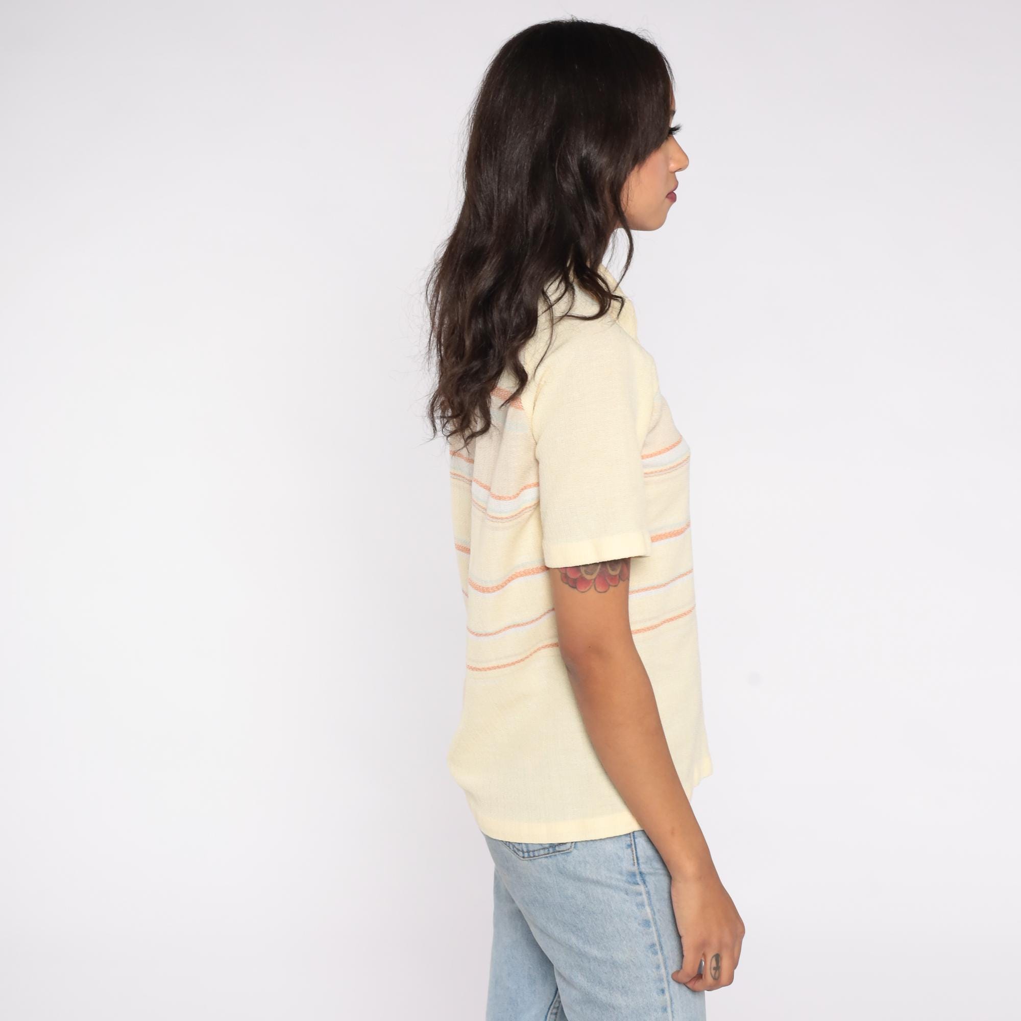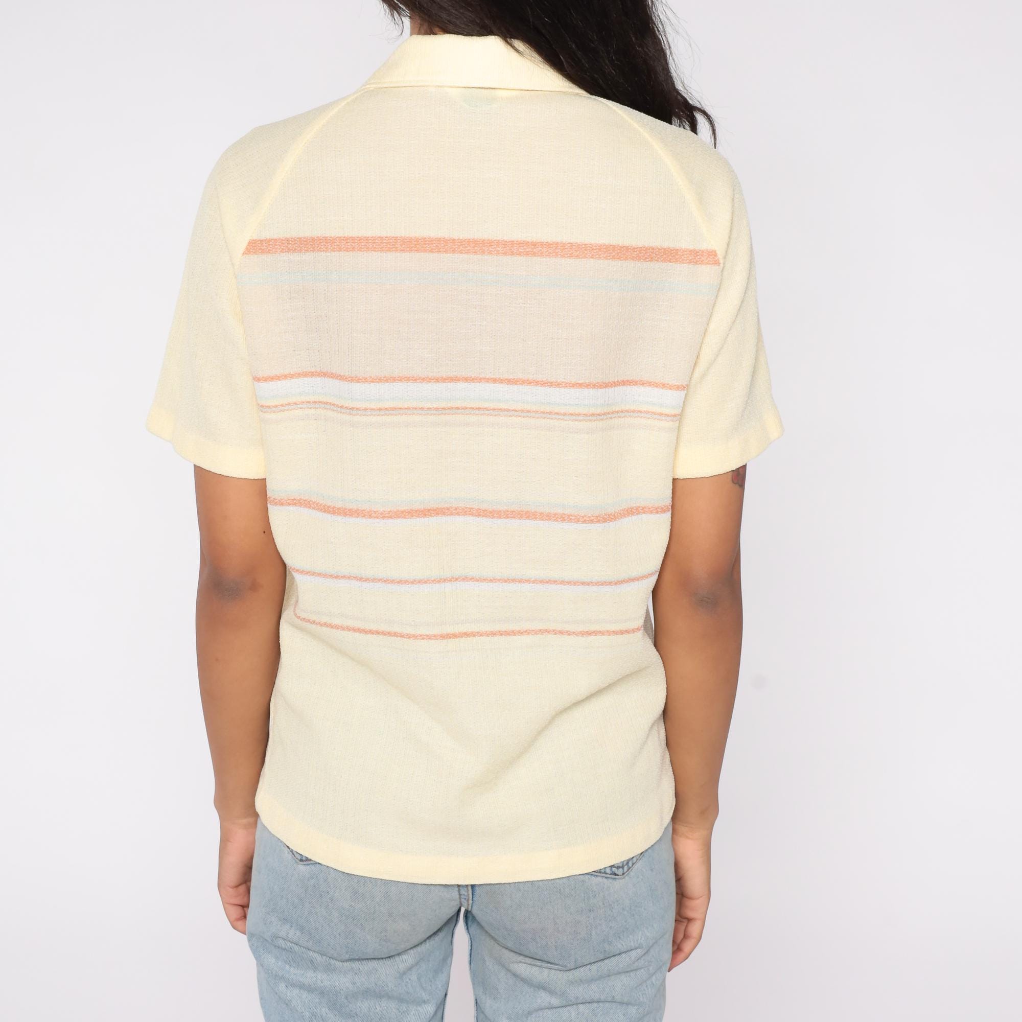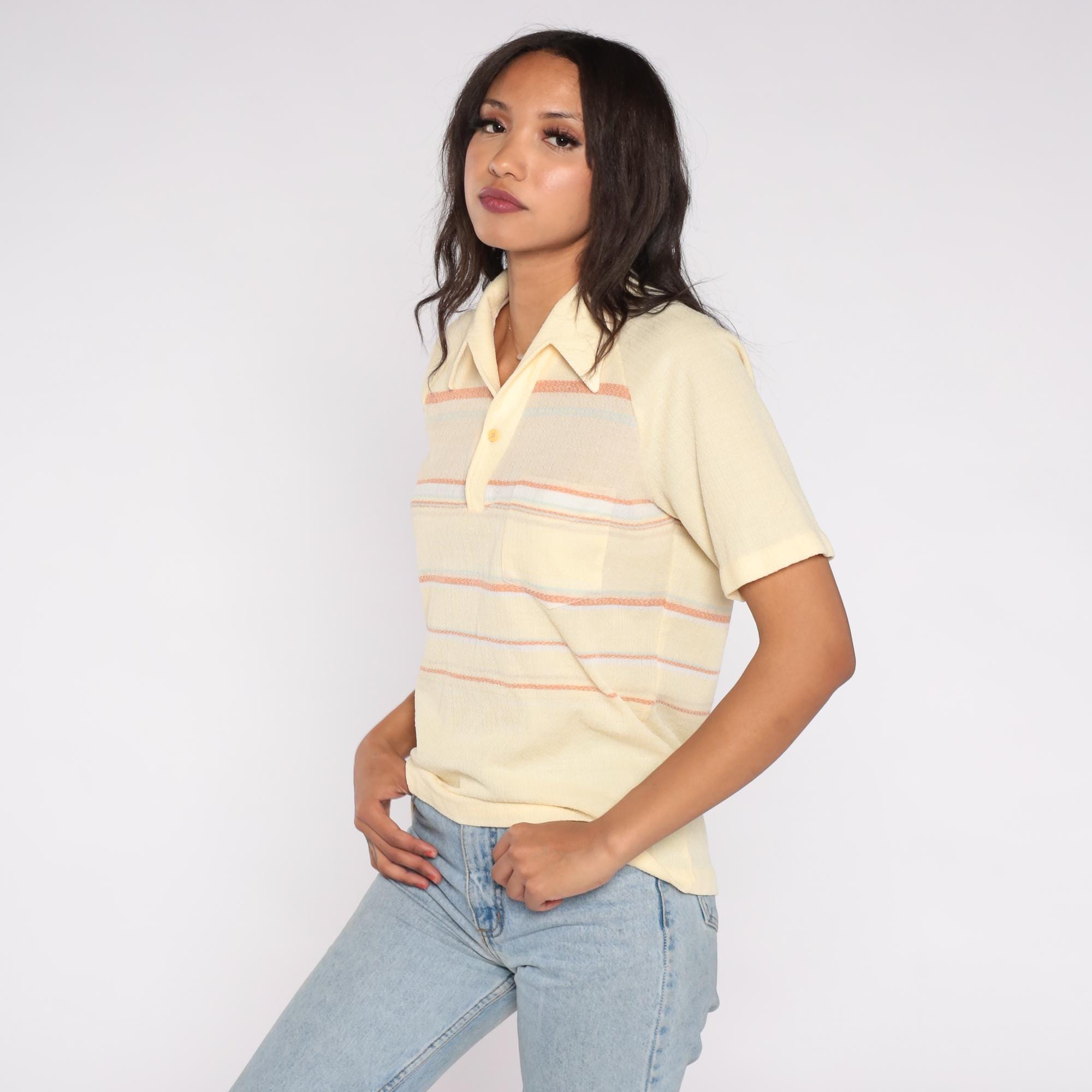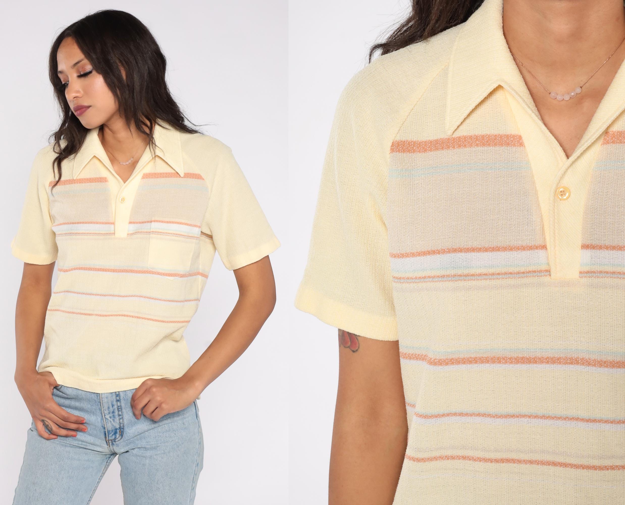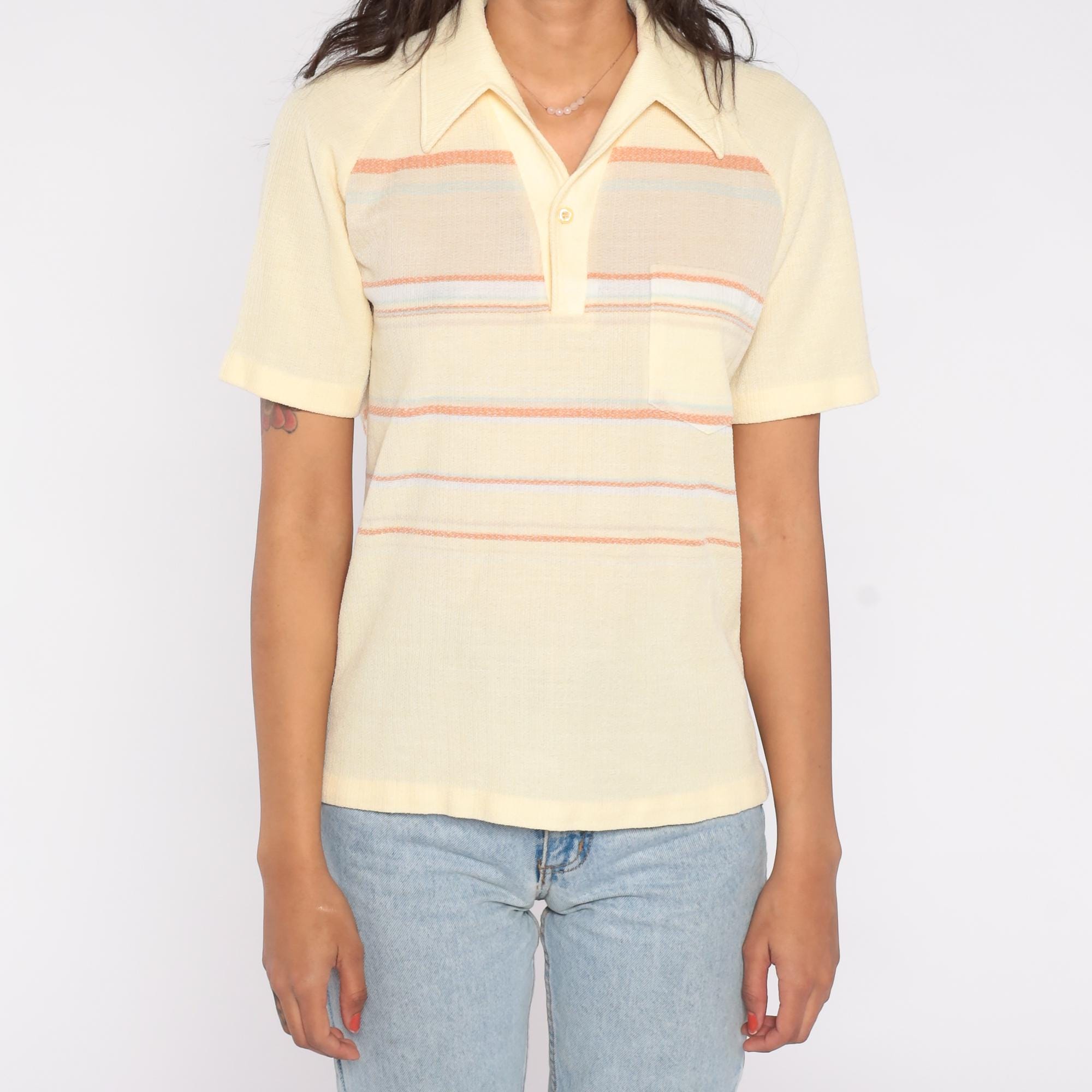 70s knit polo shirt by Charisma California in soft pastel yellow with orange, lavender, and pale blue horizontal stripes. Features a collared neckline with a single button placket, short sleeves, and a front chest pocket.