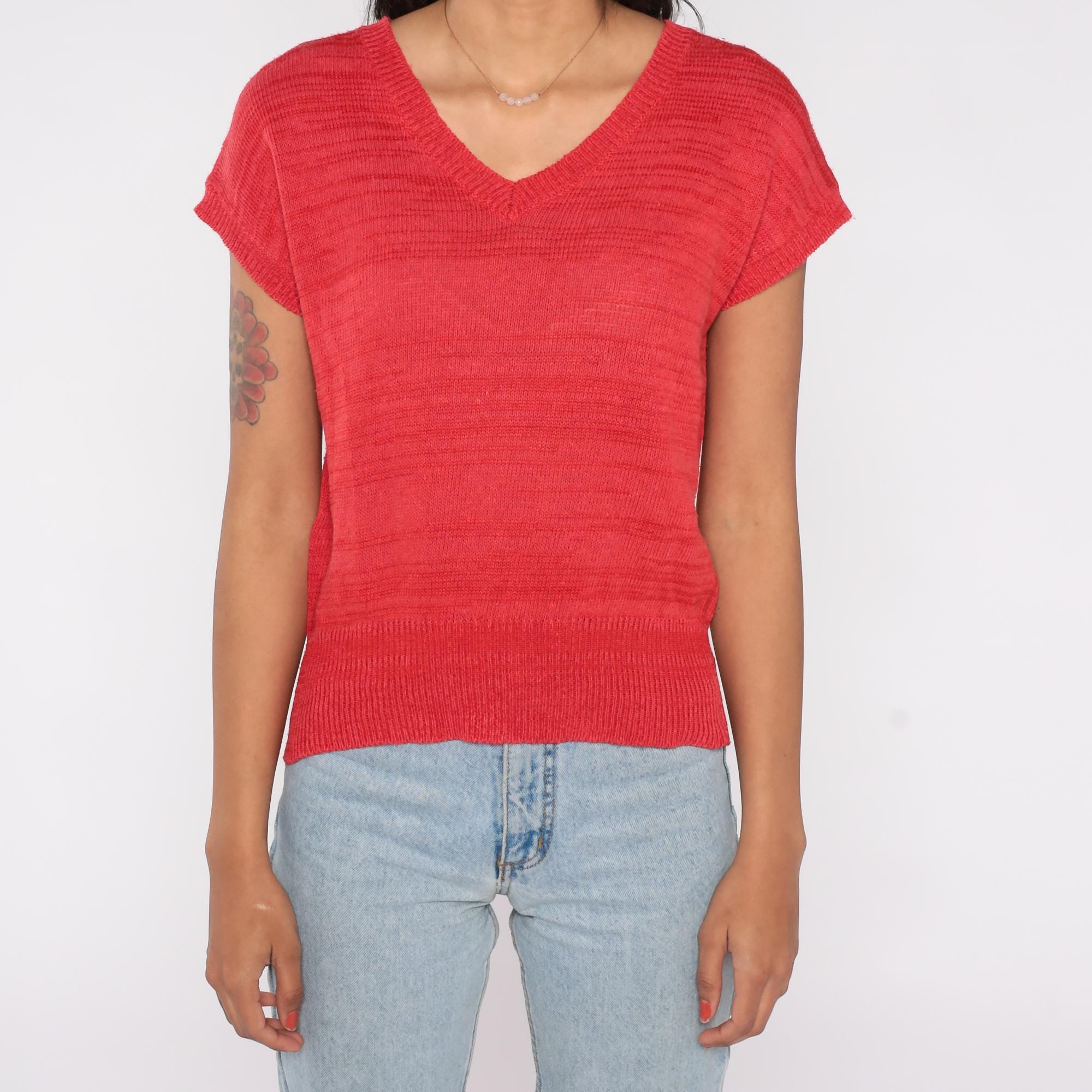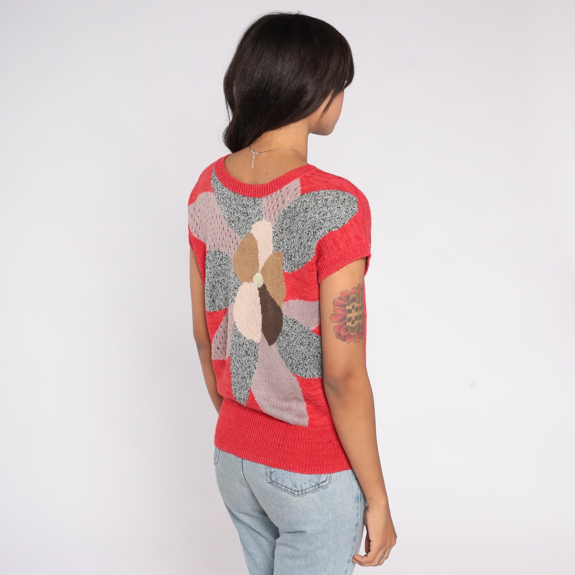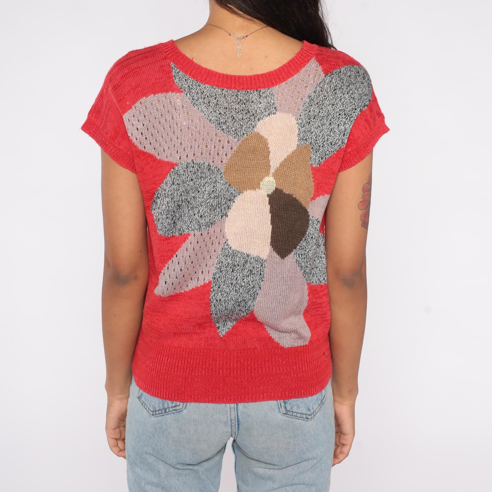 80s knit top in bright red featuring a large floral graphic on the back in shades of gray, tan, pink, and cream. Designed with a lightweight open-knit texture, short sleeves, and a ribbed hem.