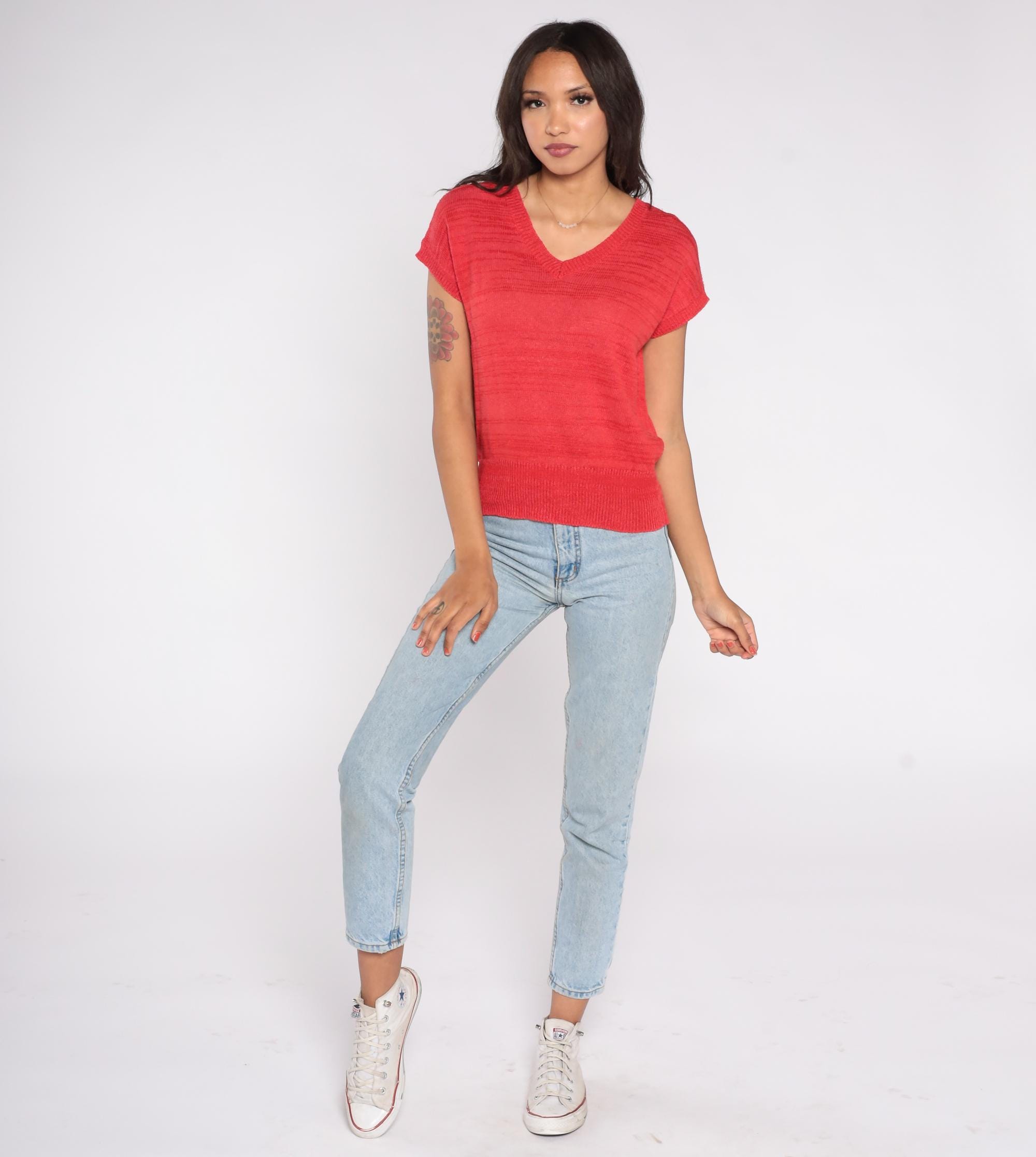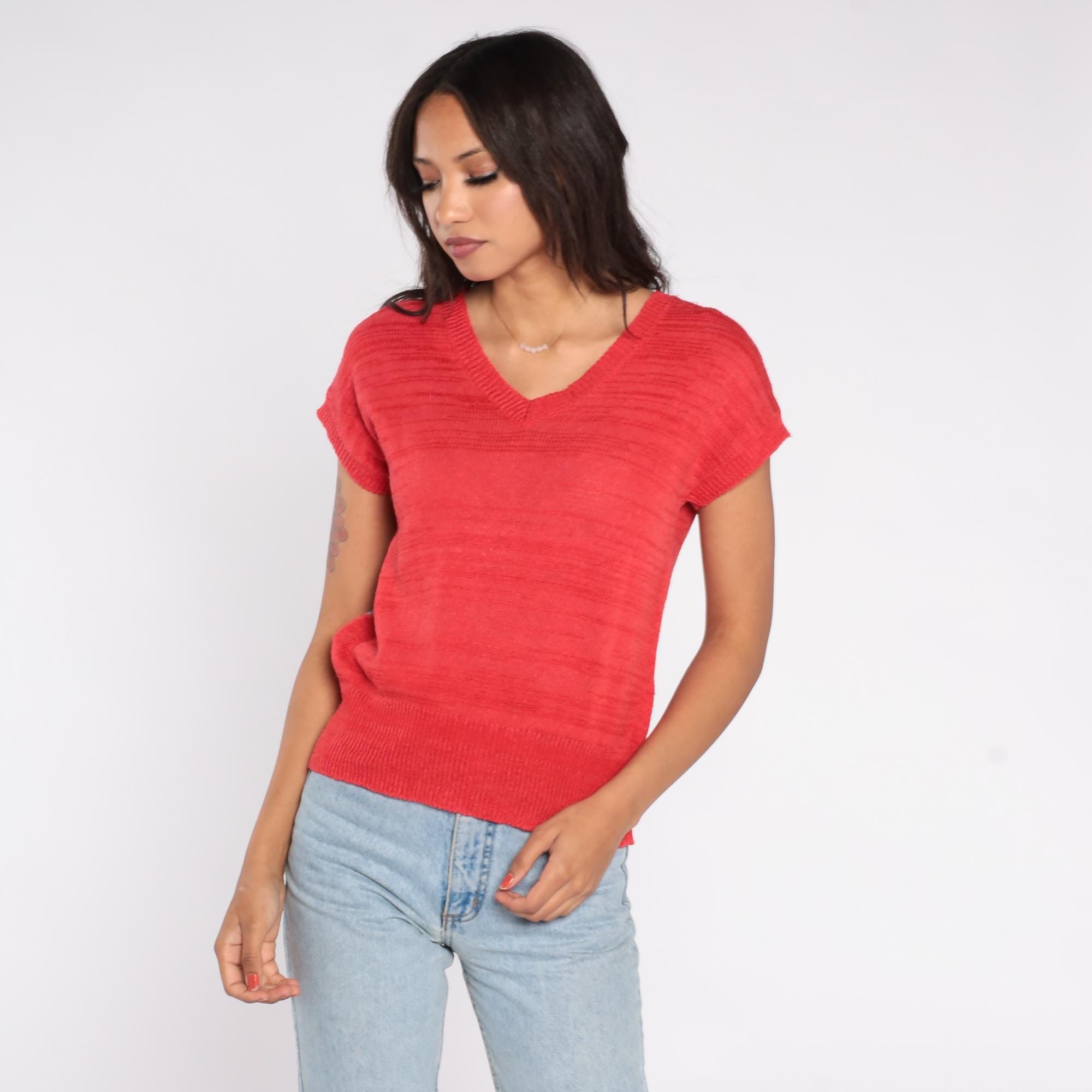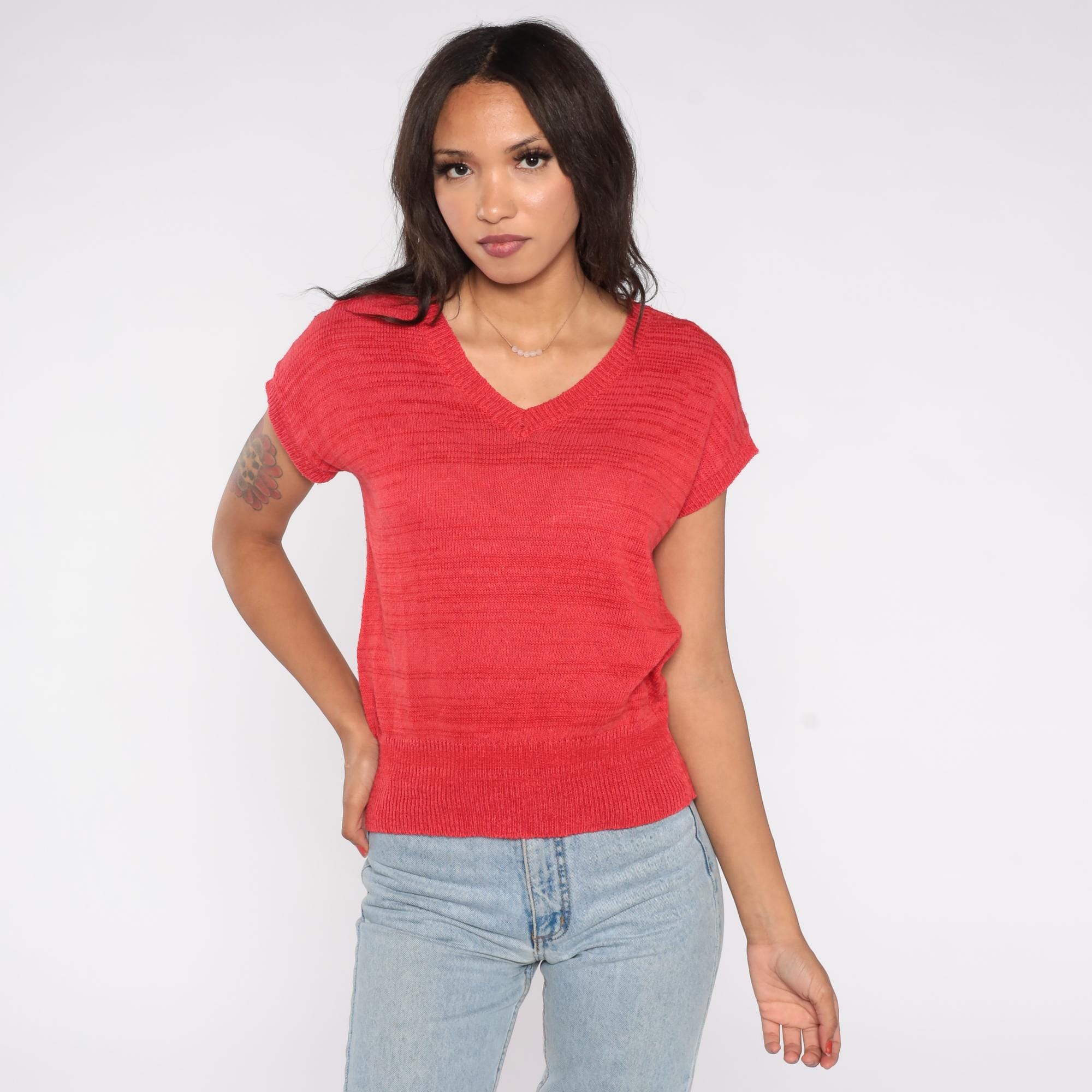 80s knit top in bright red featuring a large floral graphic on the back in shades of gray, tan, pink, and cream. Designed with a lightweight open-knit texture, short sleeves, and a ribbed hem.