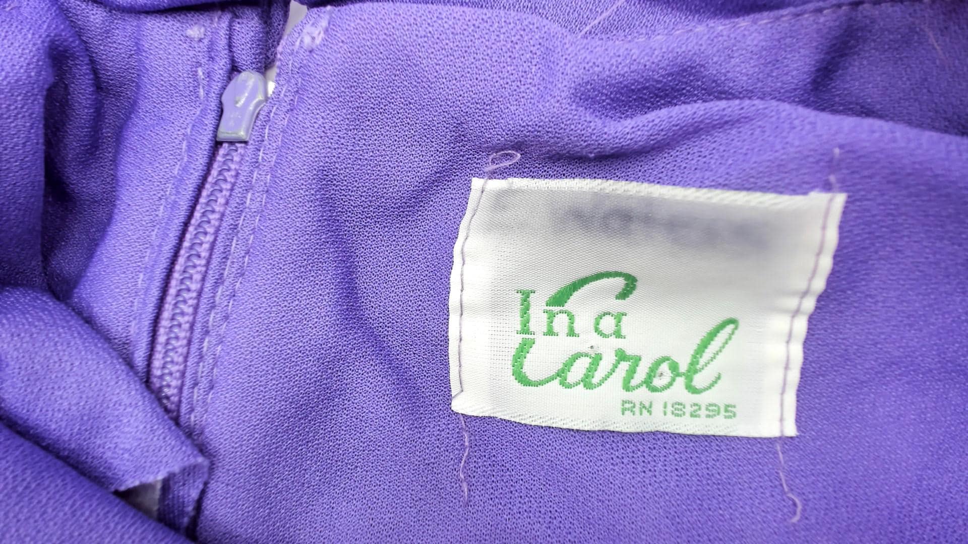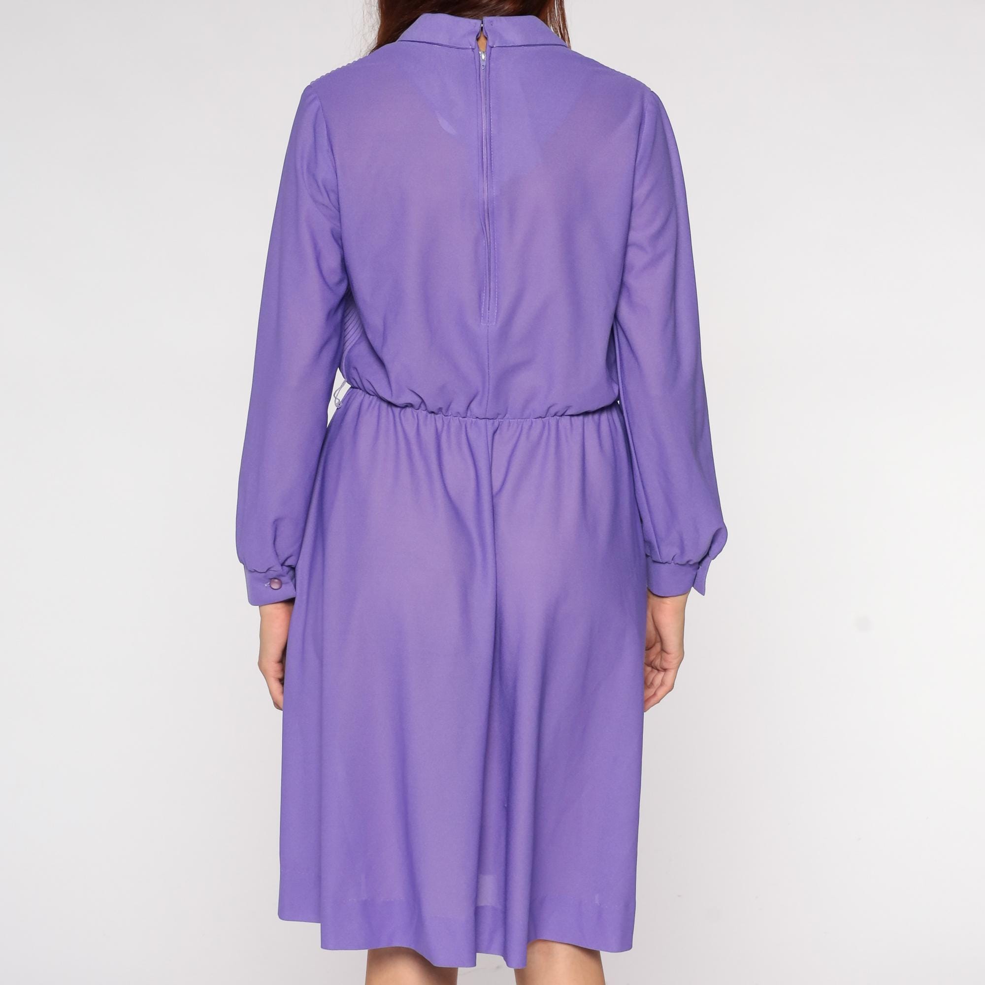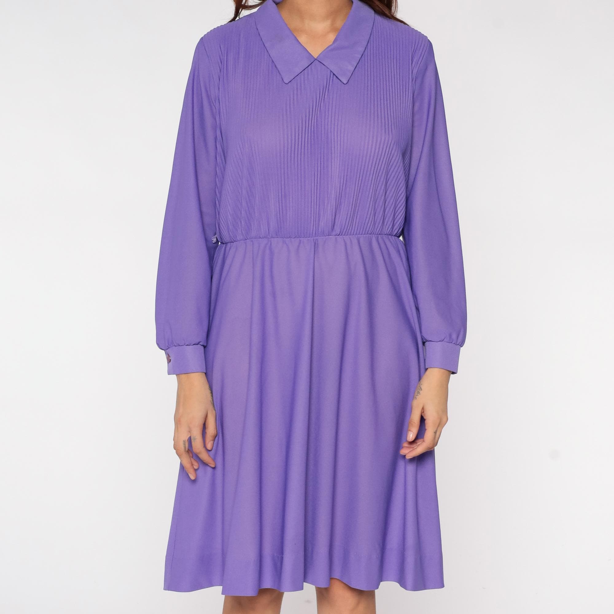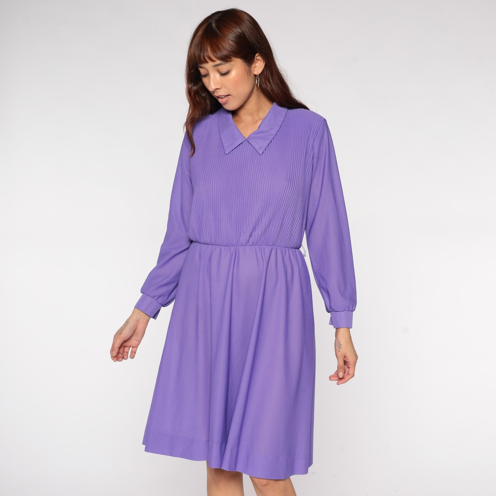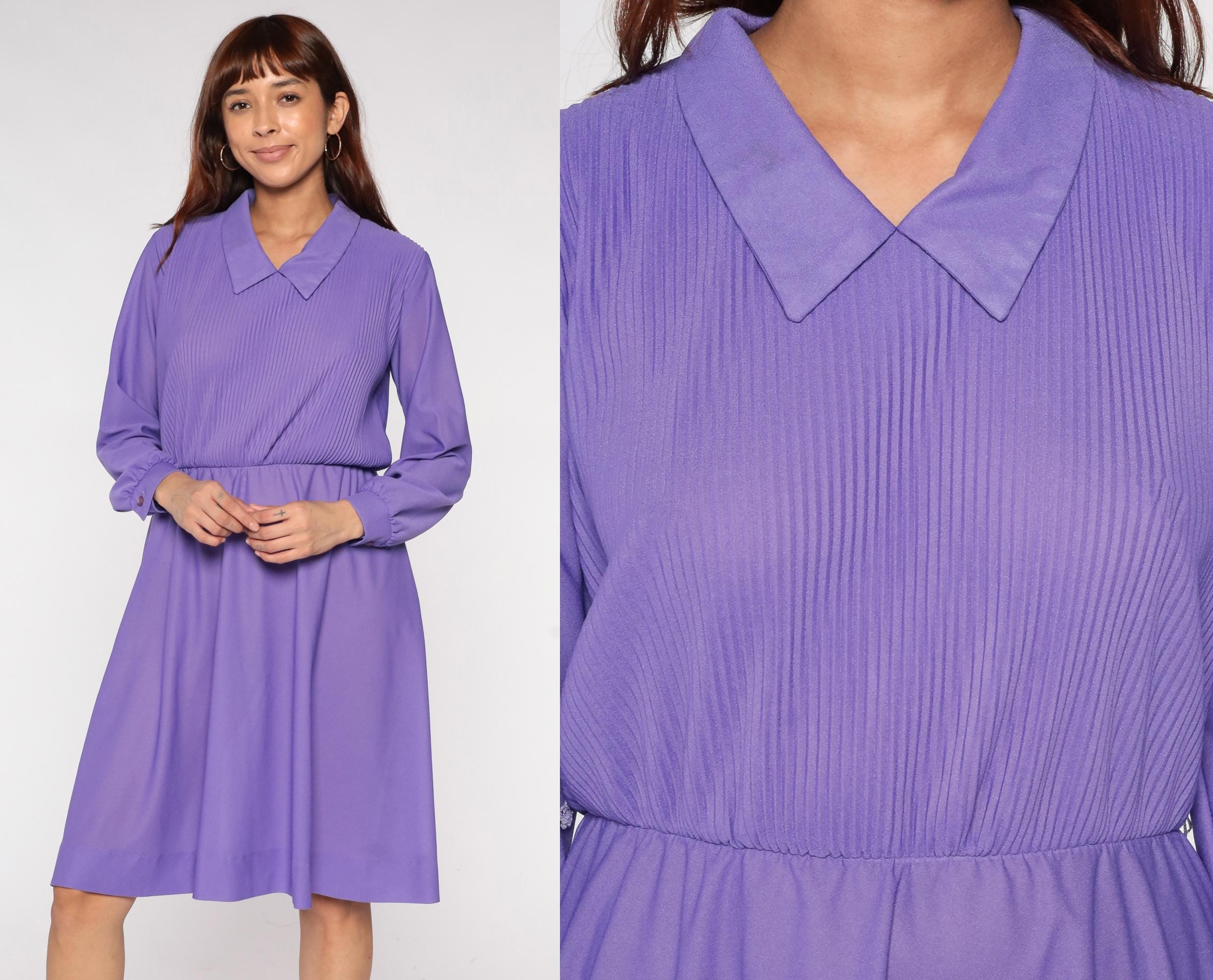 70s Ina Carol purple dress with pleated bodice and collar. Features long sleeves with button cuffs, elastic waist, and back zipper.