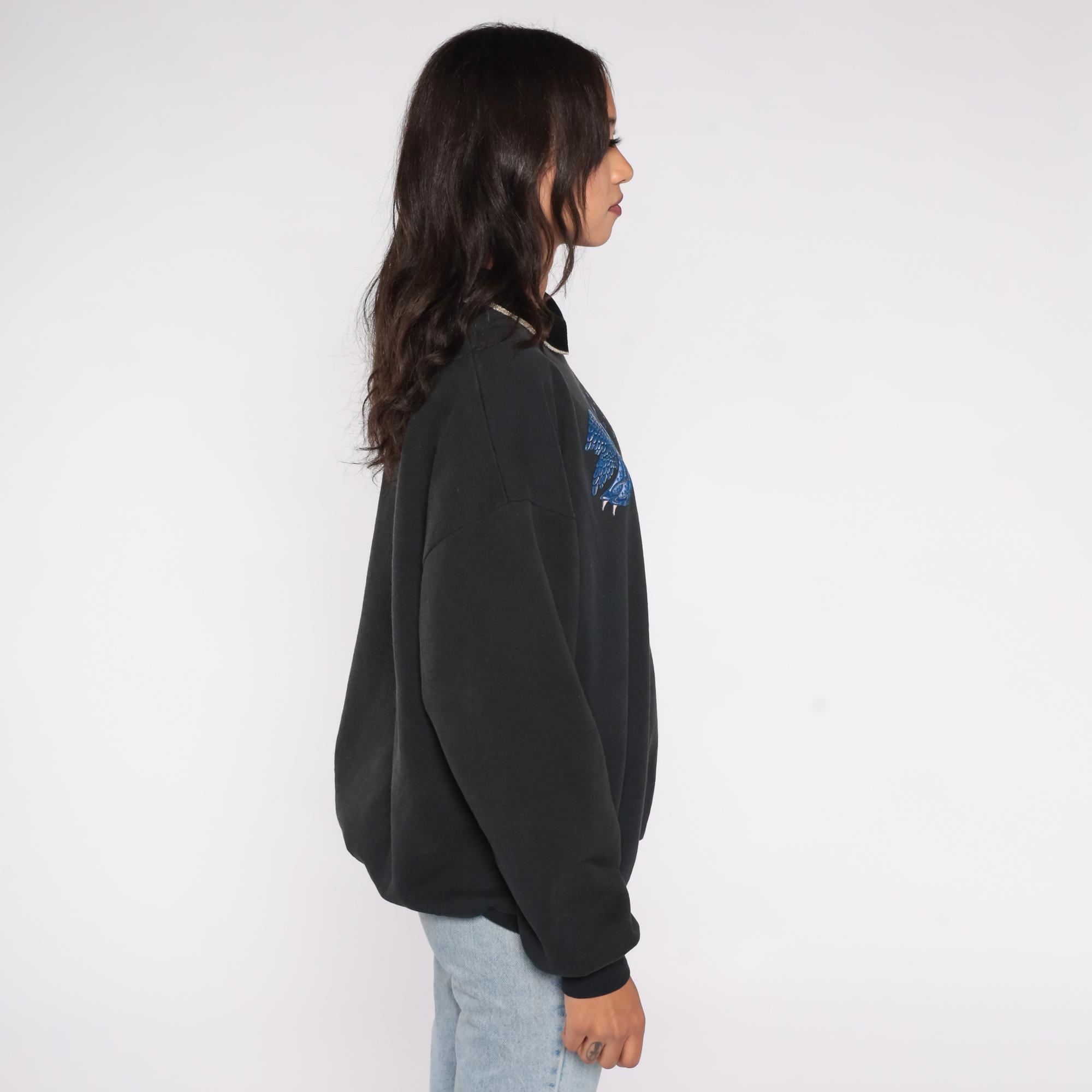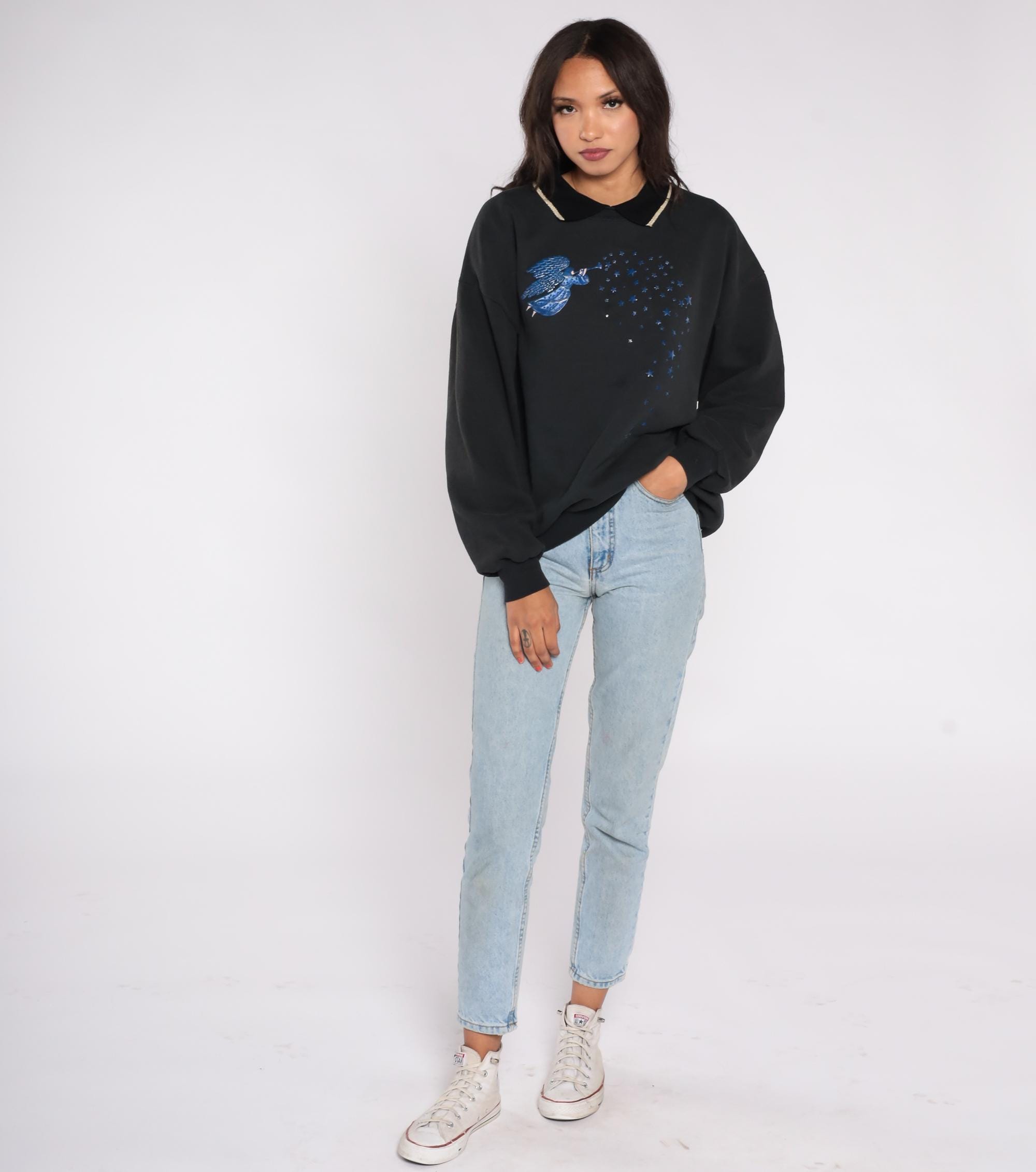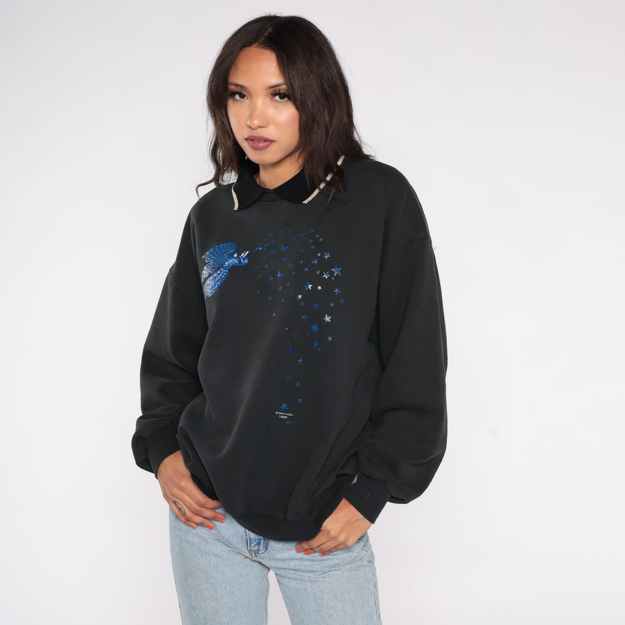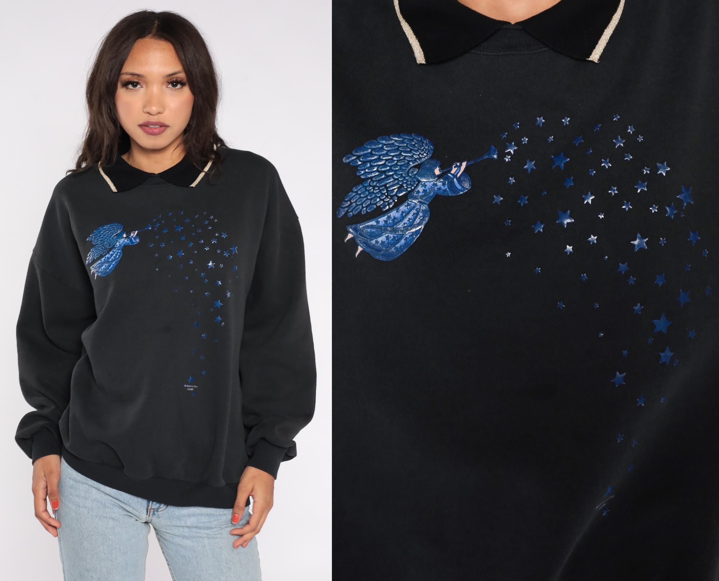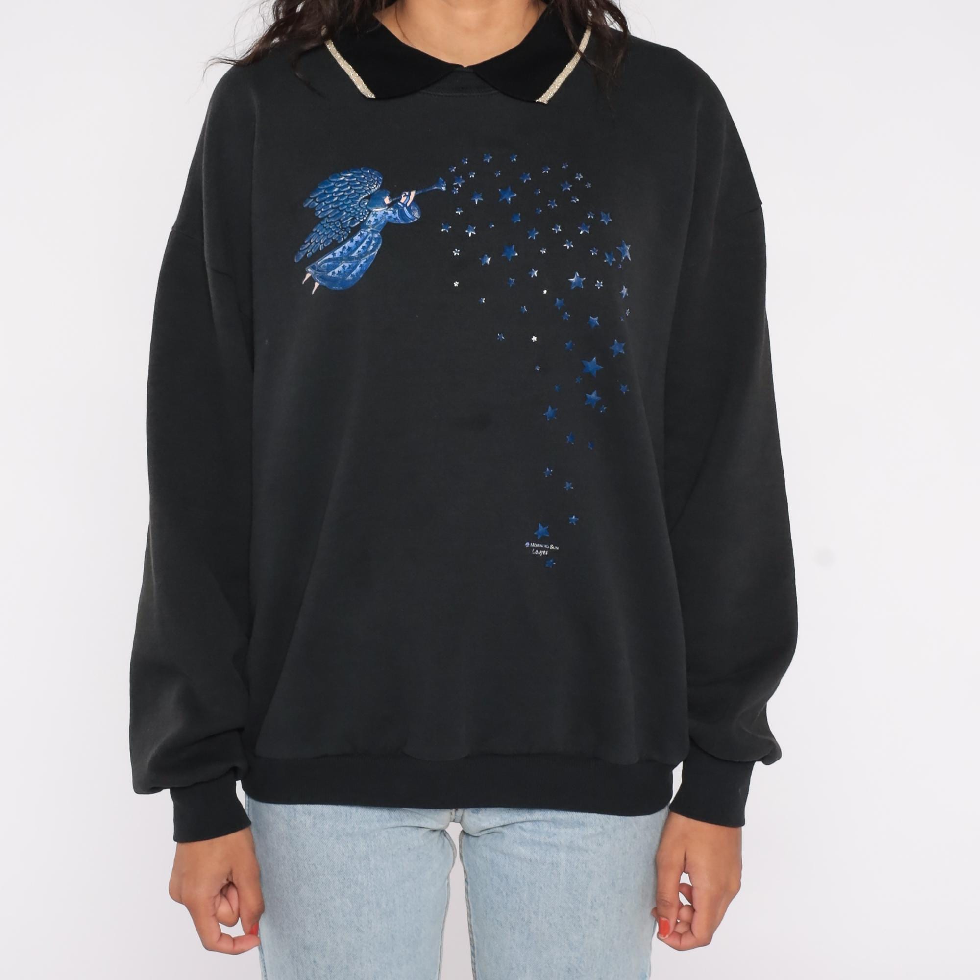 90s Morning Sun sweatshirt featuring a celestial angel graphic blowing stars across the chest in blue tones.