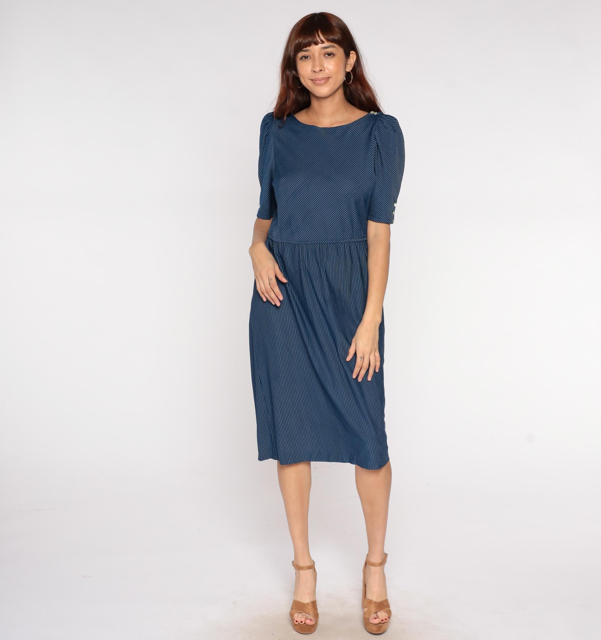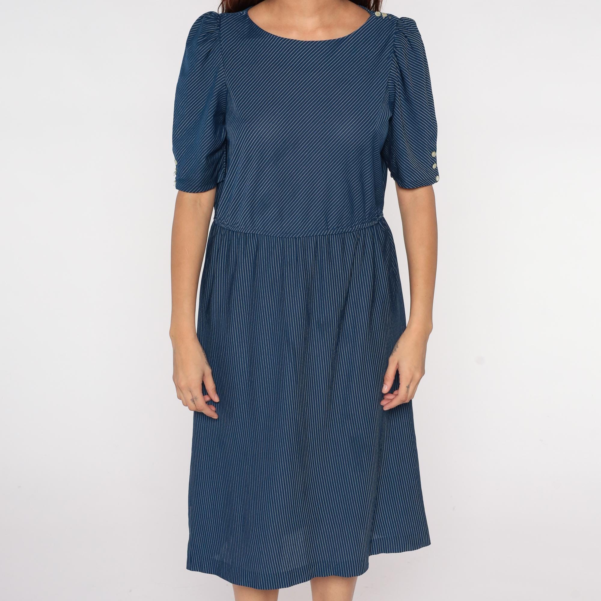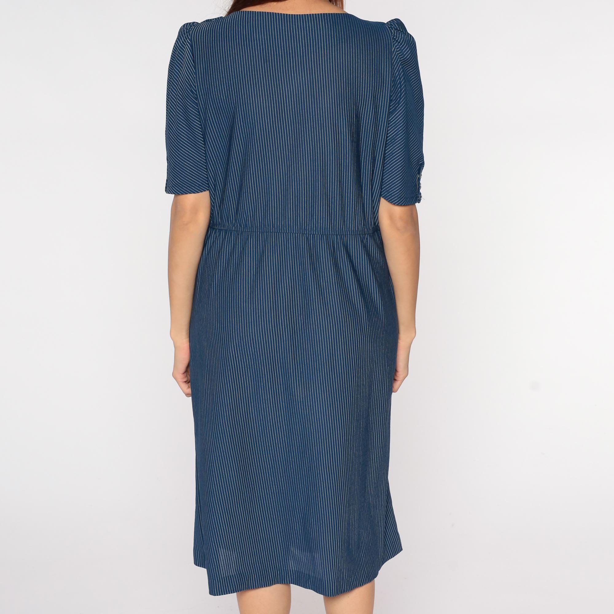 80s navy blue pinstripe midi dress with puff sleeves and button detail. Features elastic waist, scoop neckline, and tea length hem. Polyester.