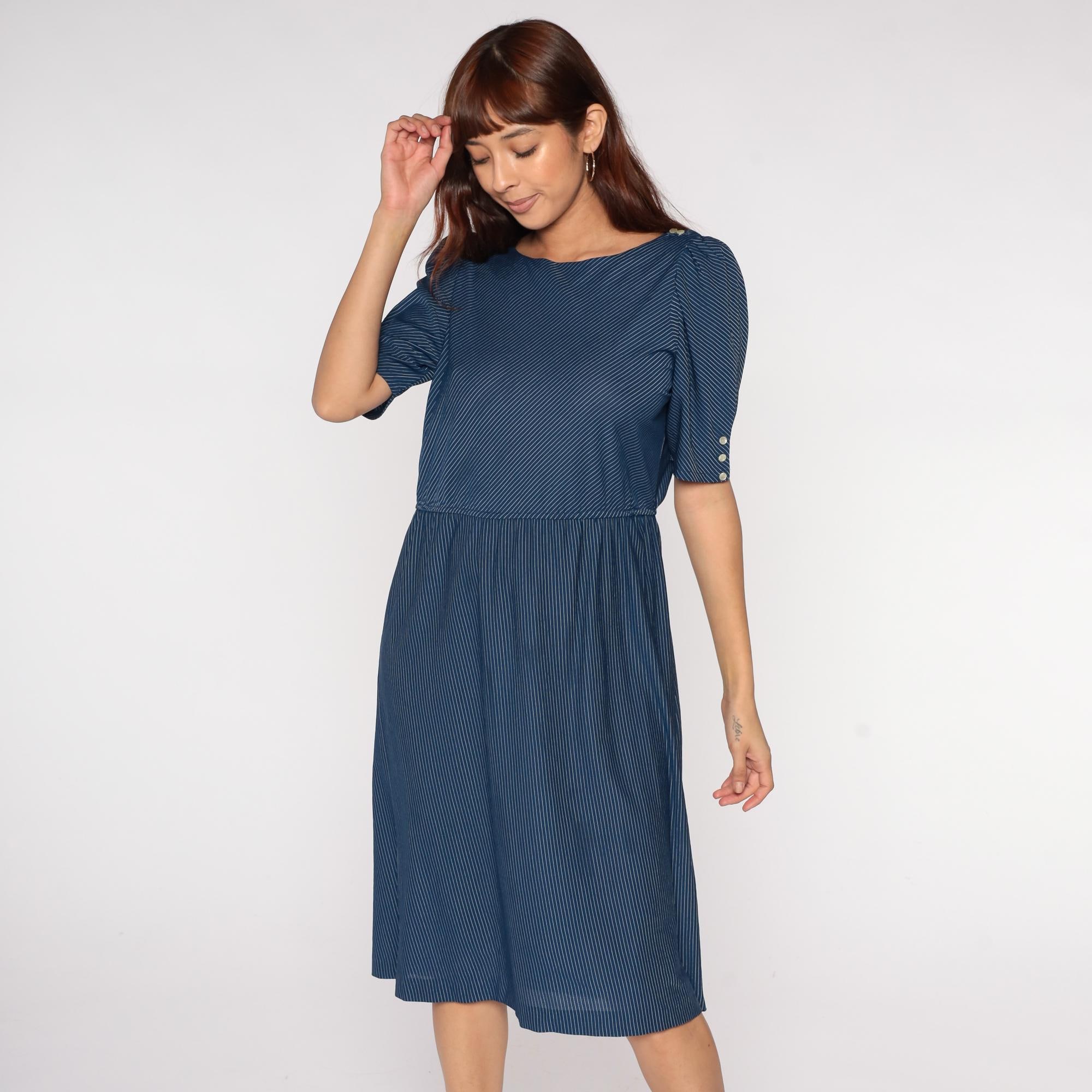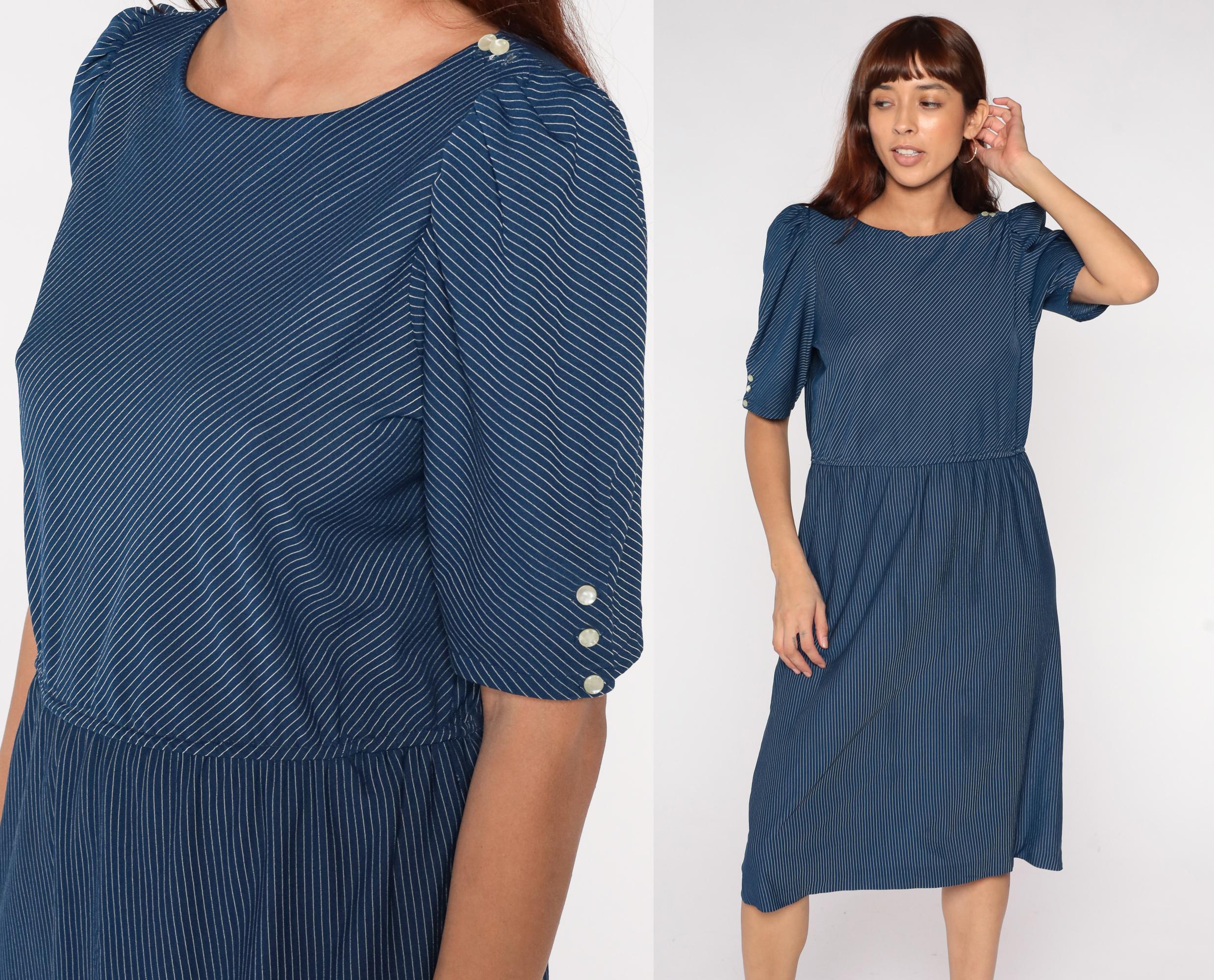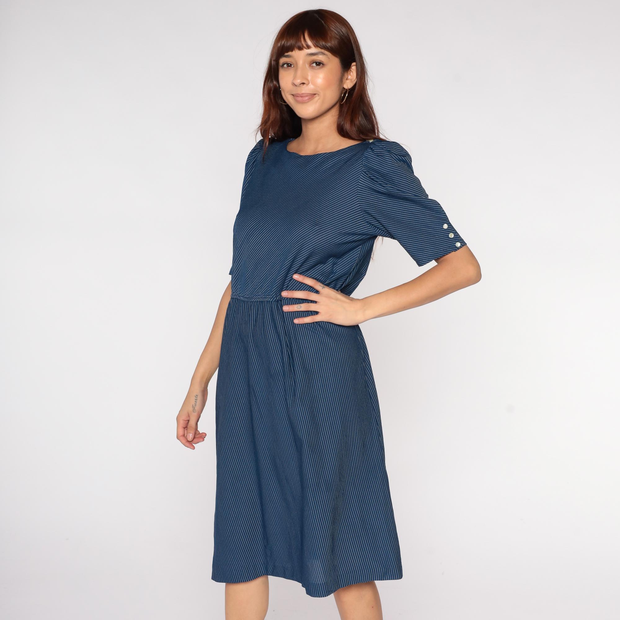 80s navy blue pinstripe midi dress with puff sleeves and button detail. Features elastic waist, scoop neckline, and tea length hem. Polyester.