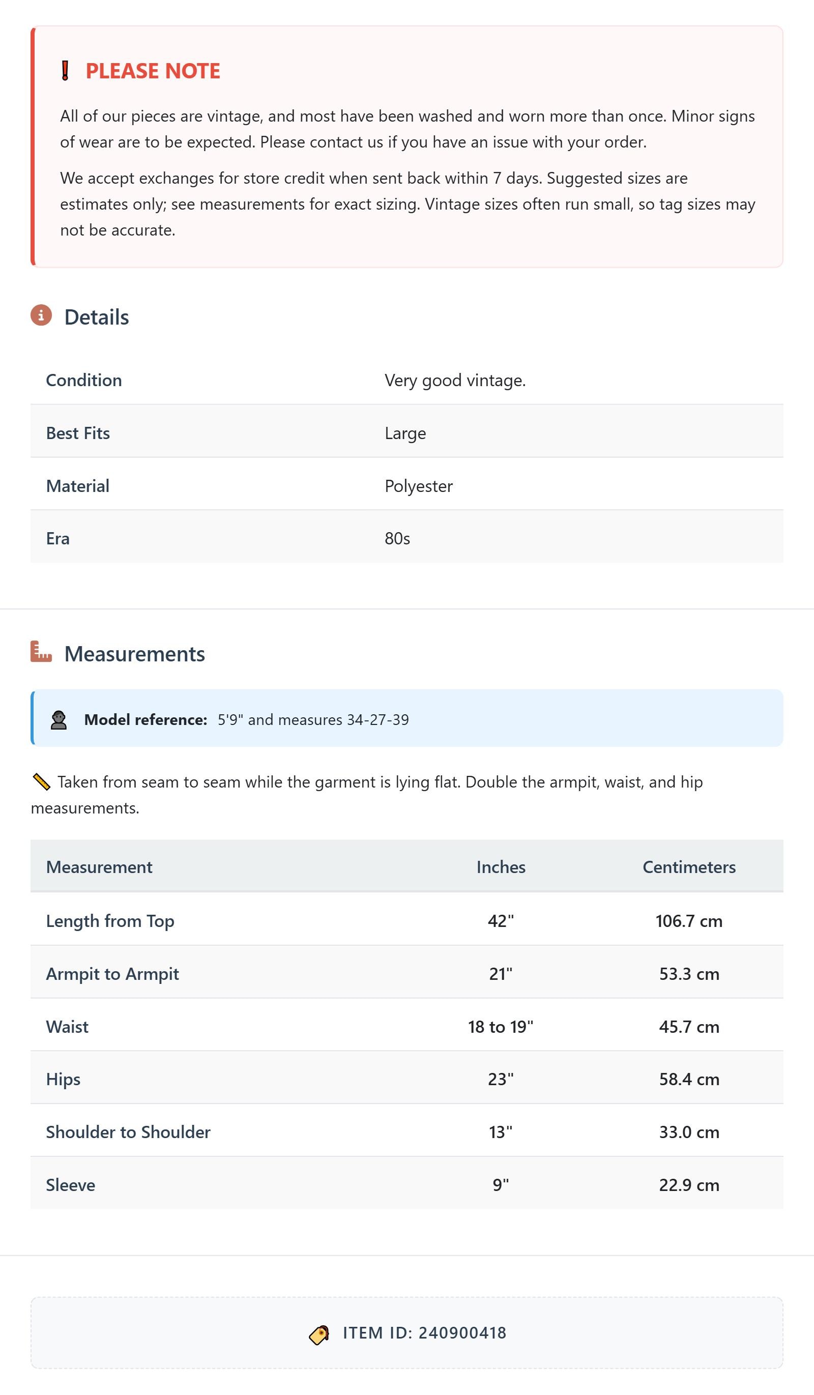 Suggested sizes are estimates only; see measurements for exact sizing. Vintage sizes often run small, so tag sizes may not be accurate.