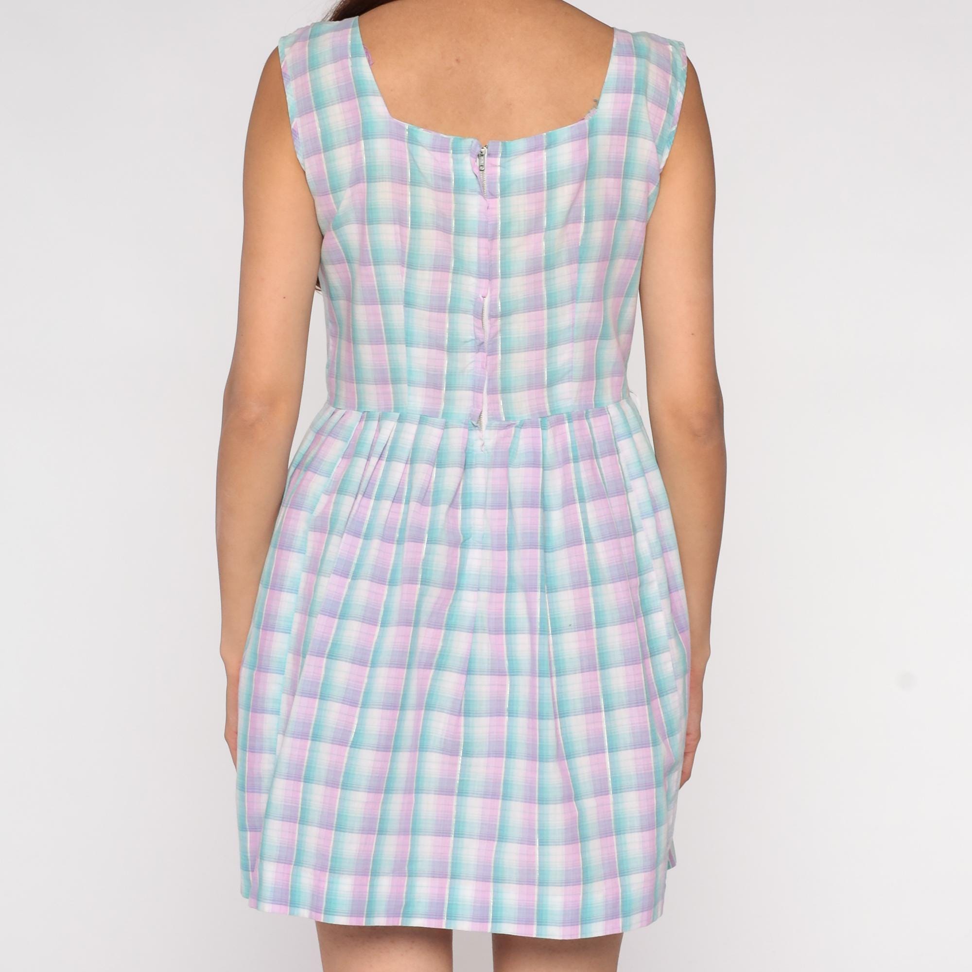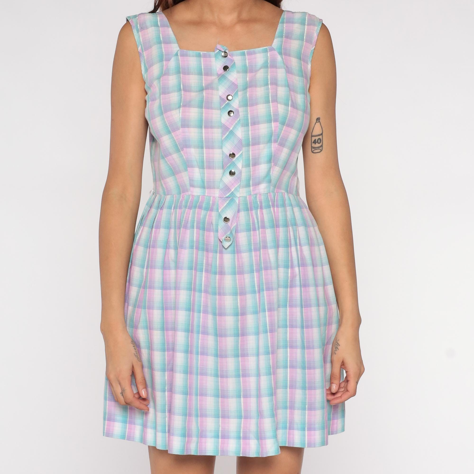 60s PaintSet Fashion plaid dress in mint green, pink and lavender. Features square neckline, button front, sleeveless cut, and gathered skirt. Cotton.