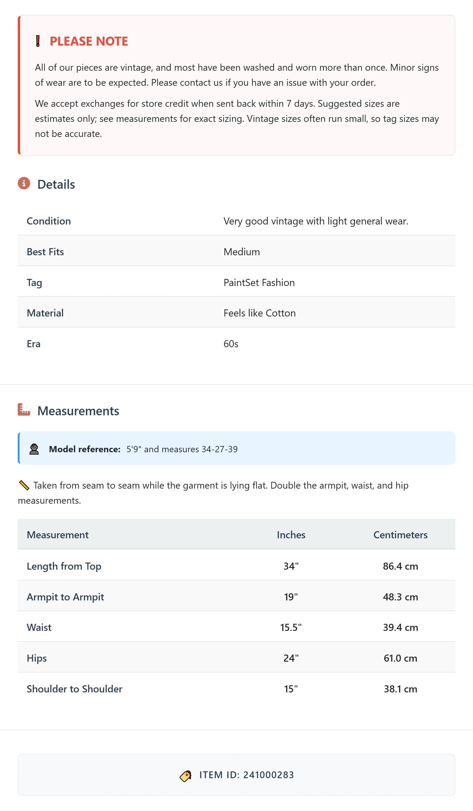 Suggested sizes are estimates only; see measurements for exact sizing. Vintage sizes often run small, so tag sizes may not be accurate.