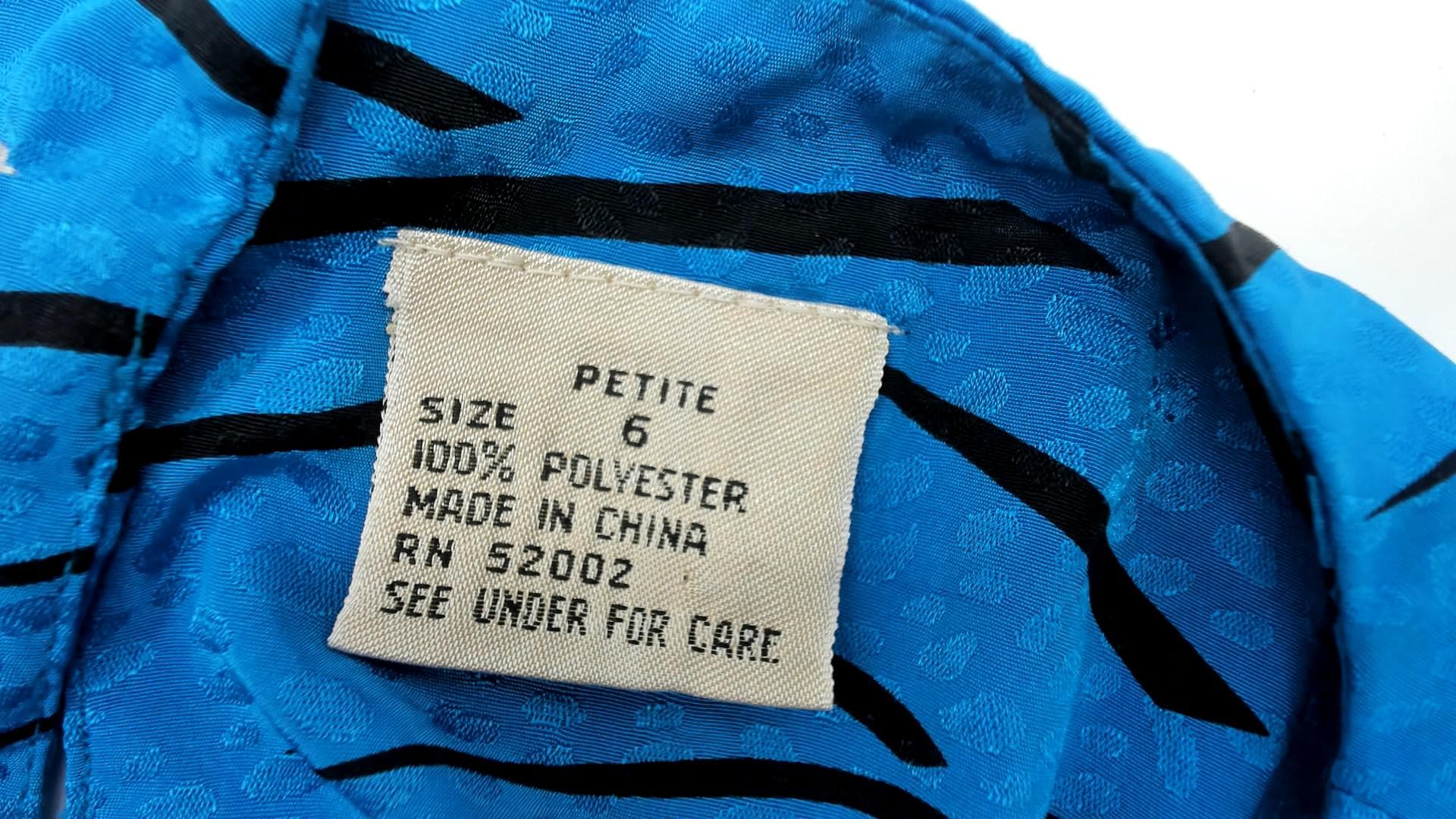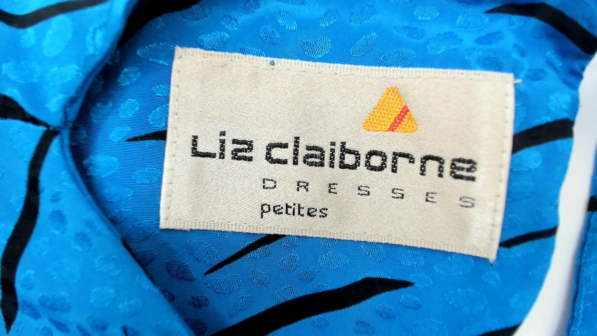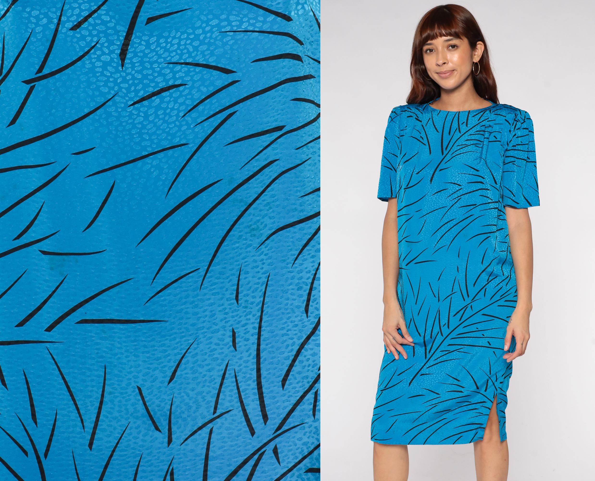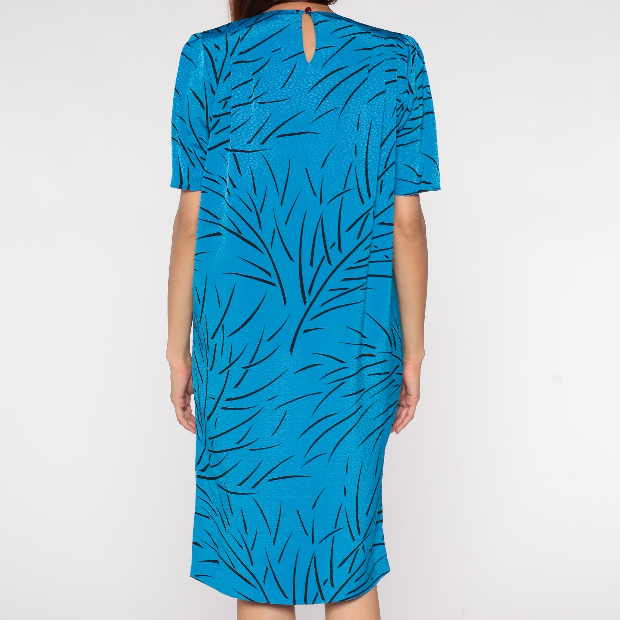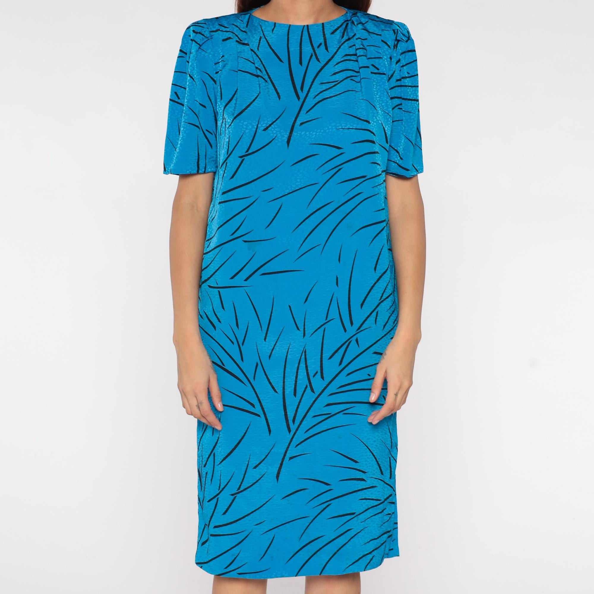 80s Liz Claiborne turquoise blue dress with abstract brushstroke print. Features short sleeves, keyhole back with button closure, side slit, and straight silhouette. Polyester.