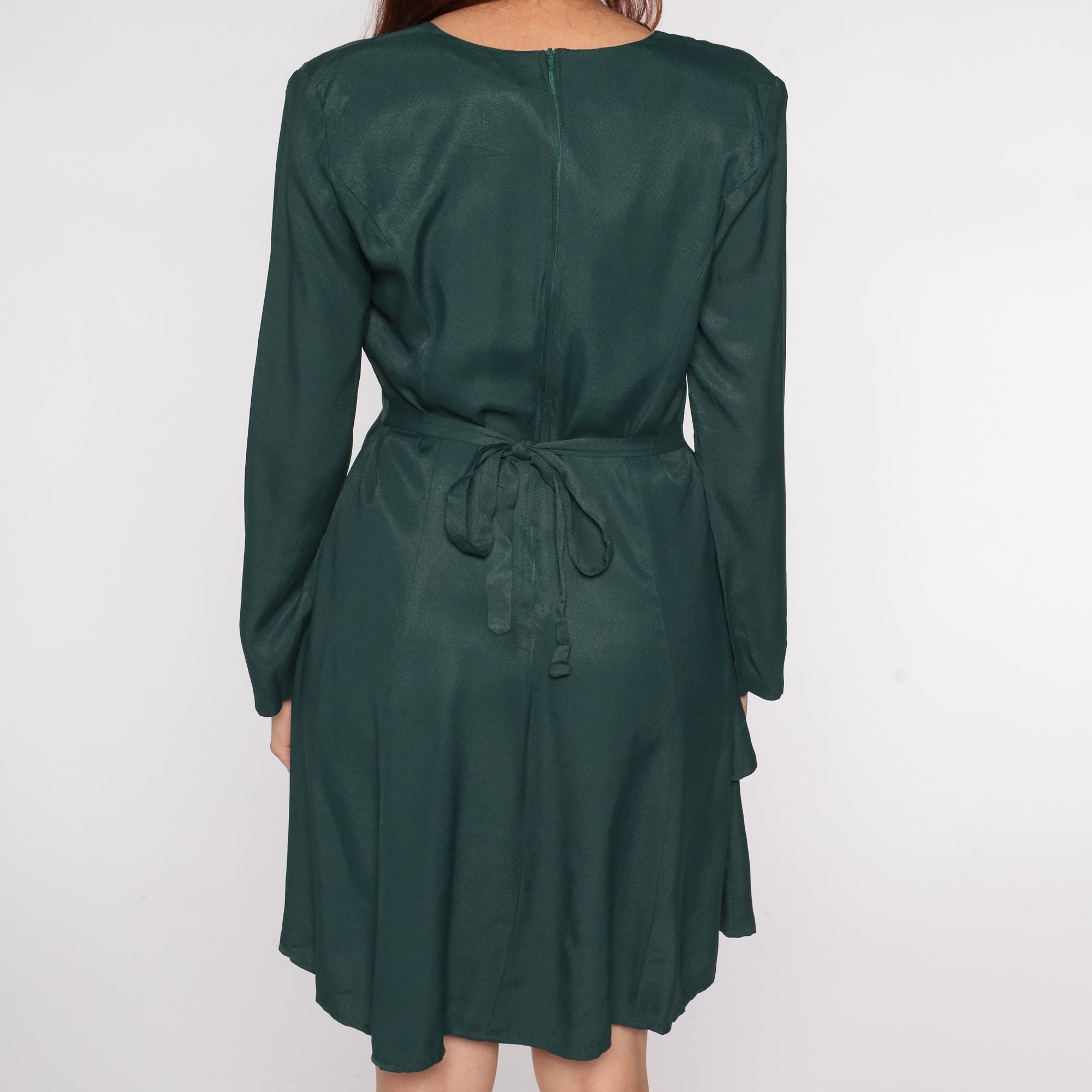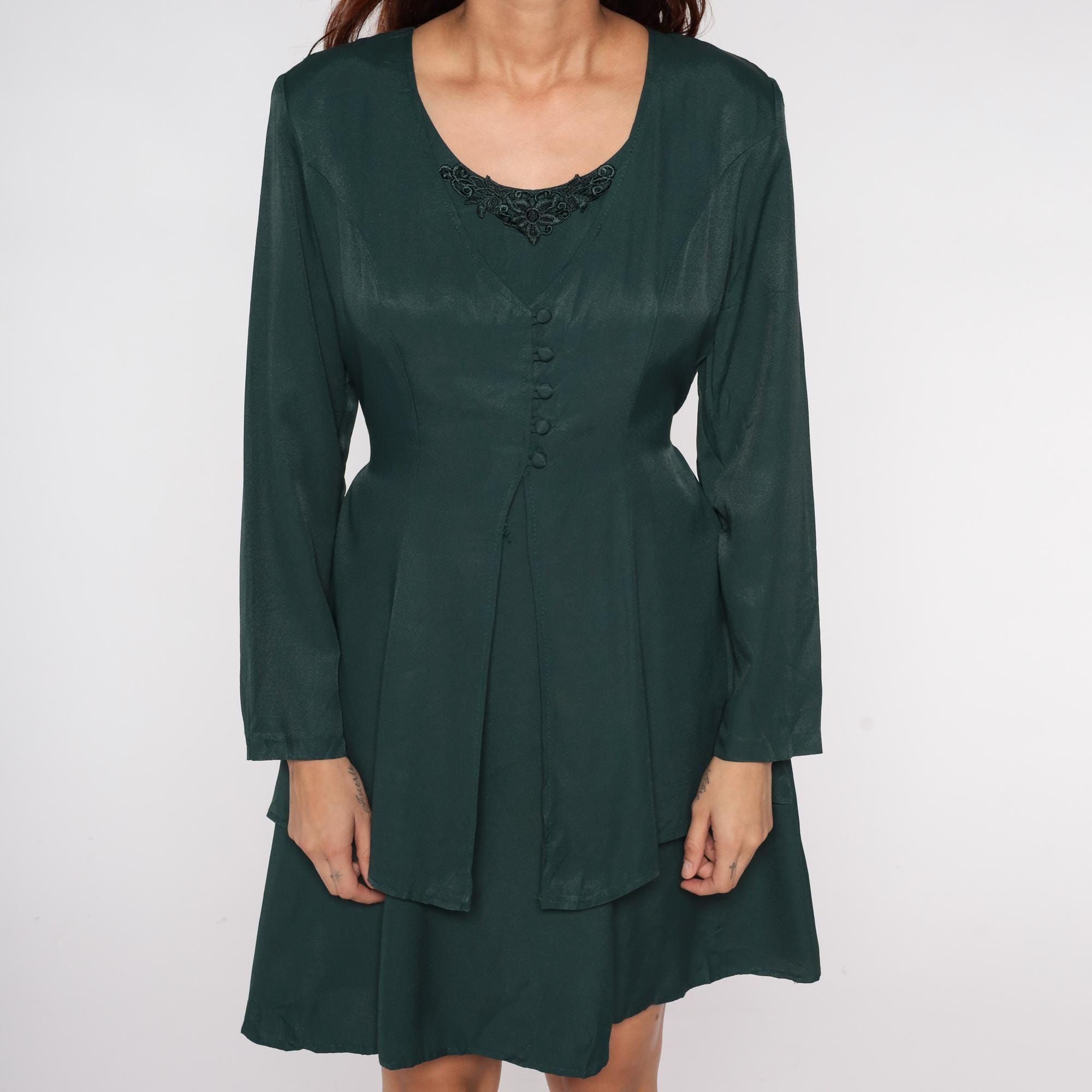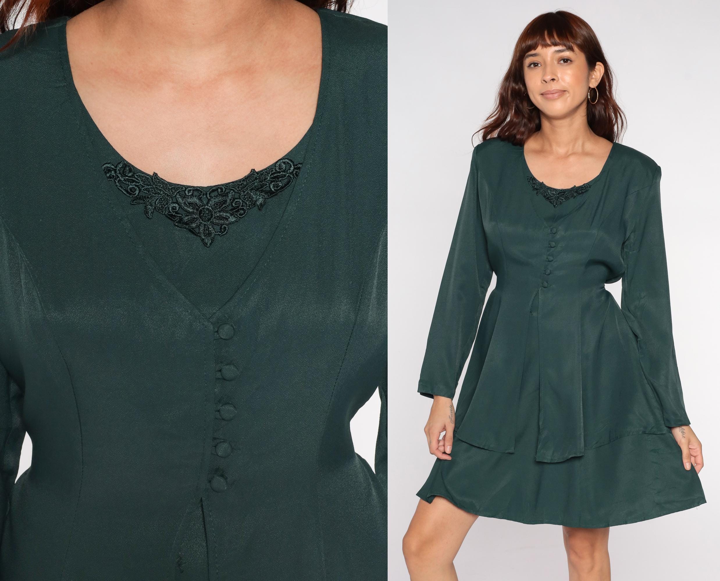 90s Be Smart forest green dress with embroidered neckline detail. Features button front, long sleeves, tiered skirt, and tie back. Perfect for dark academia, grunge, preppy, or goth style.
