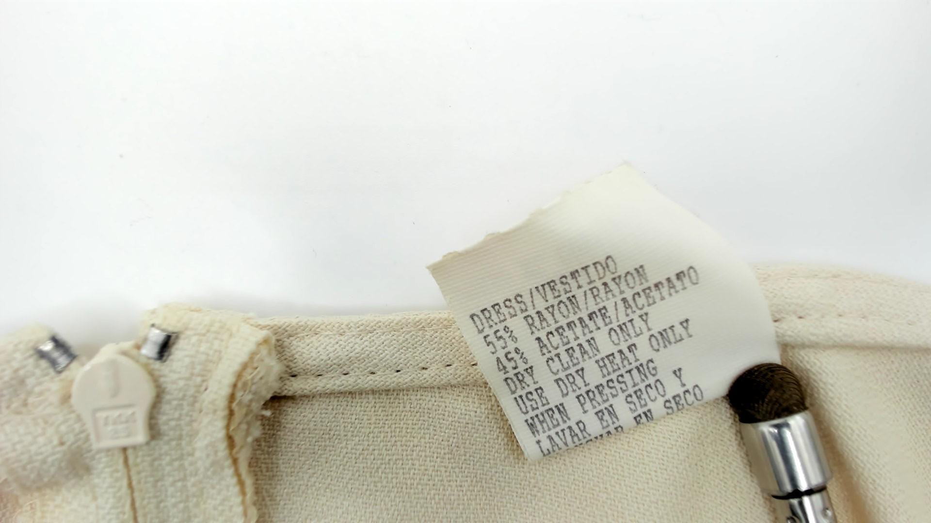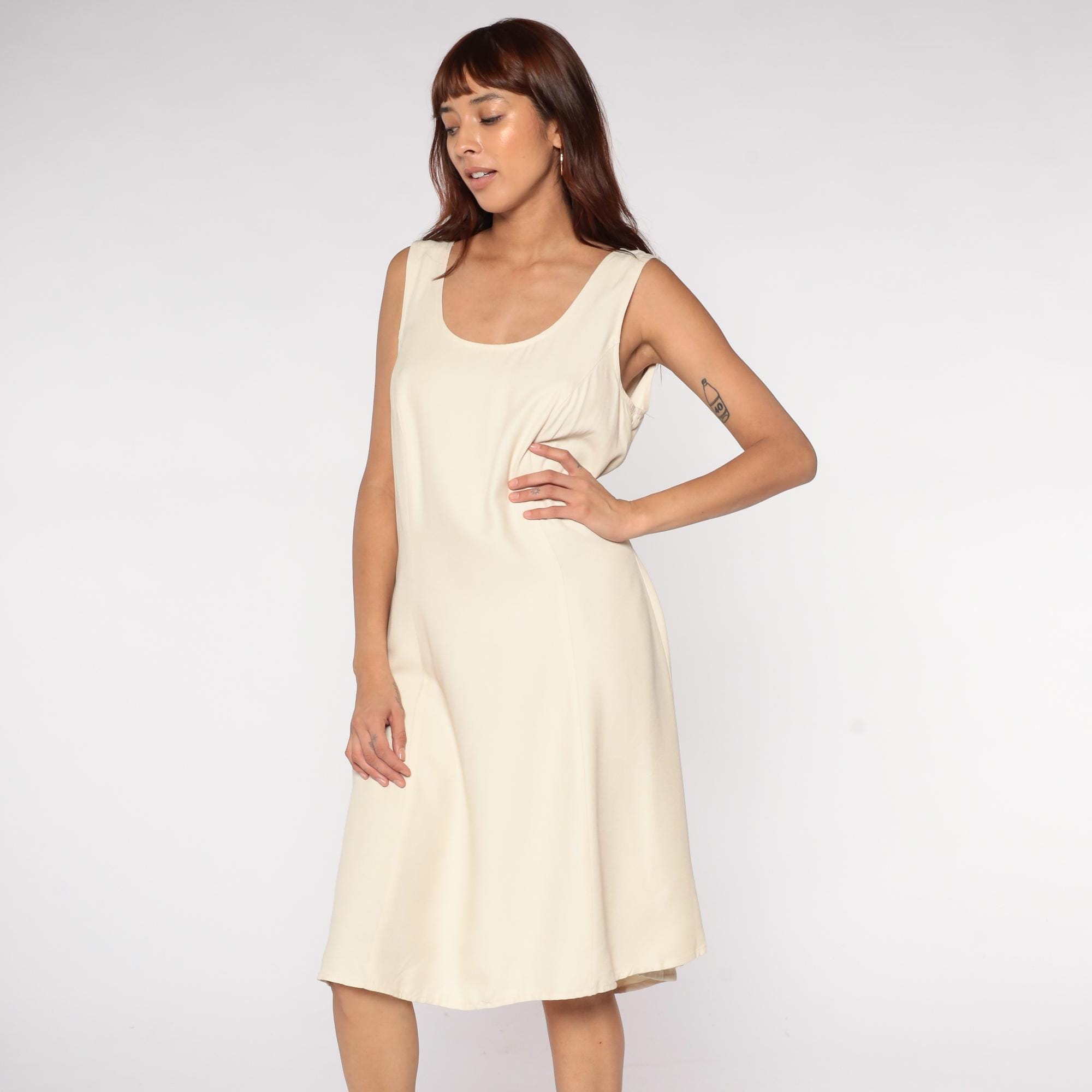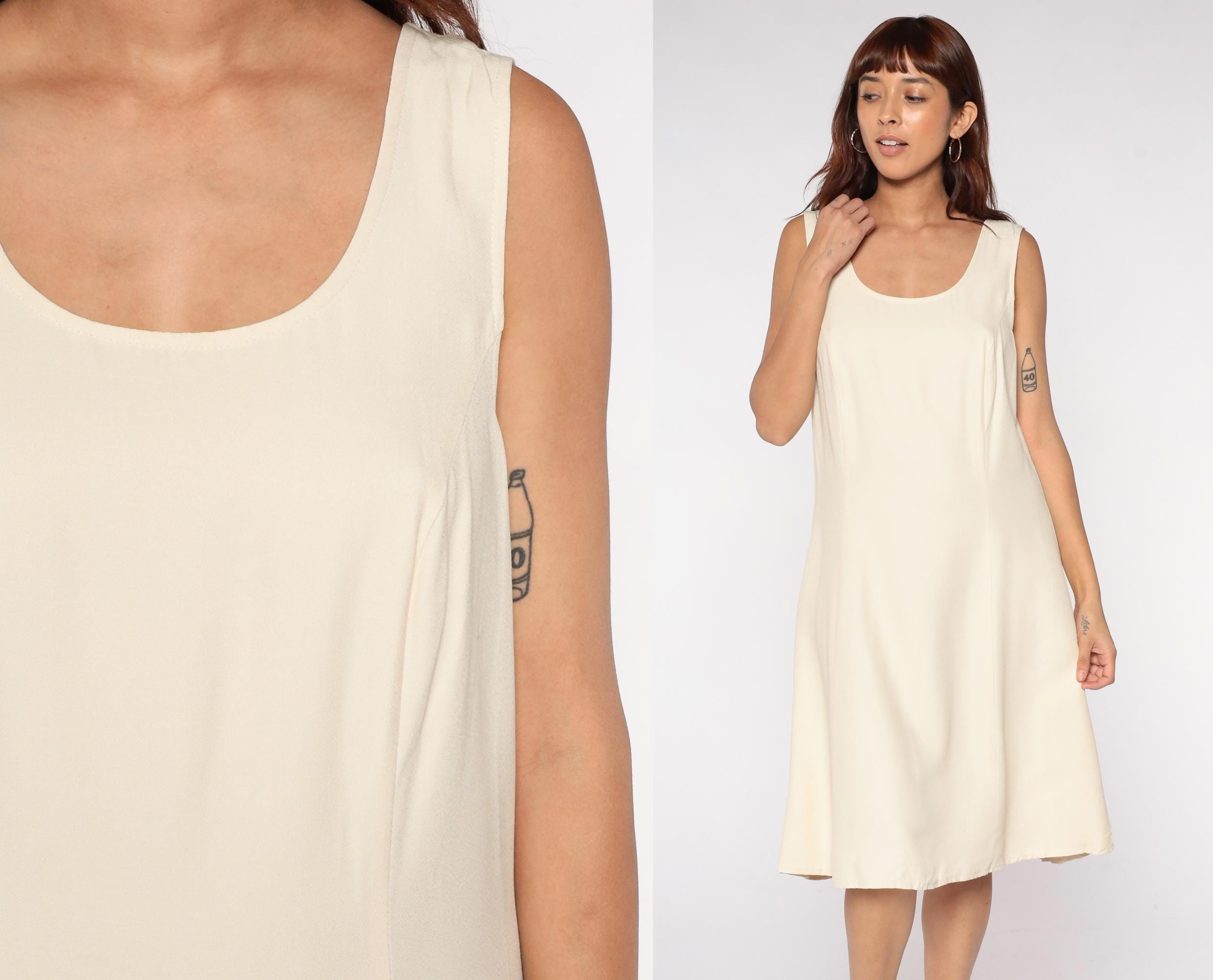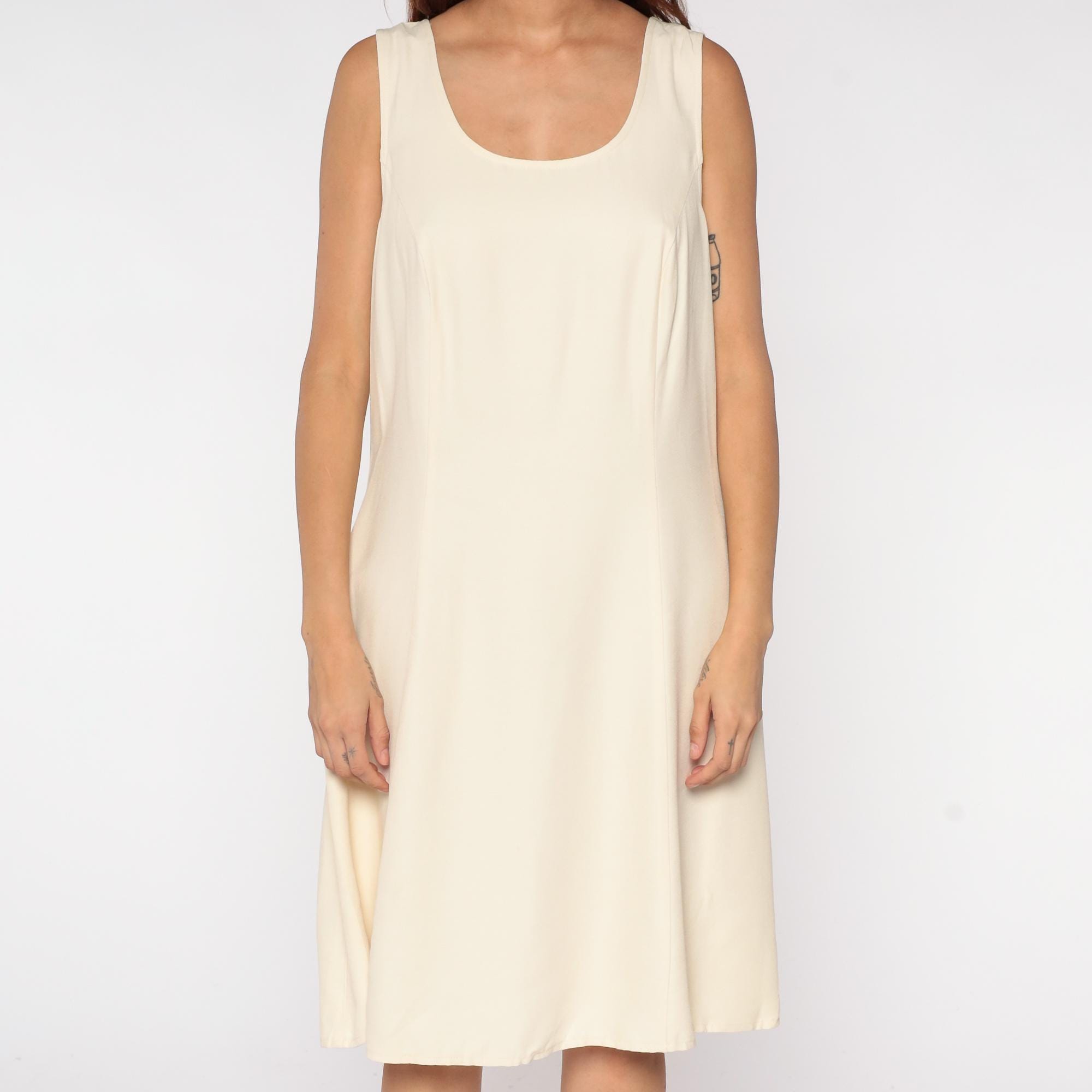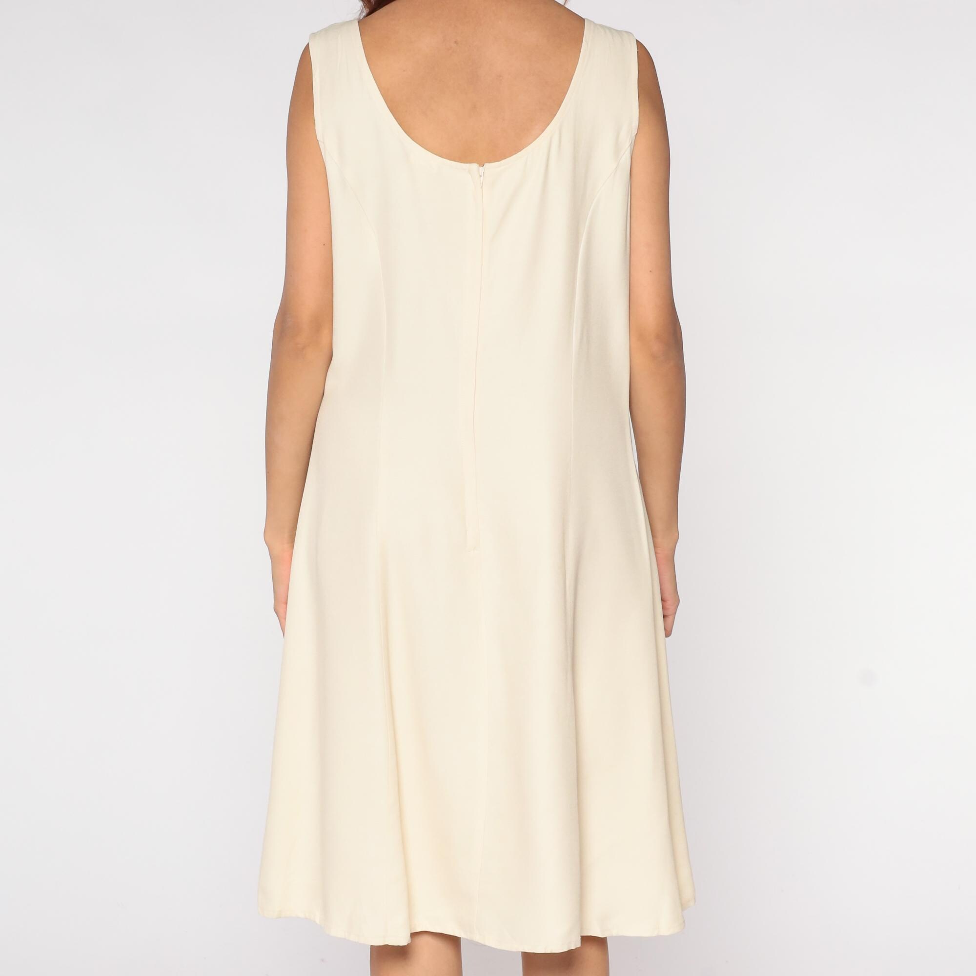 90s minimalist cream shift dress in rayon/acetate blend. Features sleeveless design, scoop neckline, A-line silhouette, and back zipper.