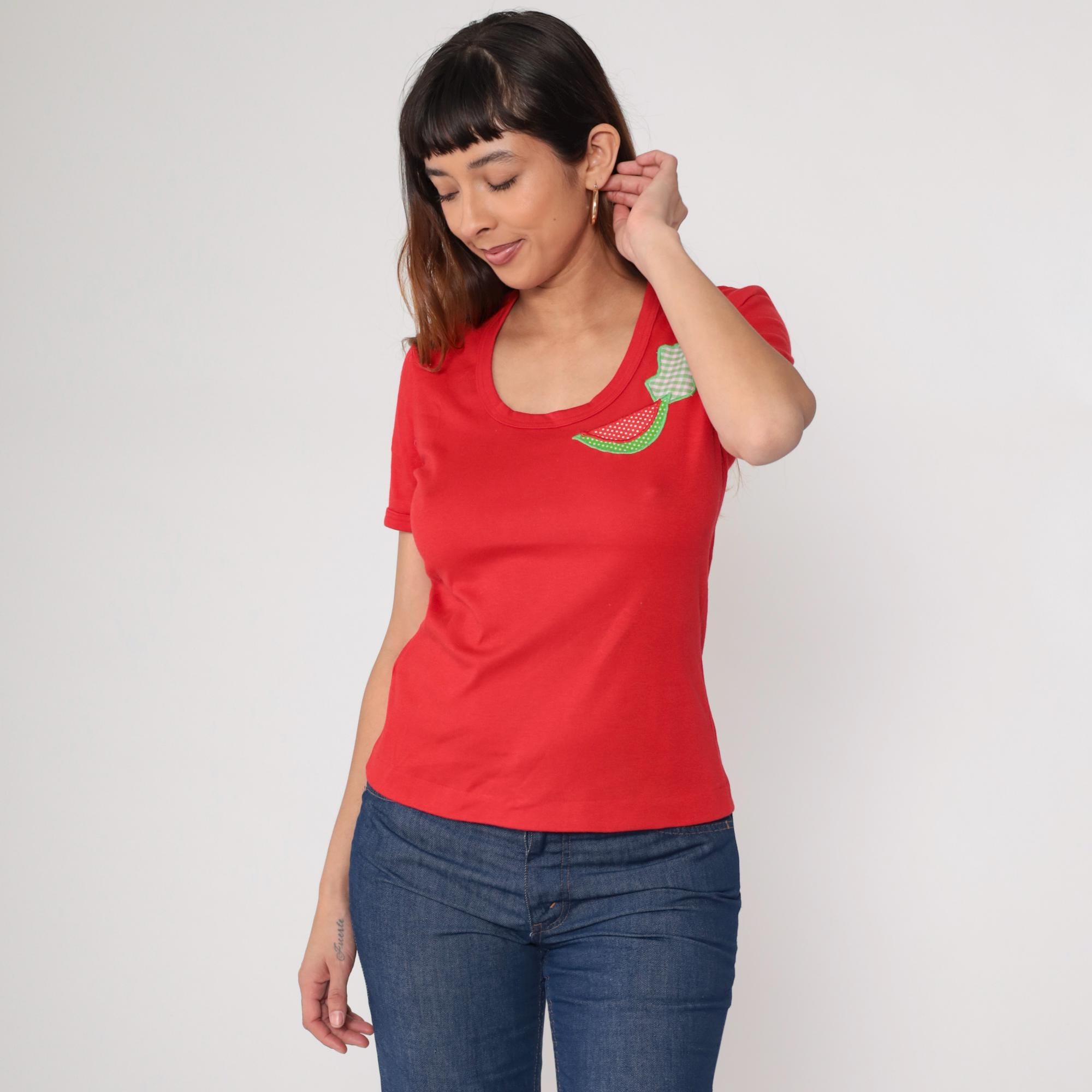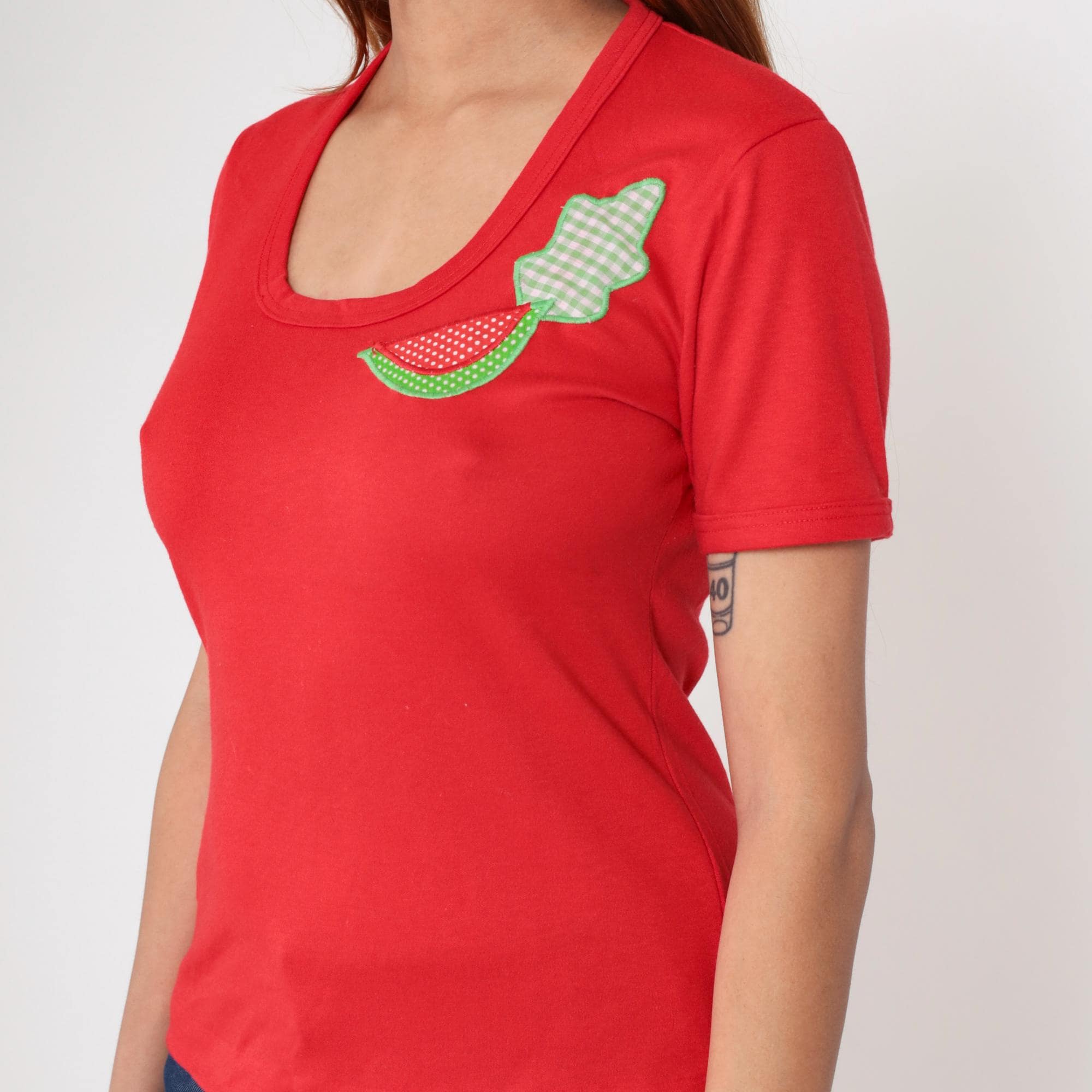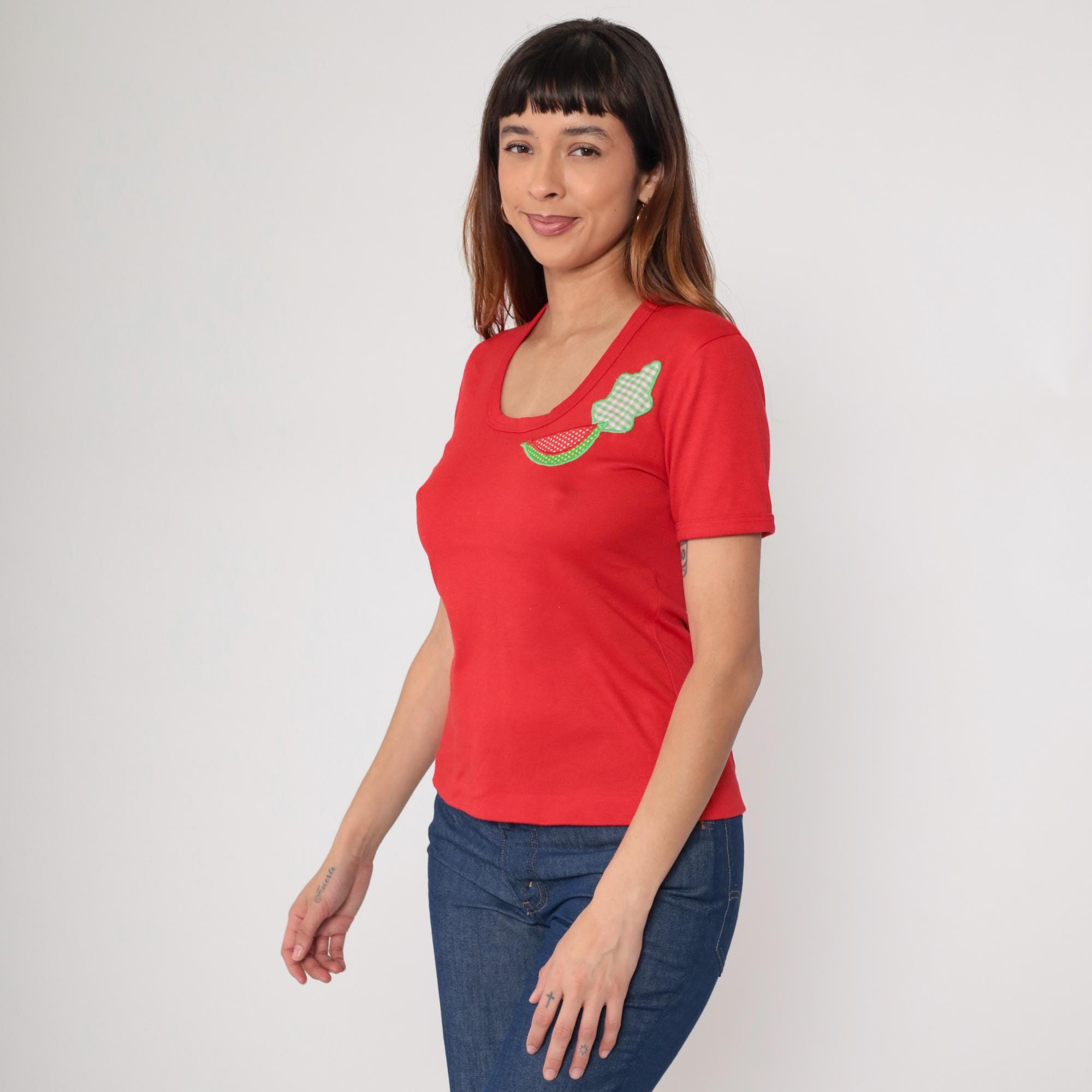1970s red t-shirt featuring a charming handmade watermelon appliqué on the chest. The watermelon design combines green gingham check fabric for the rind and red polka dot fabric for the fruit, with green piping details.