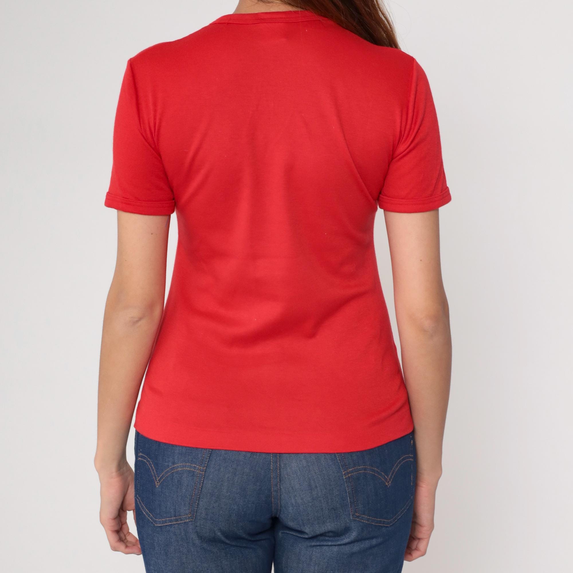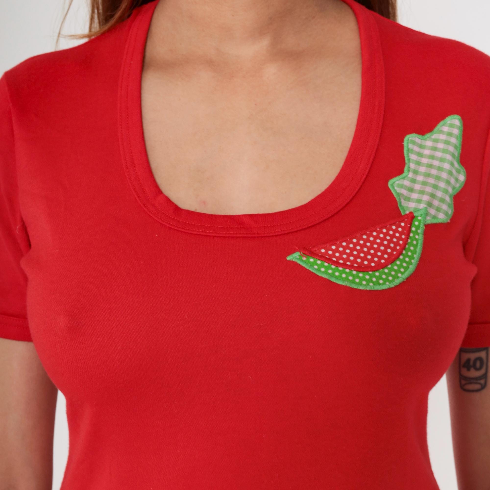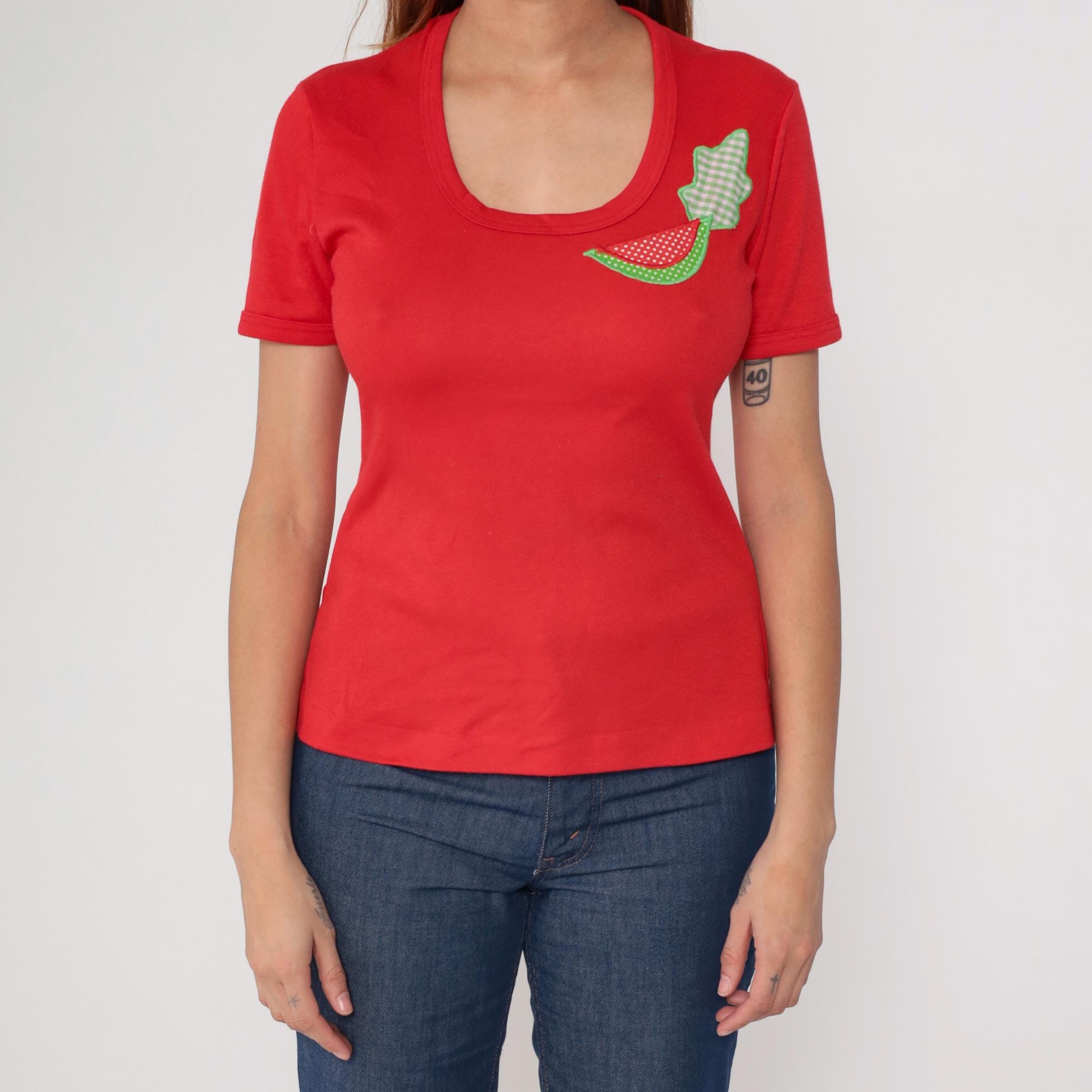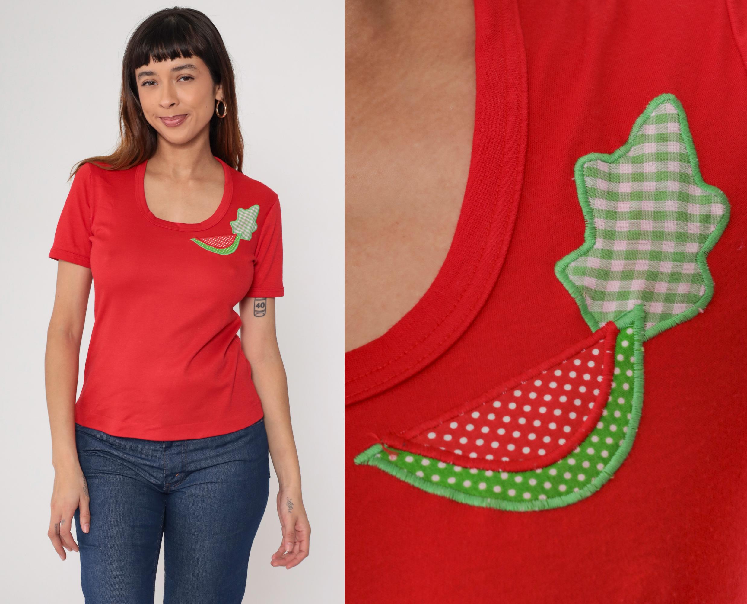 1970s red t-shirt featuring a charming handmade watermelon appliqué on the chest. The watermelon design combines green gingham check fabric for the rind and red polka dot fabric for the fruit, with green piping details.
