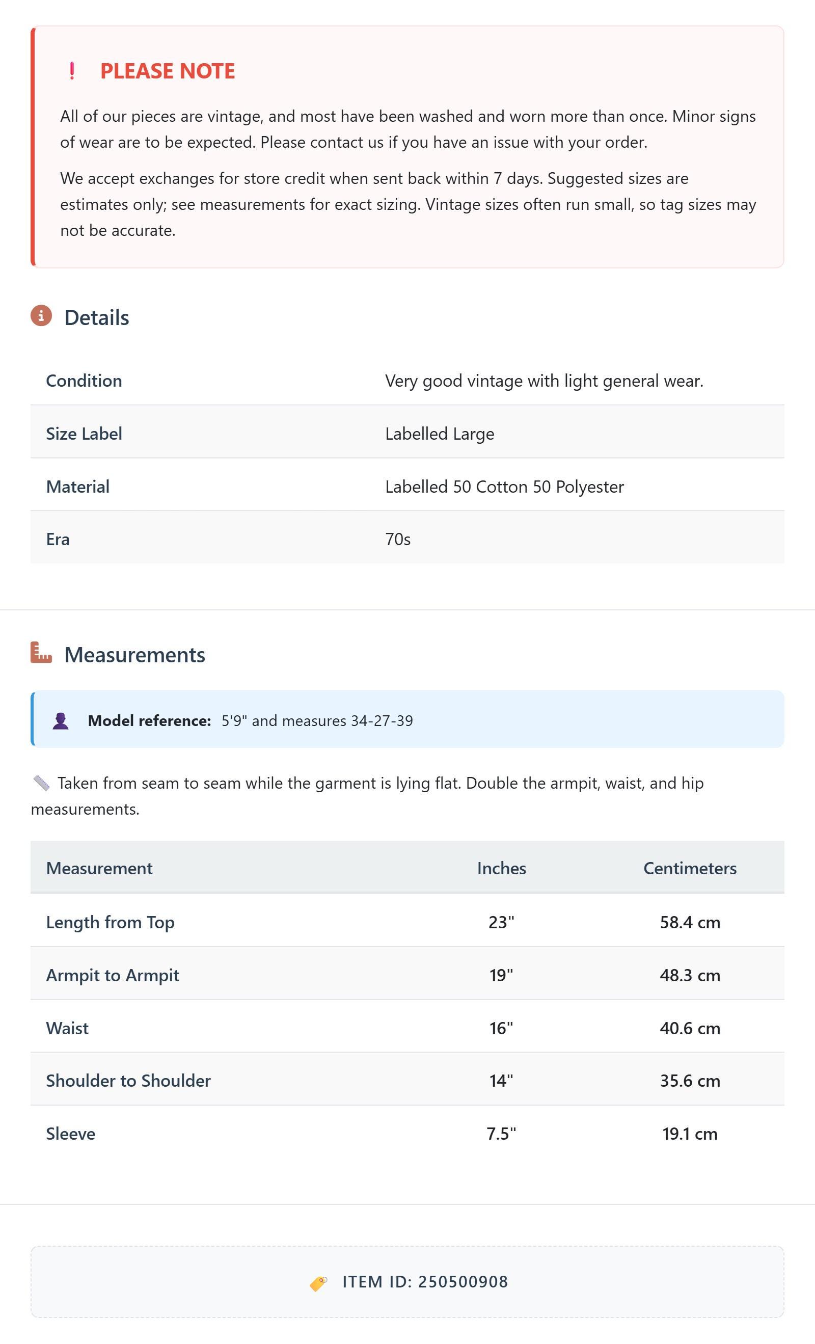 All of our pieces are vintage, and most have been washed and worn more than once. Minor signs of wear are to be expected. Please contact us if you have an issue with your order. We accept exchanges for store credit when sent back within 7 days.