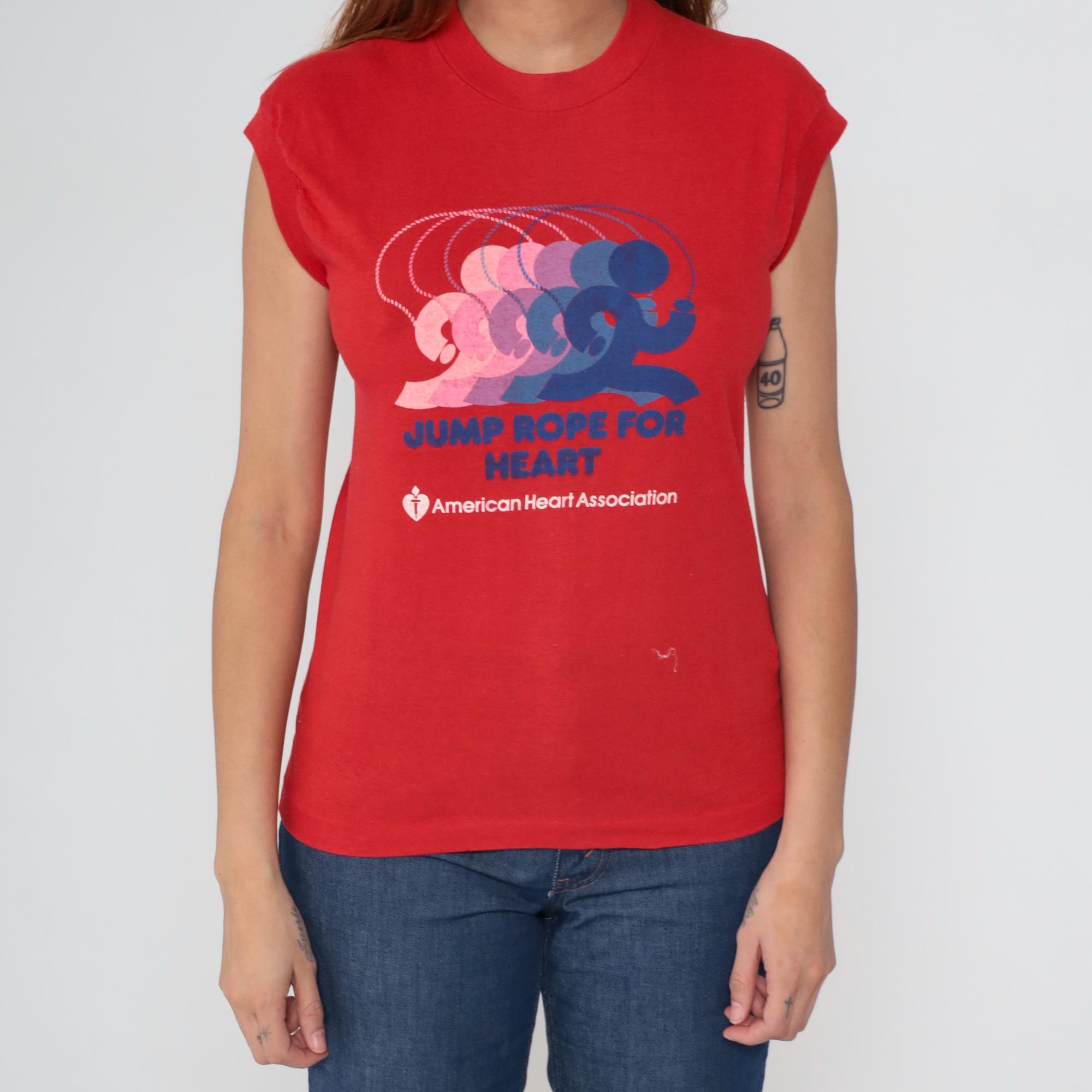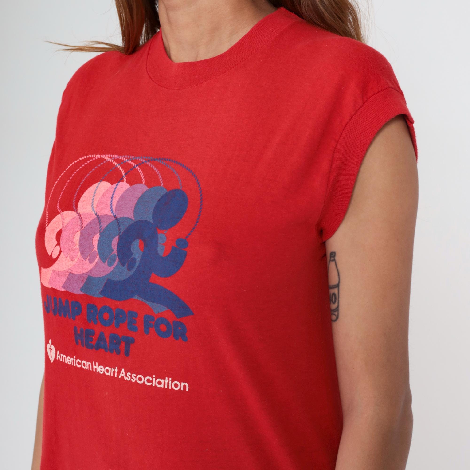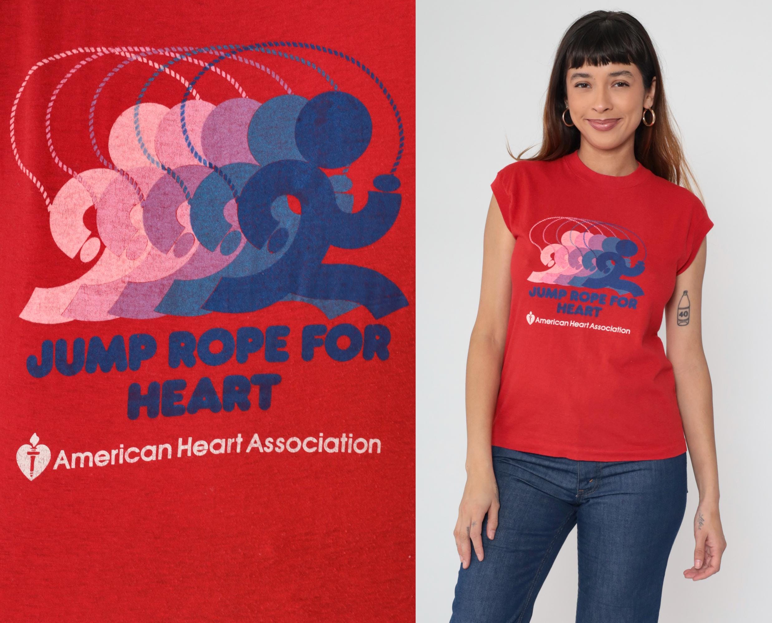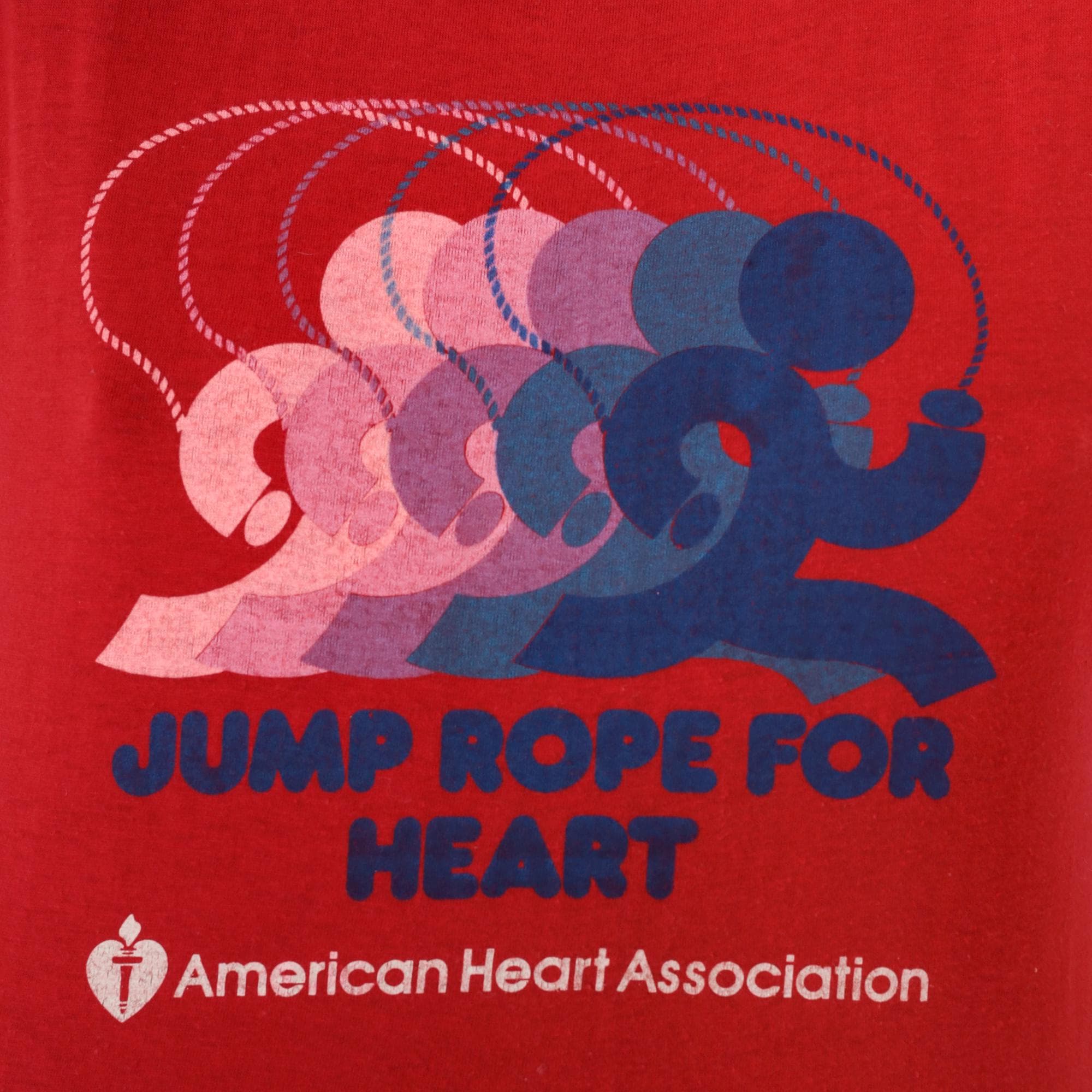 1980s red "Jump Rope for Heart" t-shirt from the American Heart Association. Features a distinctive ombre graphic with jumping figures in pink to blue gradient and white rope details.