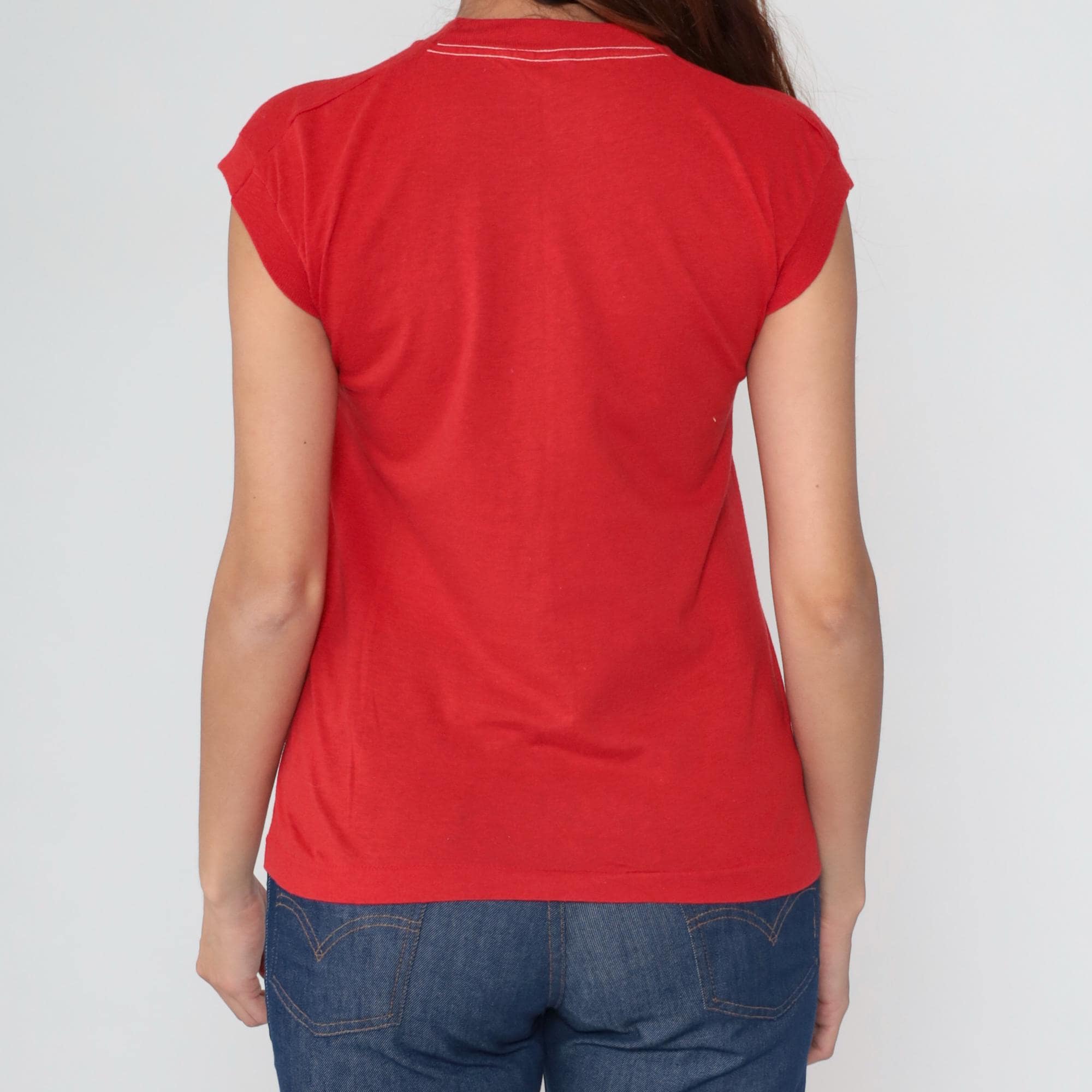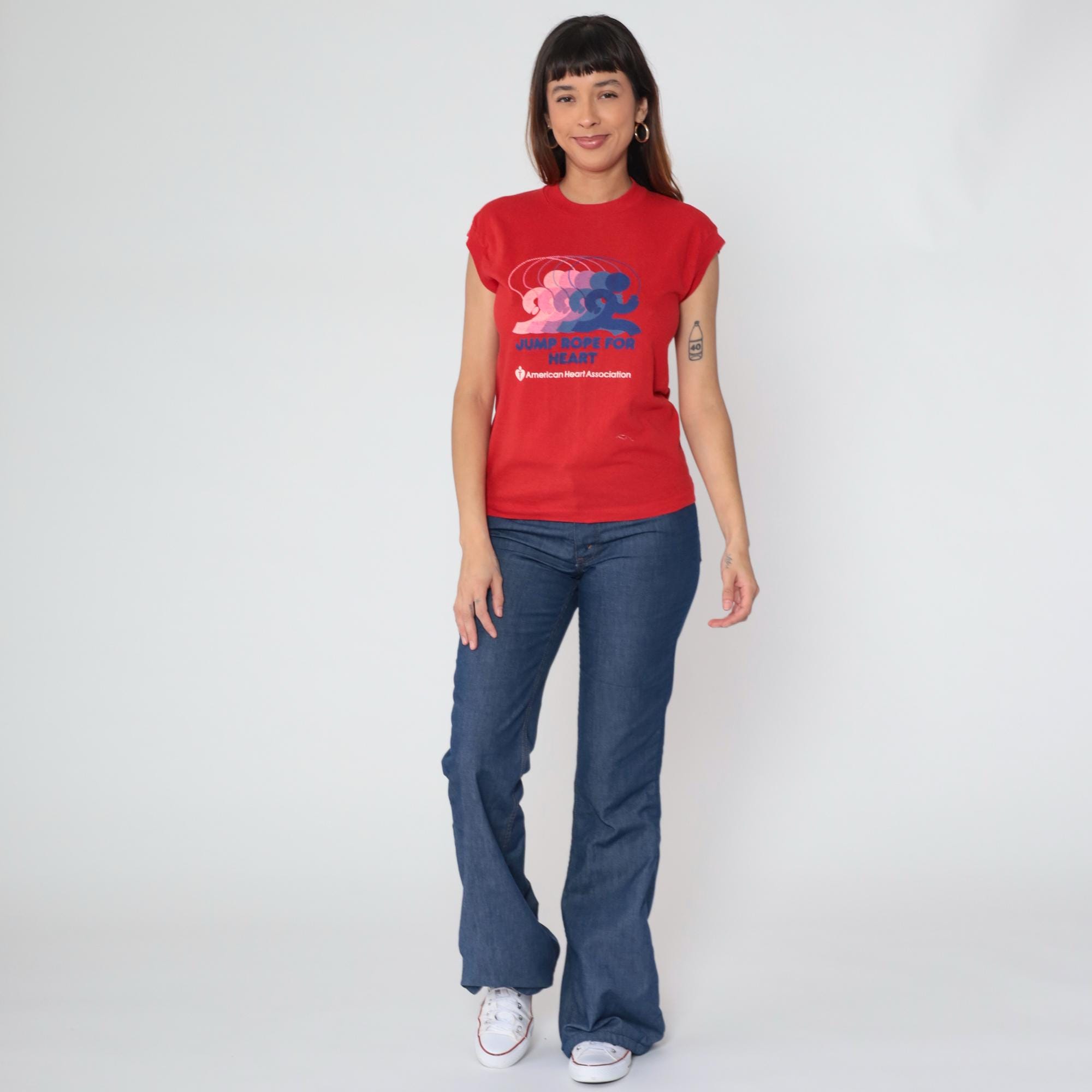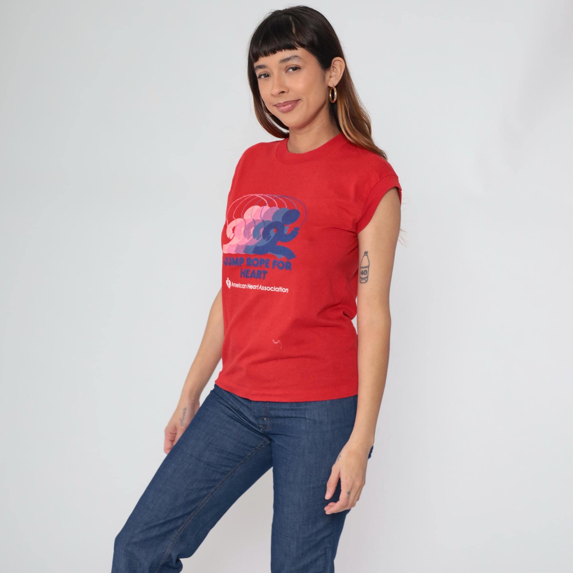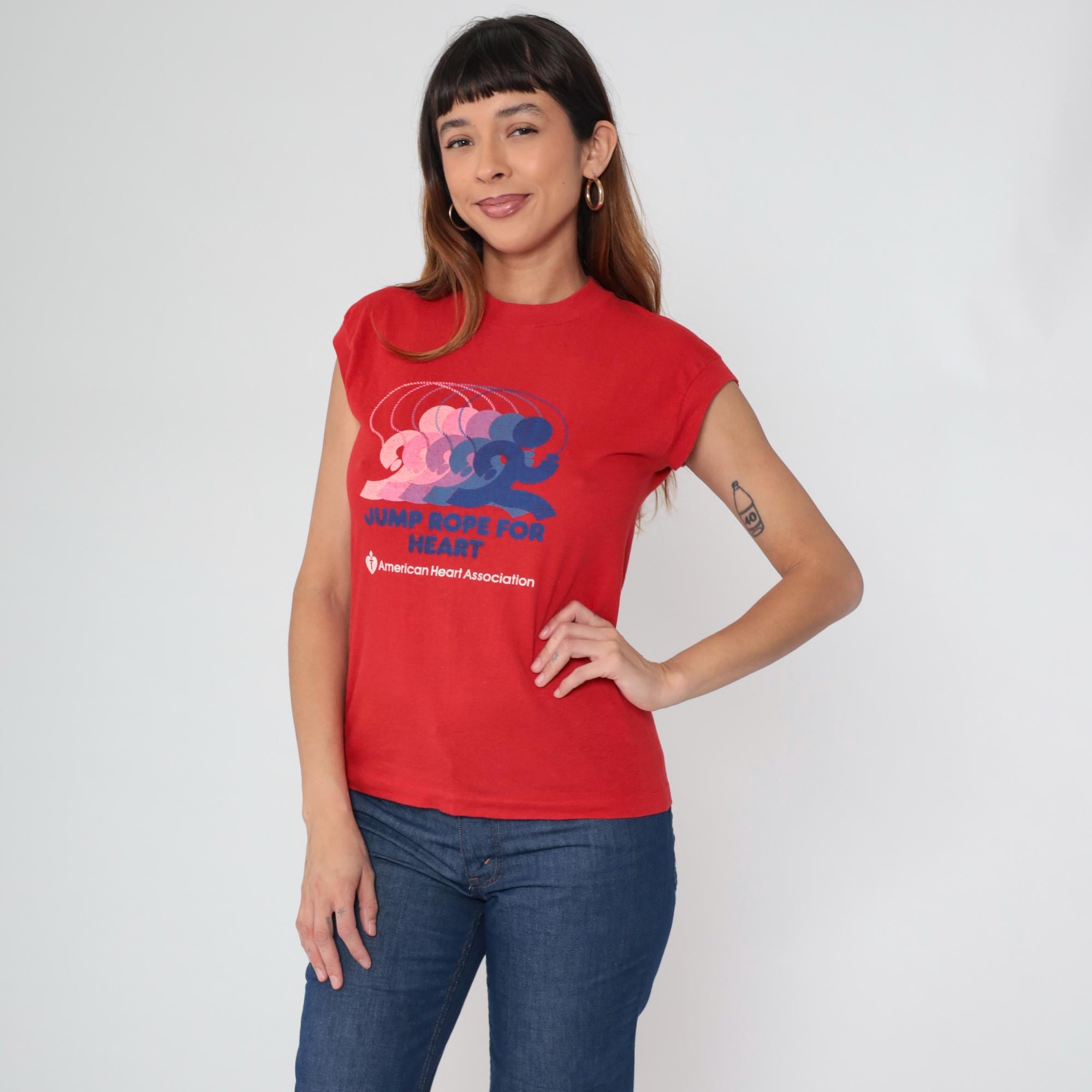 1980s red "Jump Rope for Heart" t-shirt from the American Heart Association. Features a distinctive ombre graphic with jumping figures in pink to blue gradient and white rope details.