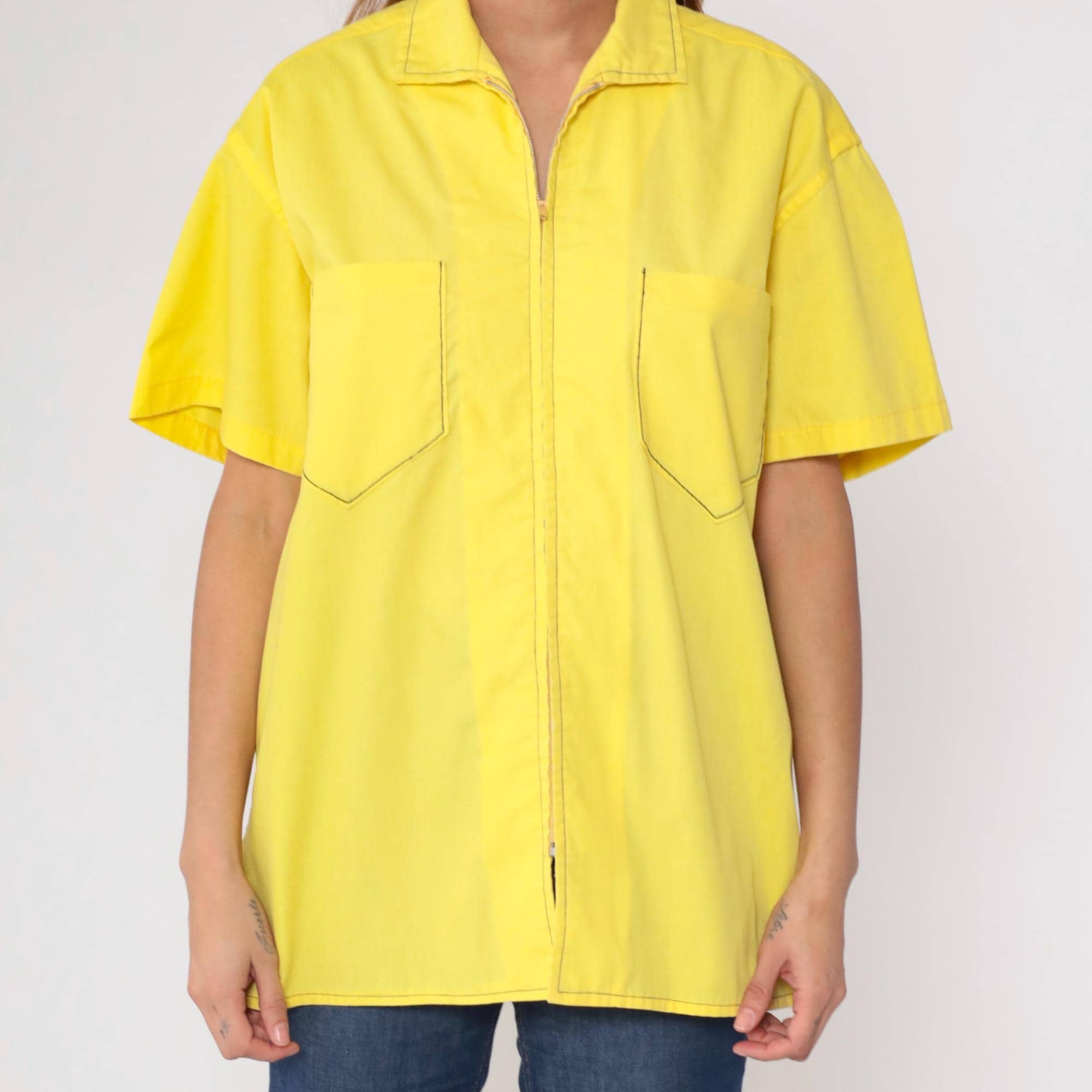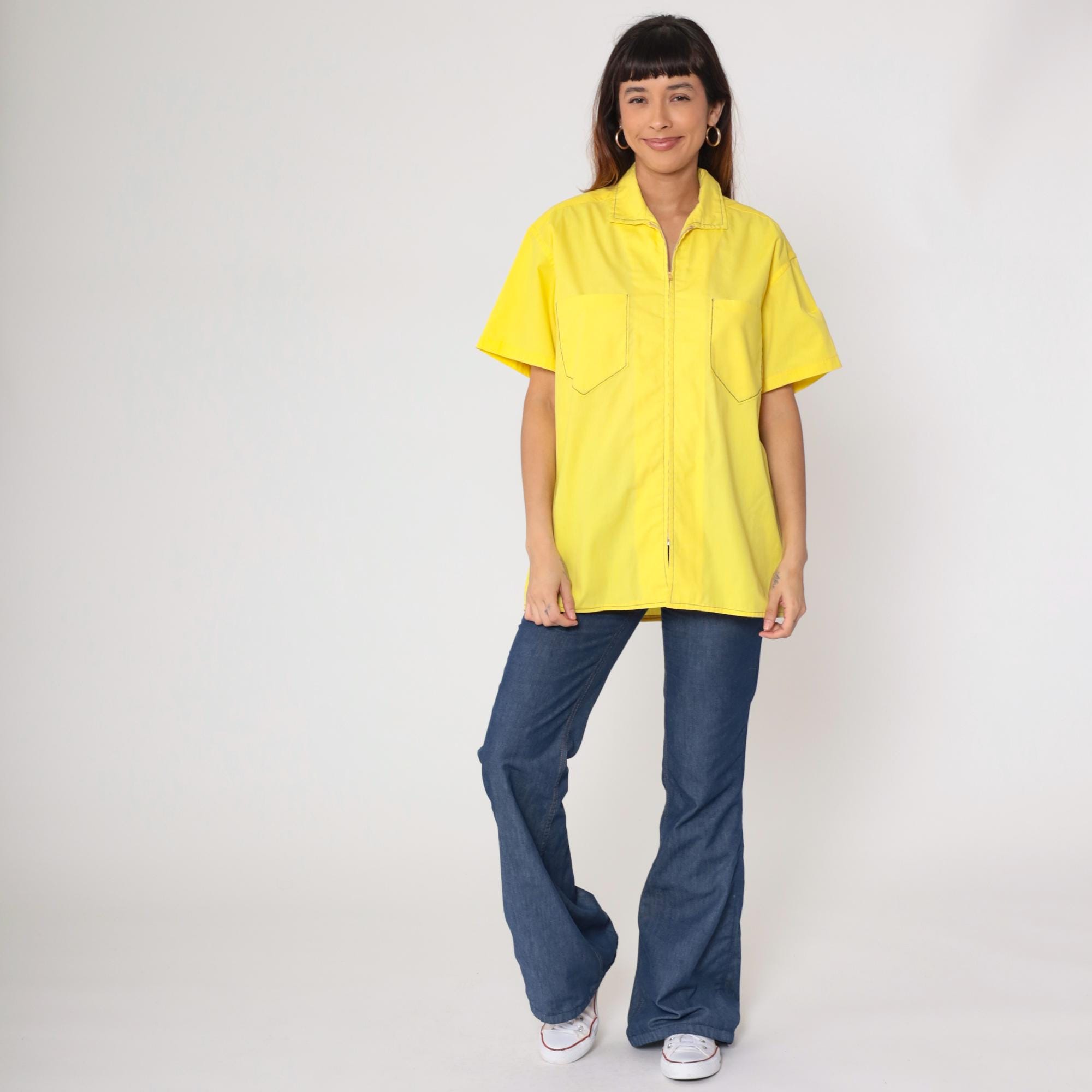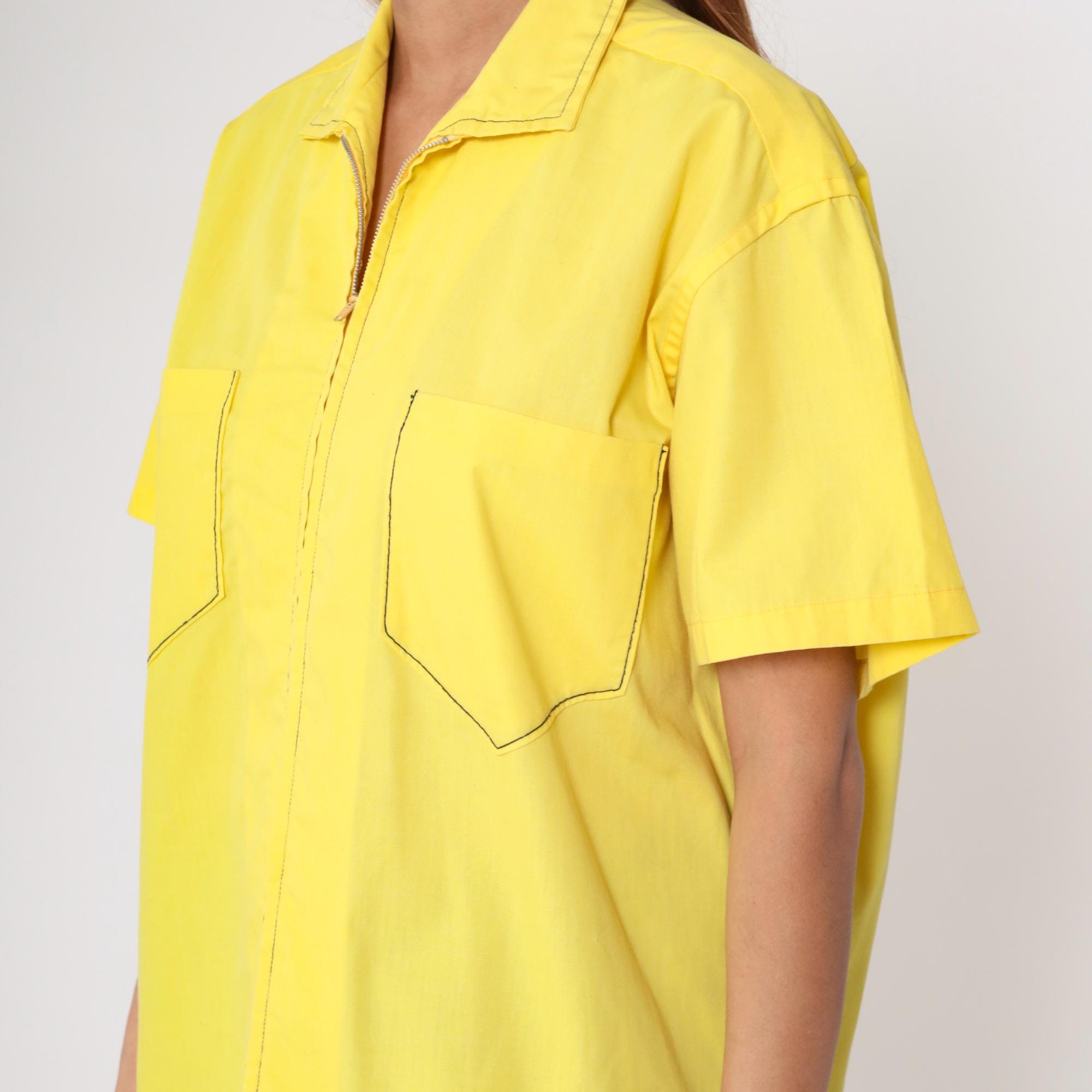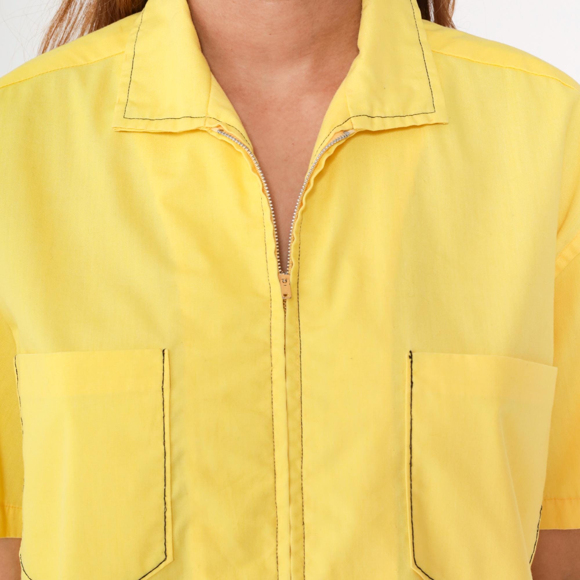 1970s bright yellow zip-front work shirt with utility-style chest pockets featuring contrasting black topstitching. Made from a durable cotton/polyester blend with a substantial feel. Features a collar, full metal zipper closure, and short sleeves. Classic workwear design typical of mechanic and service uniforms of the era.