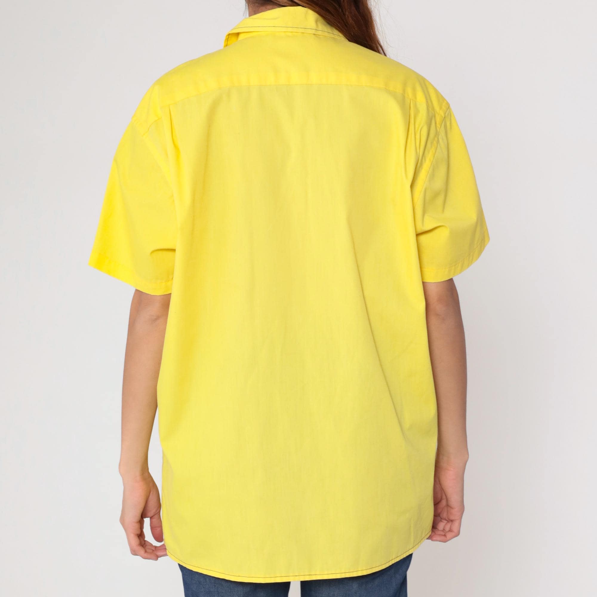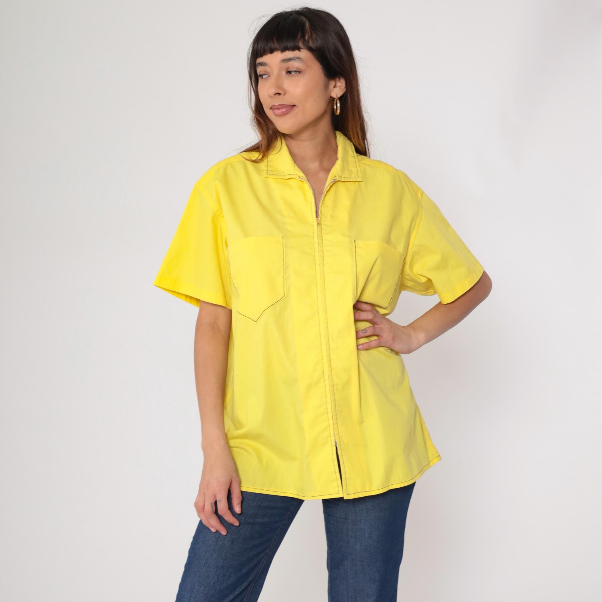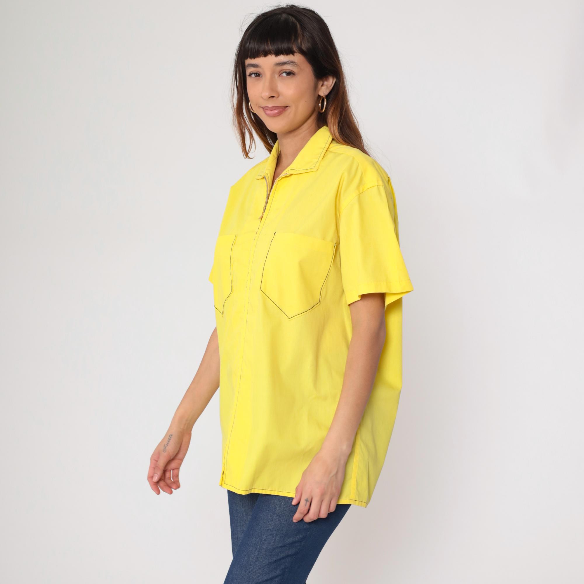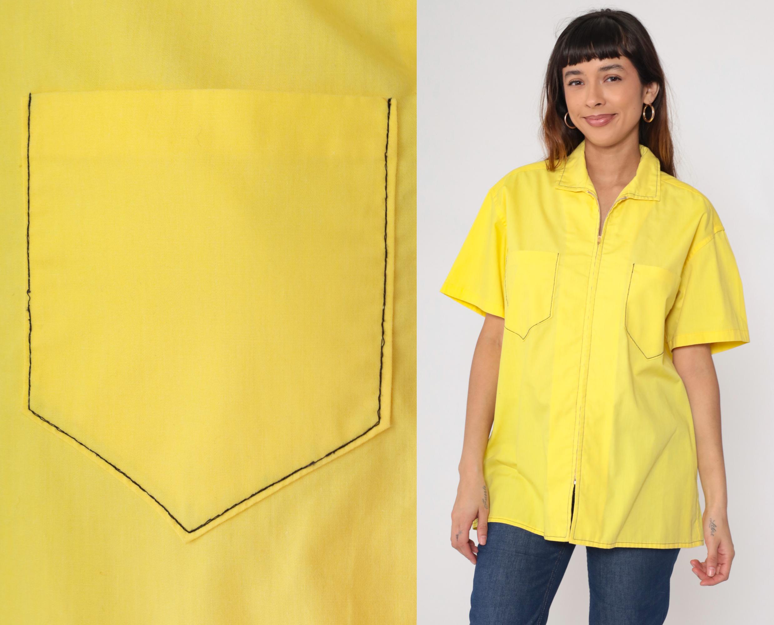 1970s bright yellow zip-front work shirt with utility-style chest pockets featuring contrasting black topstitching. Made from a durable cotton/polyester blend with a substantial feel. Features a collar, full metal zipper closure, and short sleeves. Classic workwear design typical of mechanic and service uniforms of the era.
