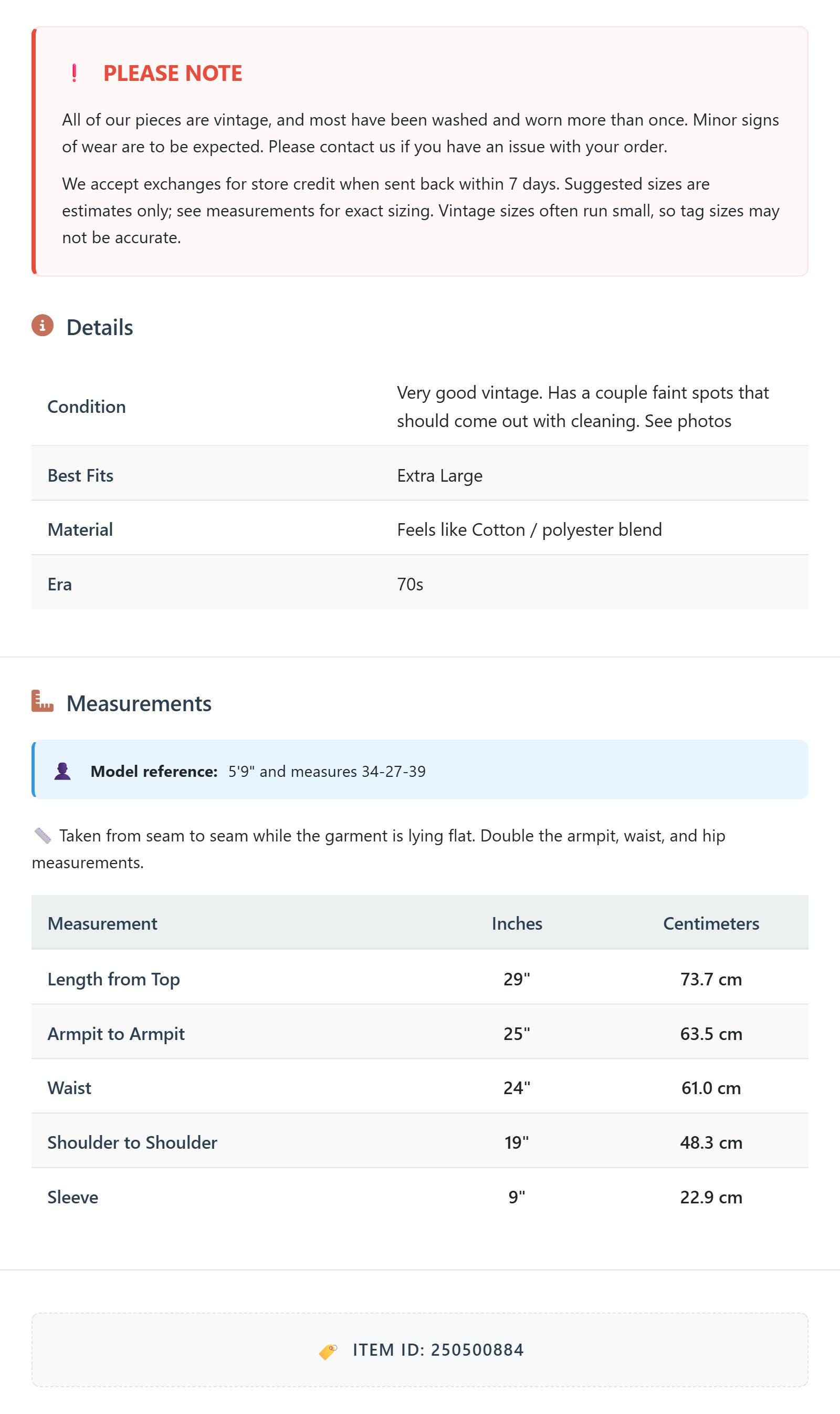 Suggested sizes are estimates only; see measurements for exact sizing. Vintage sizes often run small, so tag sizes may not be accurate.