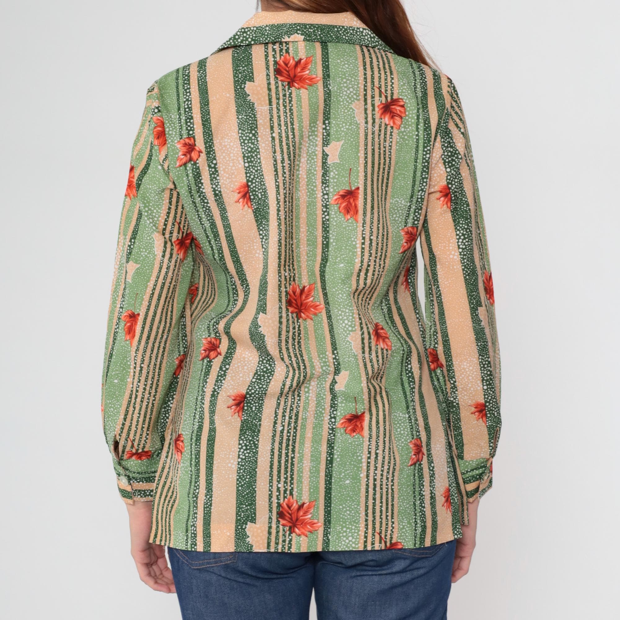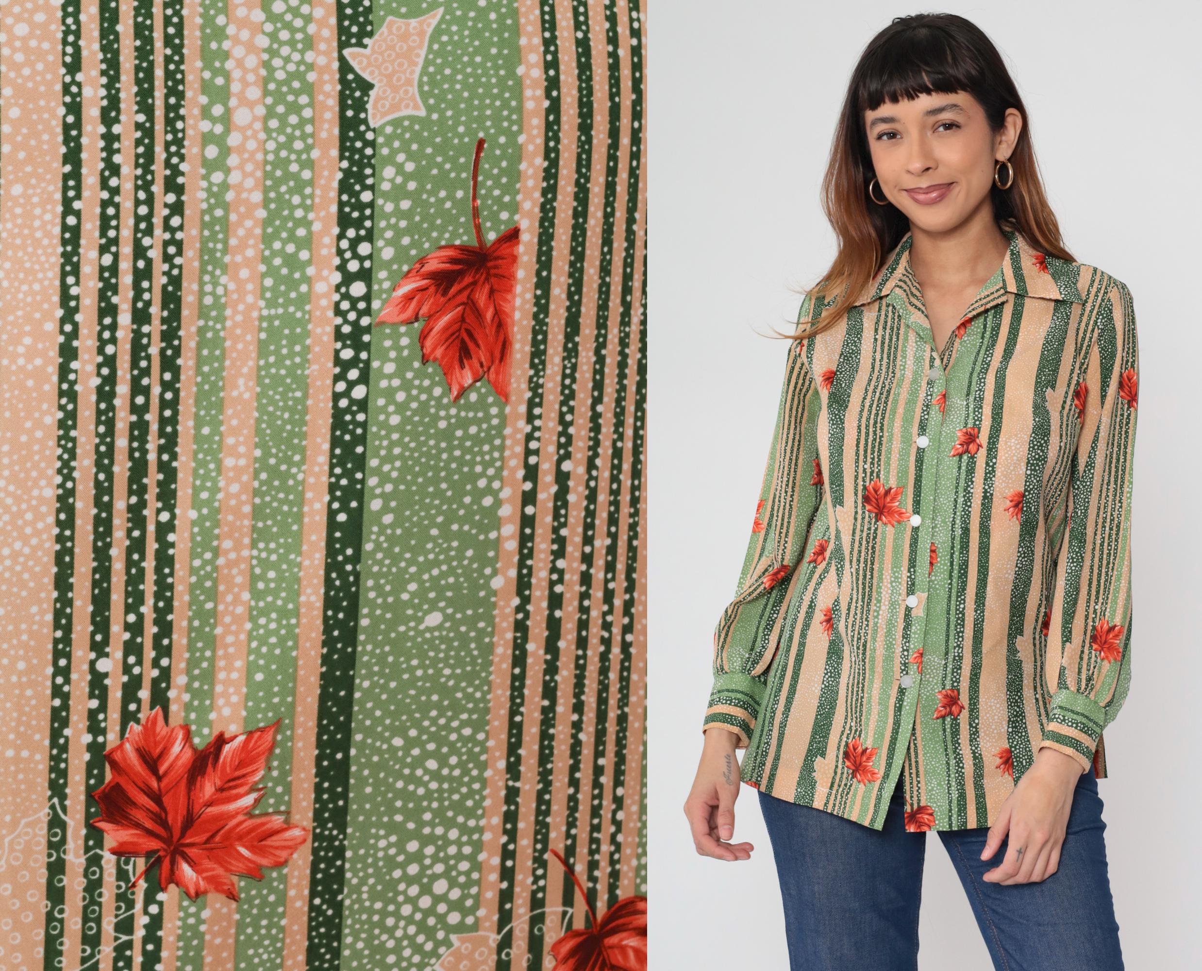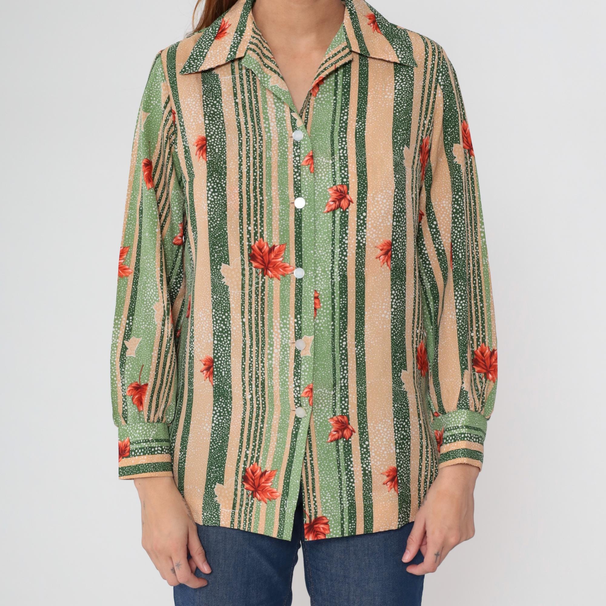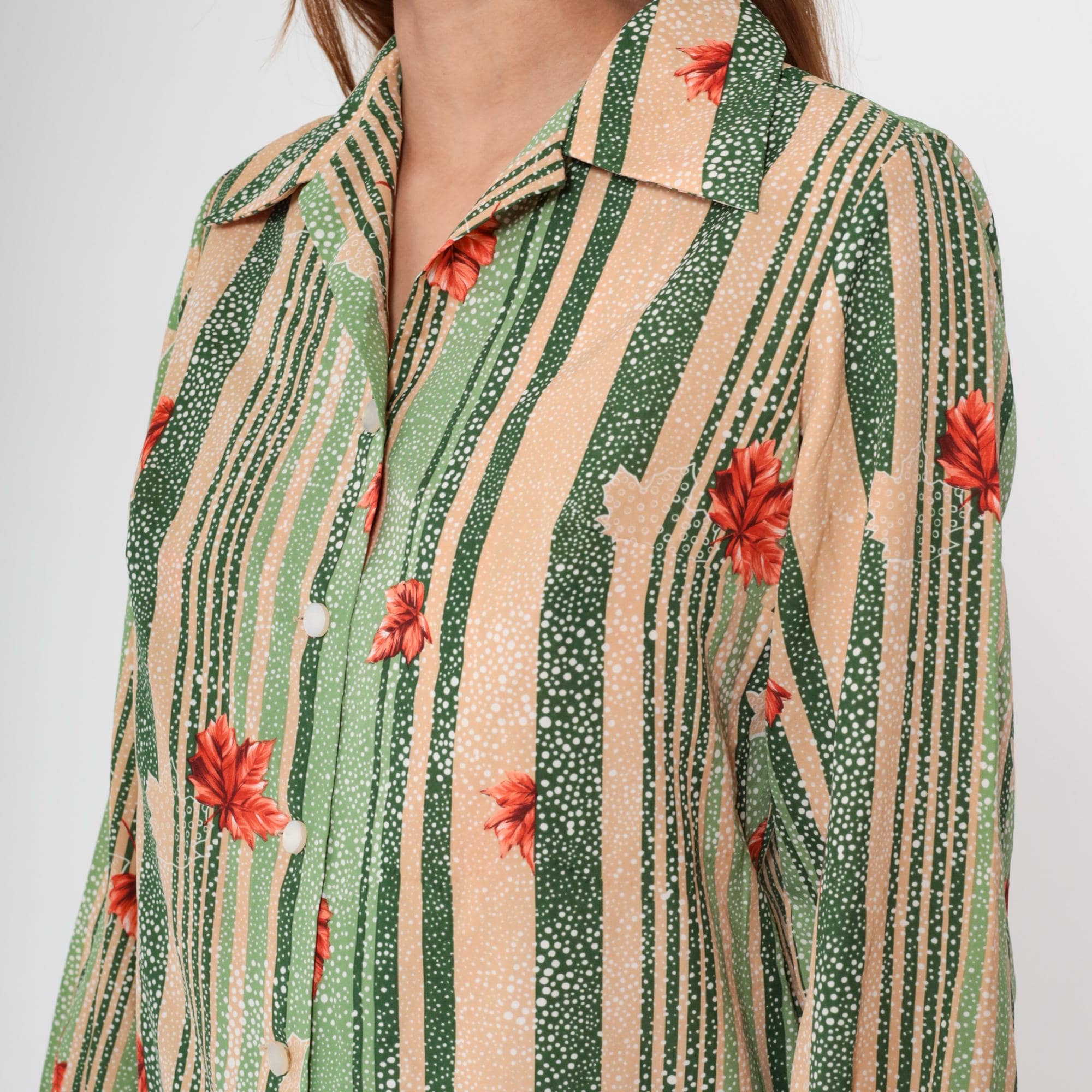 1970s button-up blouse from Pykettes featuring a stunning maple leaf print in rich burnt orange against green and peach striped background with white polka dot accents. Made from a lightweight polyester fabric with excellent drape. Features a pointed collar, long sleeves with button cuffs, and front button closure with white buttons.