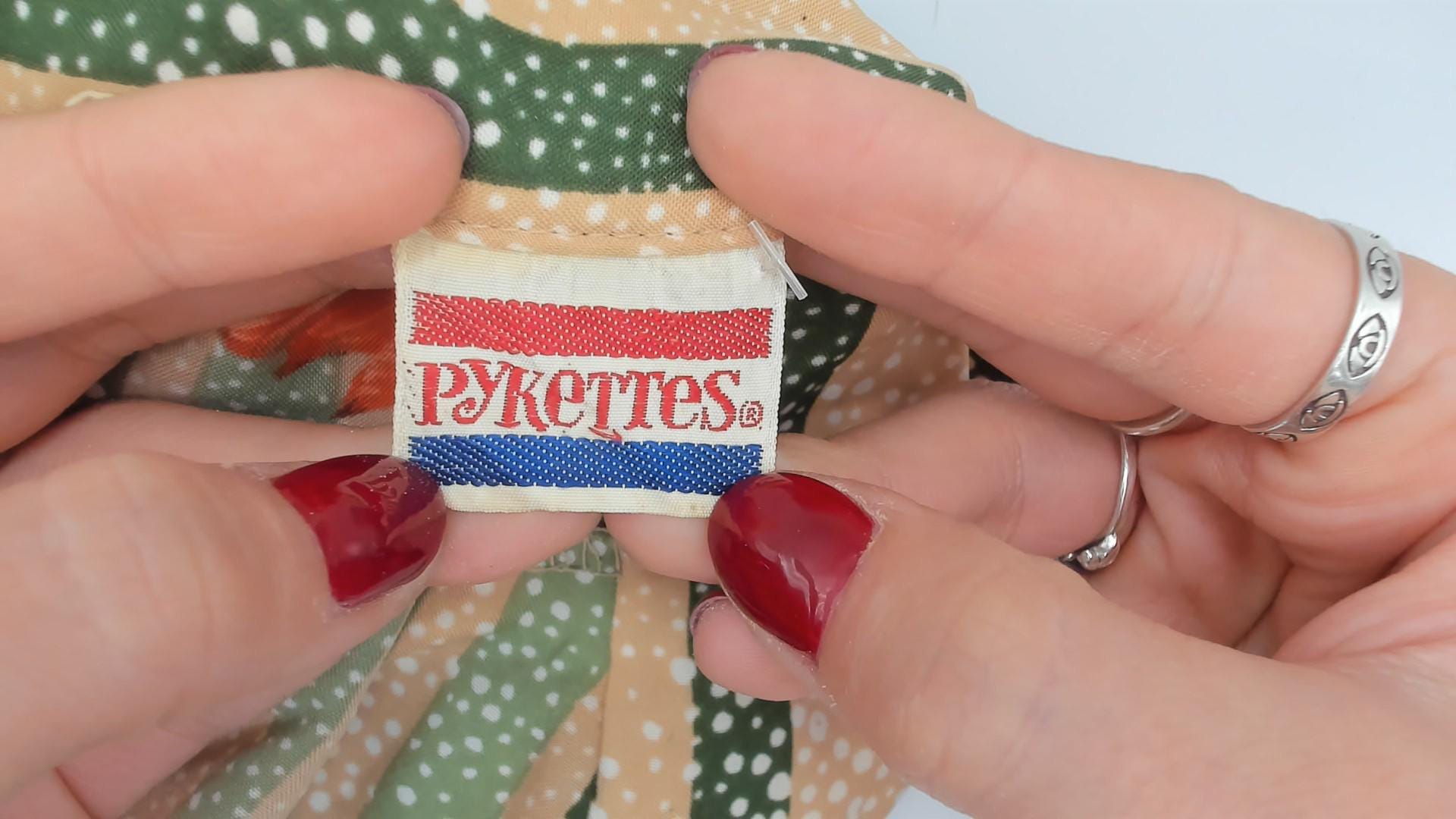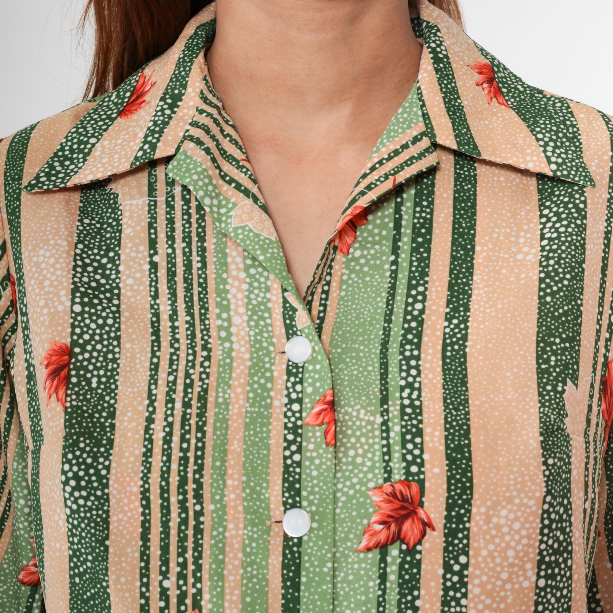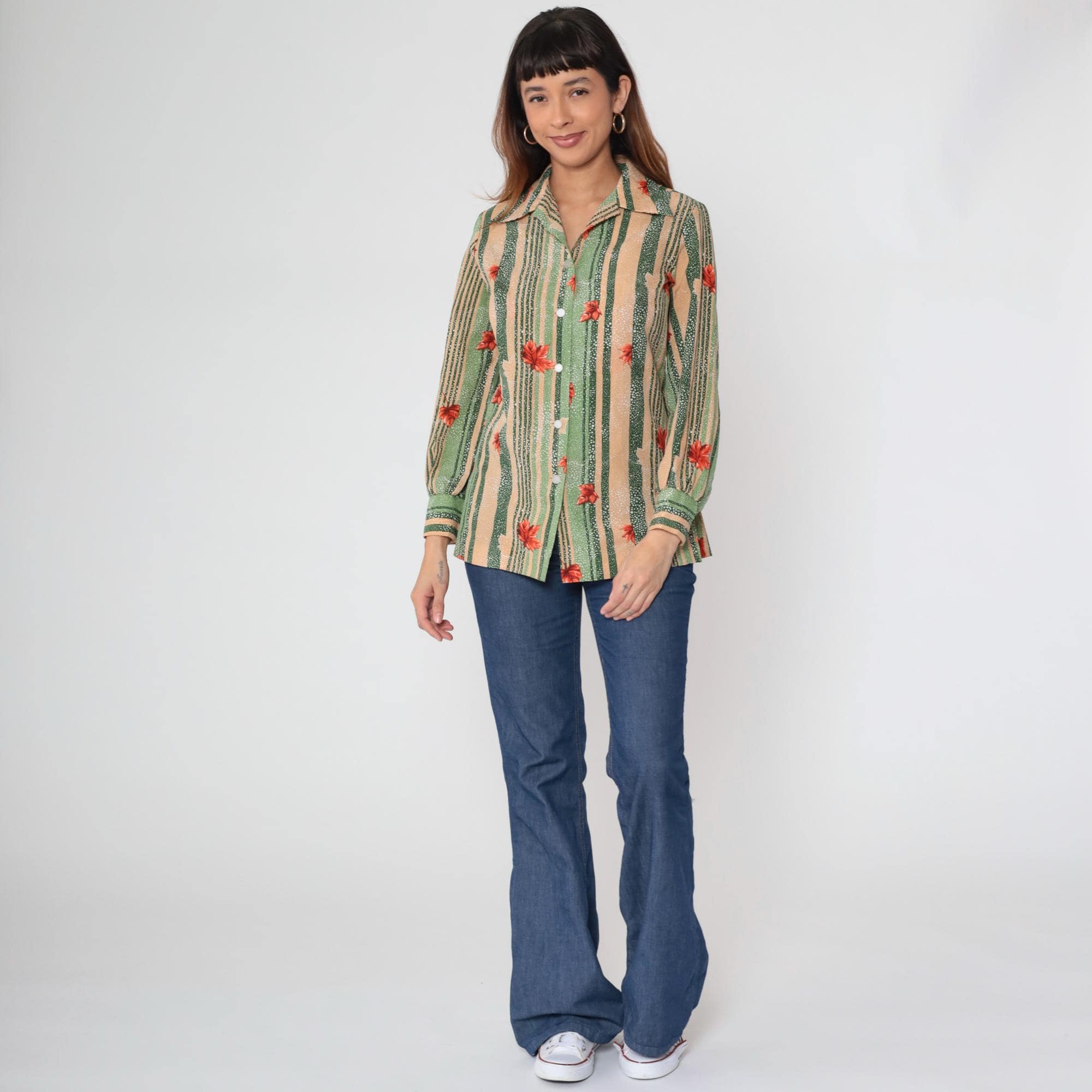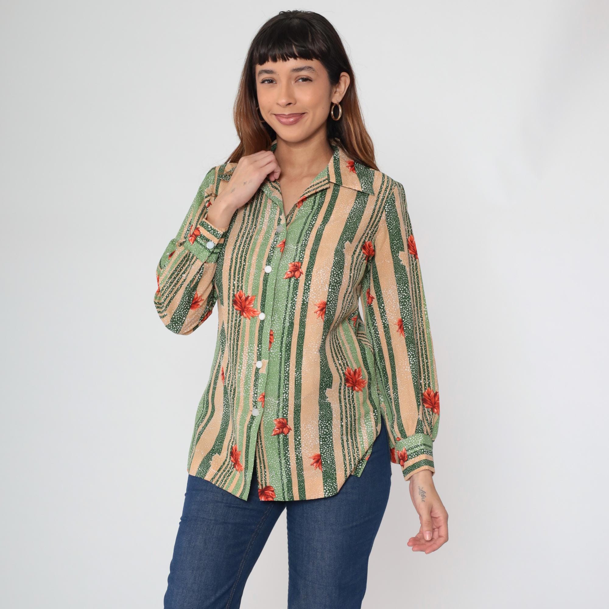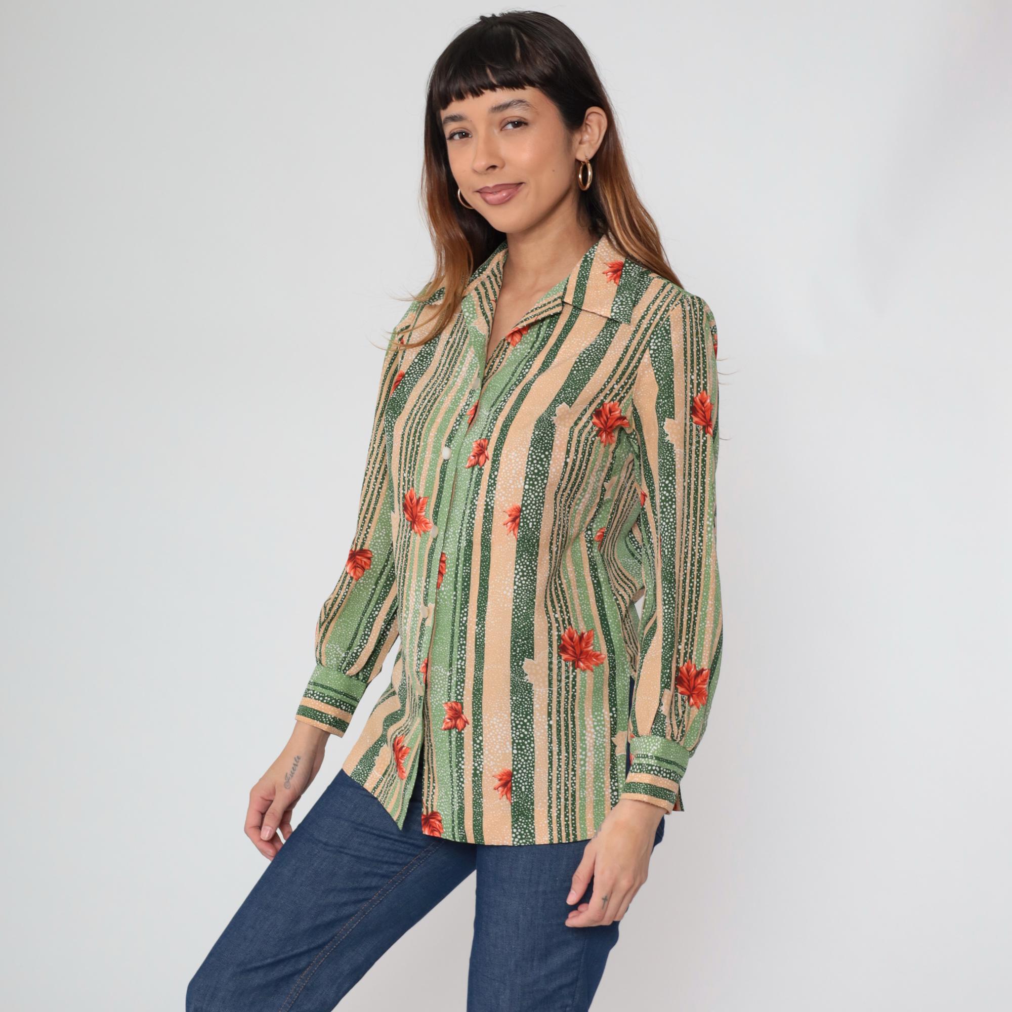 1970s button-up blouse from Pykettes featuring a stunning maple leaf print in rich burnt orange against green and peach striped background with white polka dot accents. Made from a lightweight polyester fabric with excellent drape. Features a pointed collar, long sleeves with button cuffs, and front button closure with white buttons.