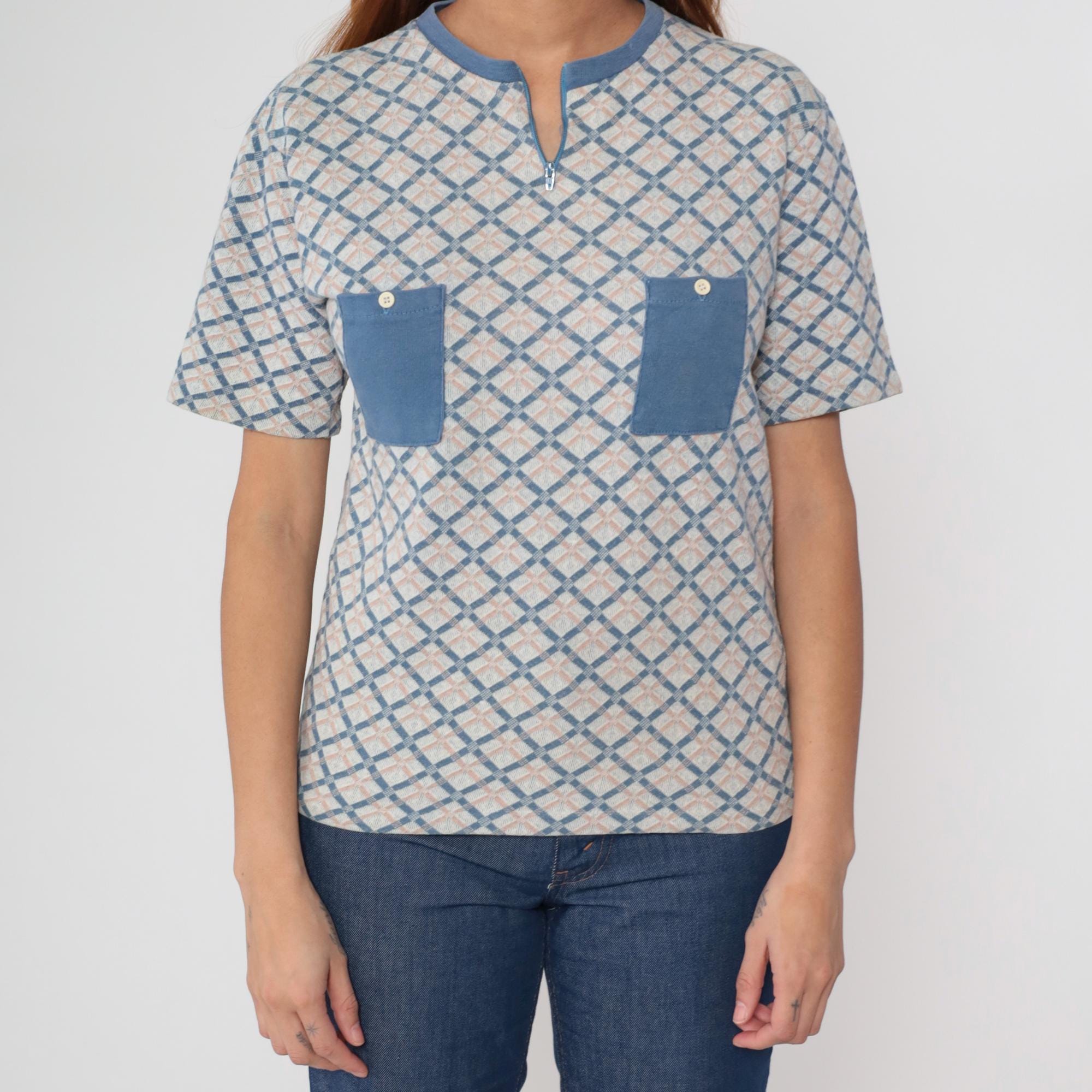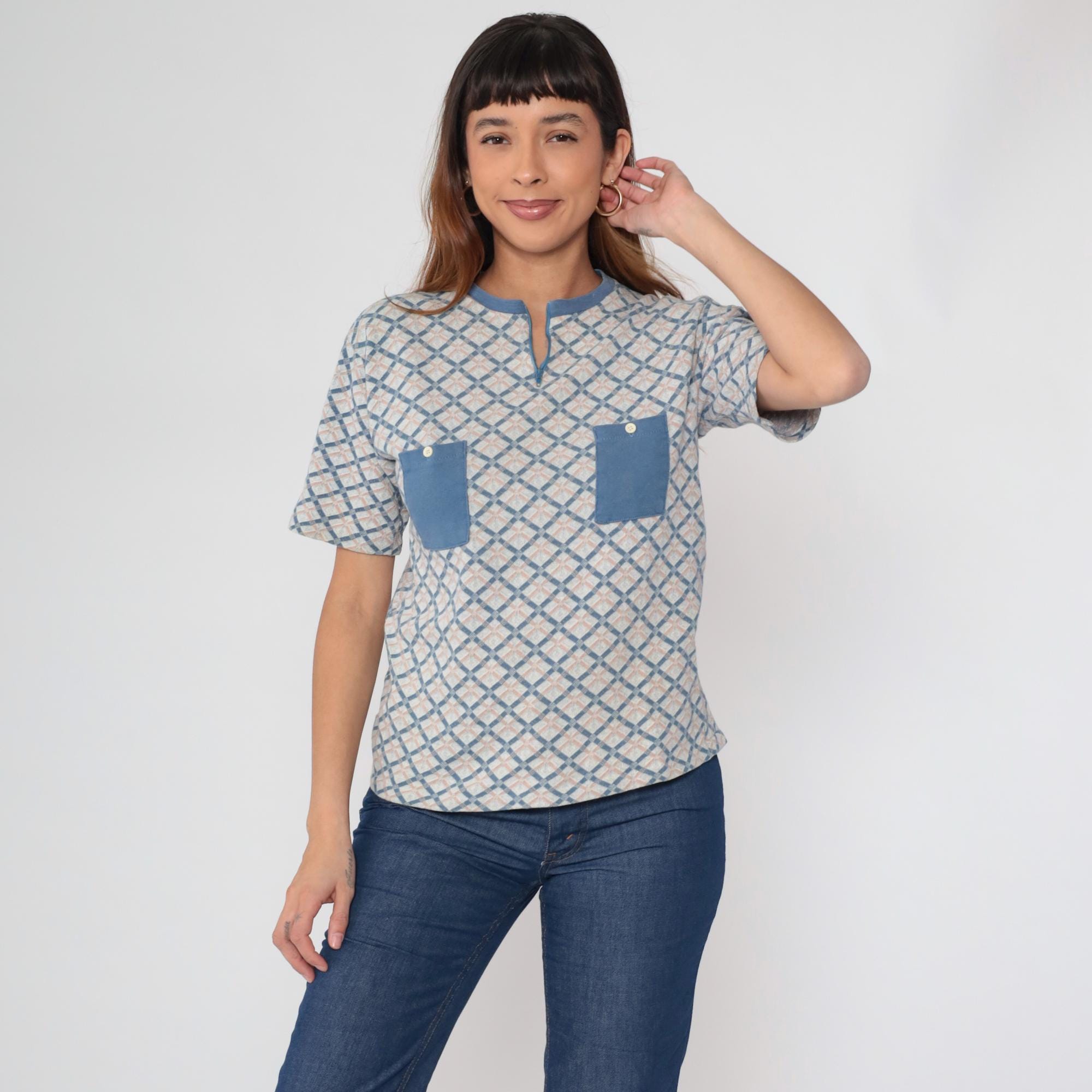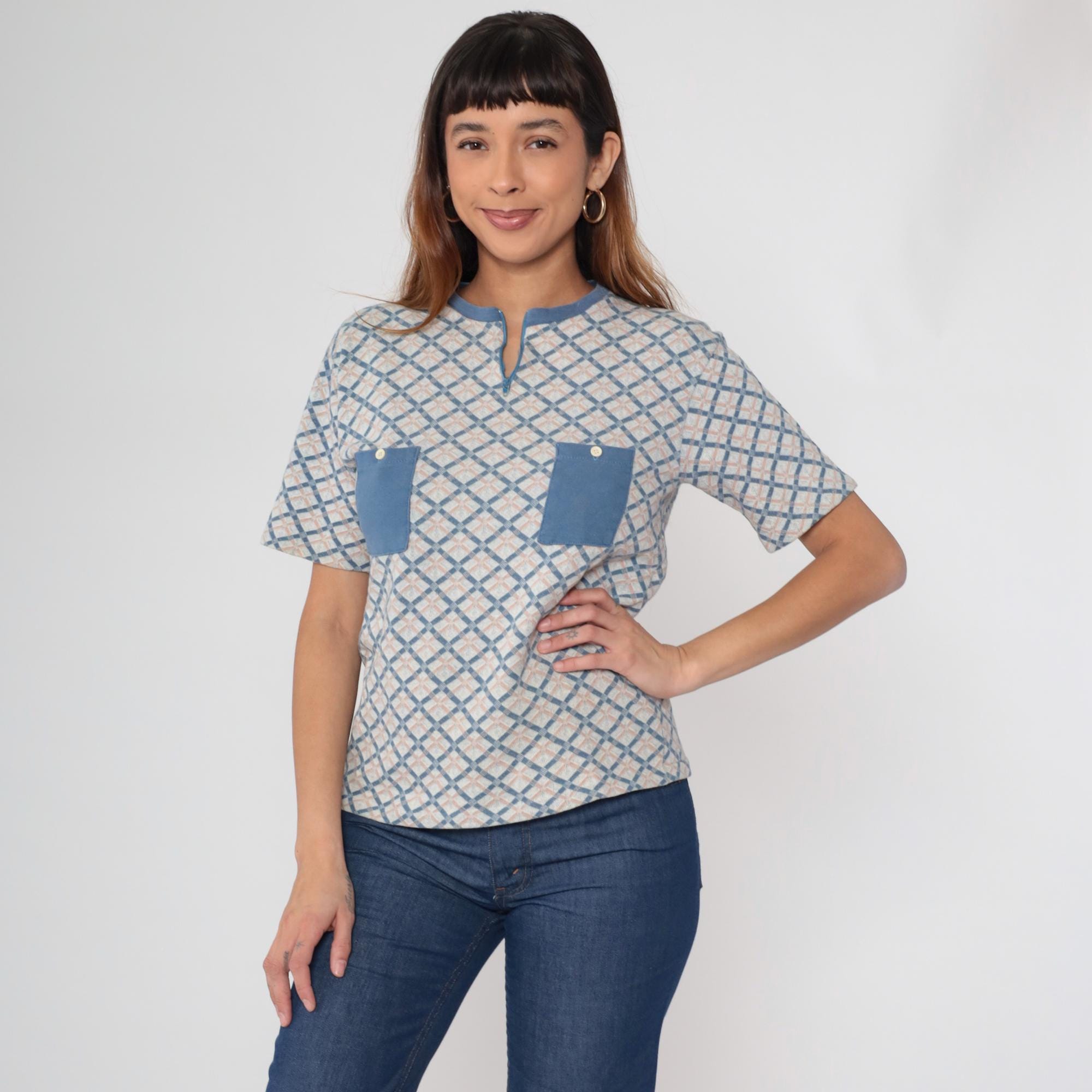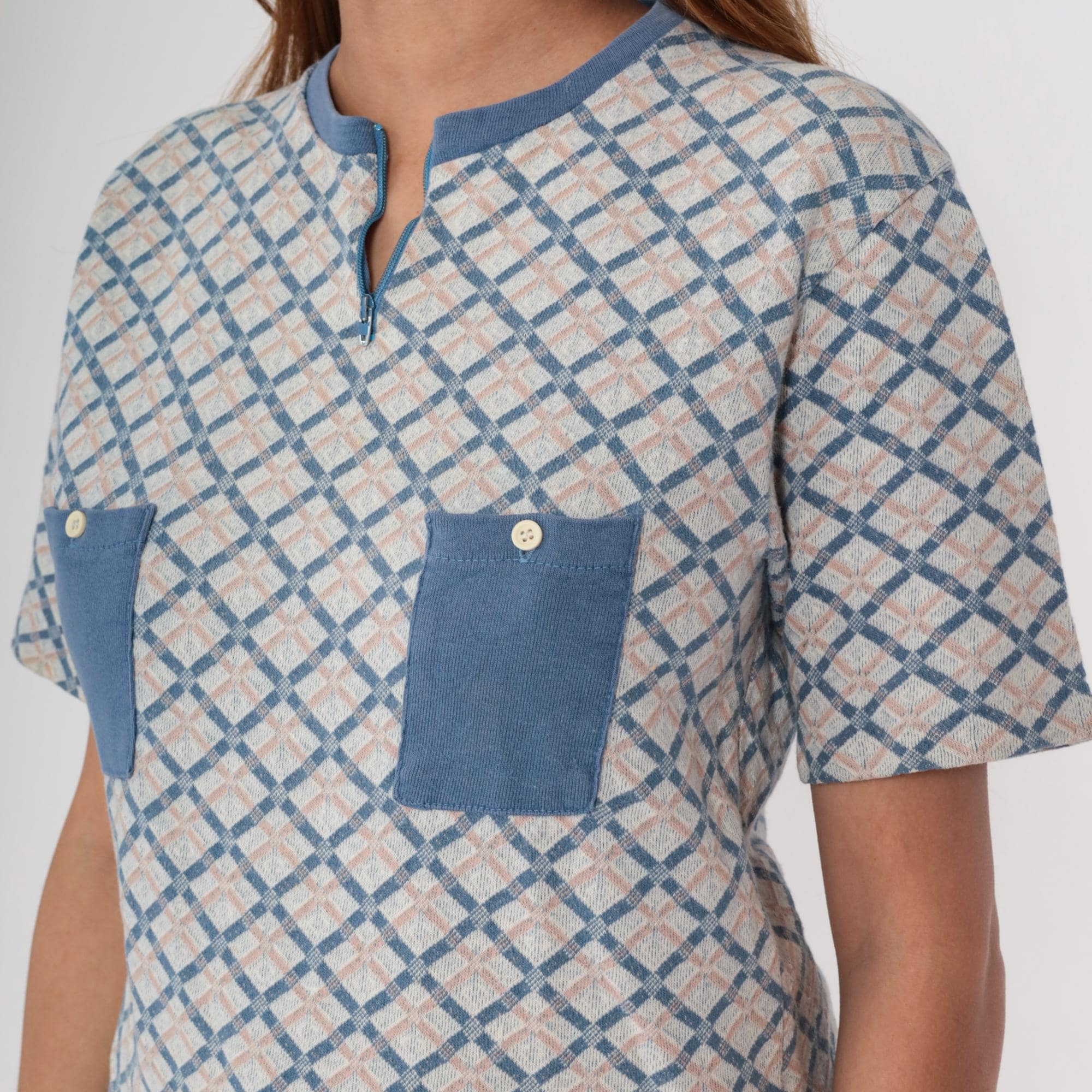 1970s diamond pattern knit top by Mr. Alfred of California. Features a classic henley-style split neckline and two functional chest pockets with button closures. Short sleeves with ribbed blue trim matching the neckline. Distinctive geometric diamond pattern in blue and peach on cream background. Pull-over style with a small zipper closure on neck.
