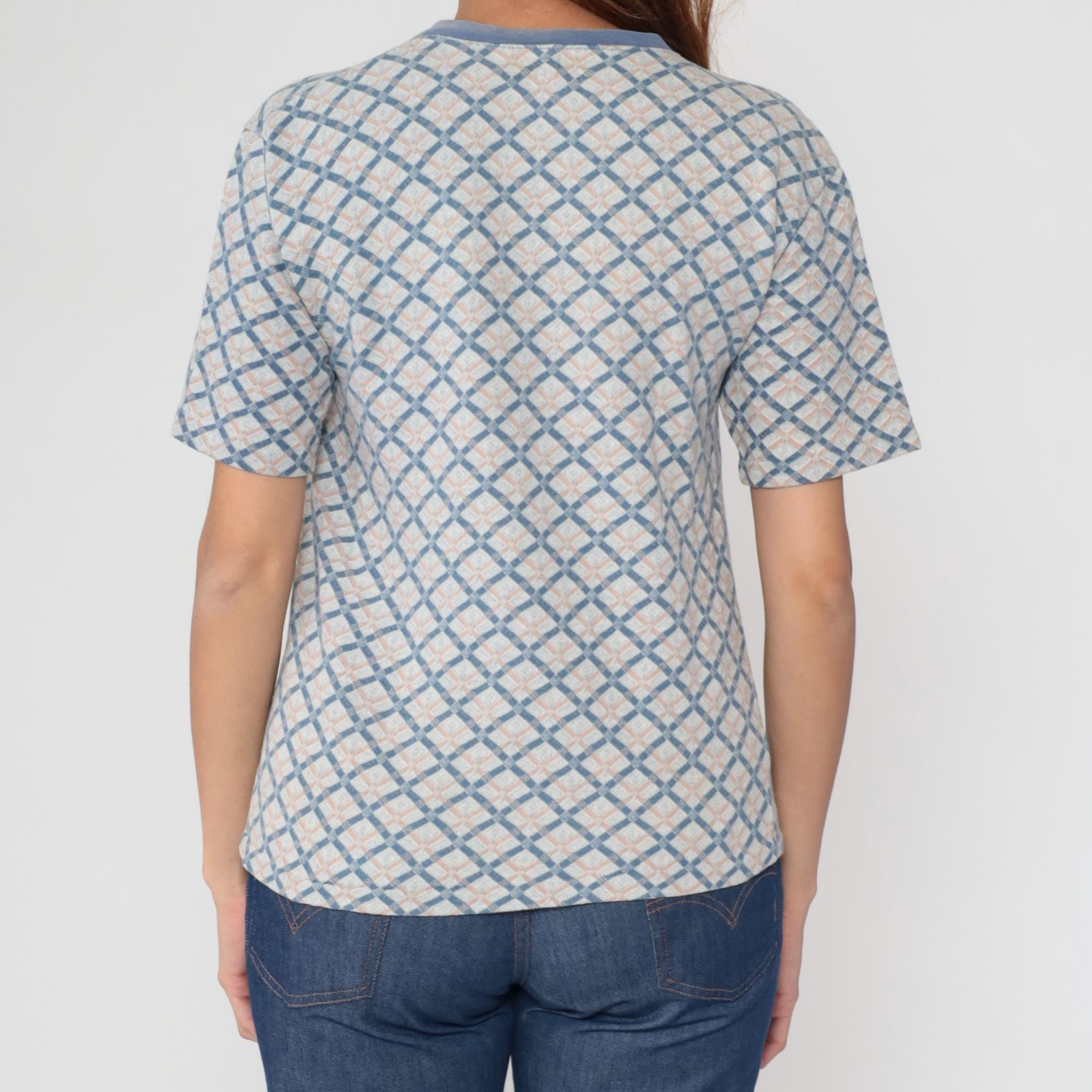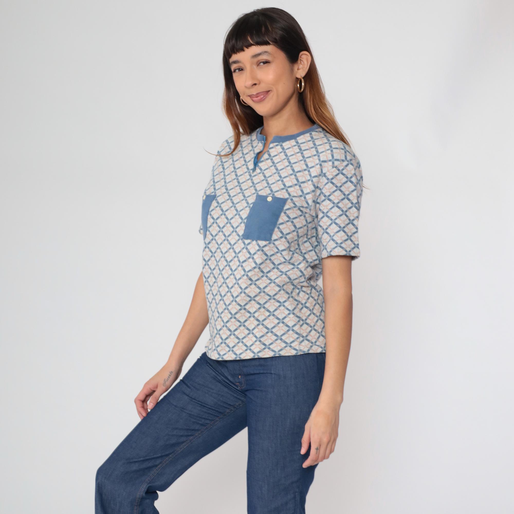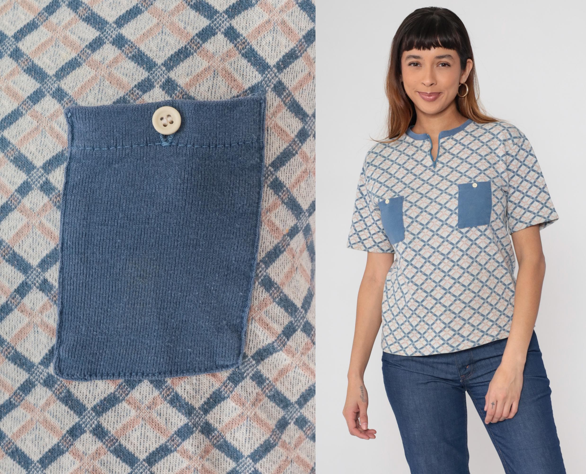 1970s diamond pattern knit top by Mr. Alfred of California. Features a classic henley-style split neckline and two functional chest pockets with button closures. Short sleeves with ribbed blue trim matching the neckline. Distinctive geometric diamond pattern in blue and peach on cream background. Pull-over style with a small zipper closure on neck.