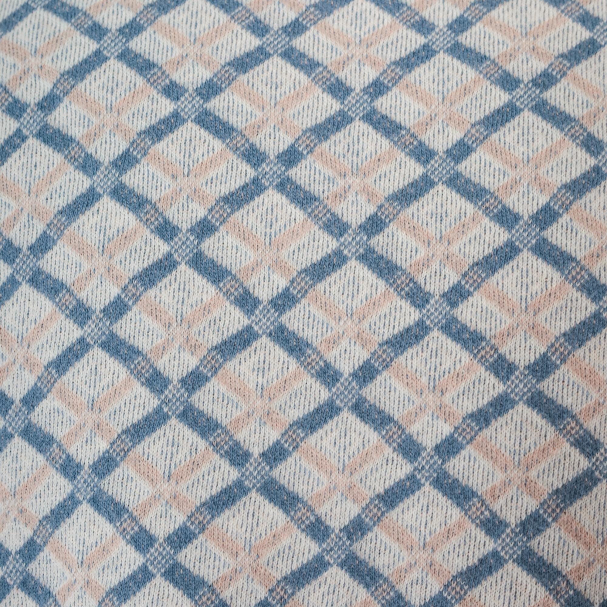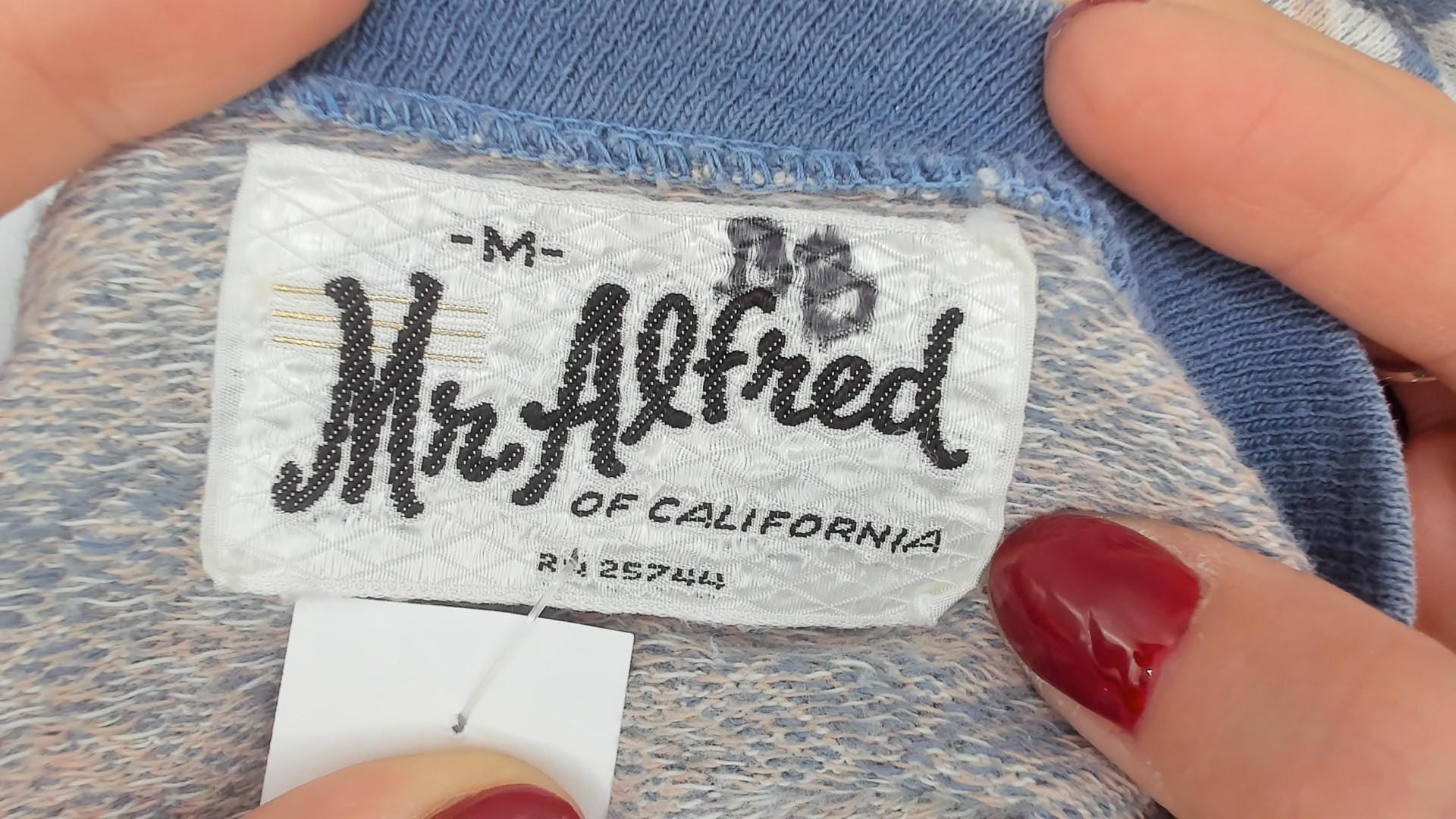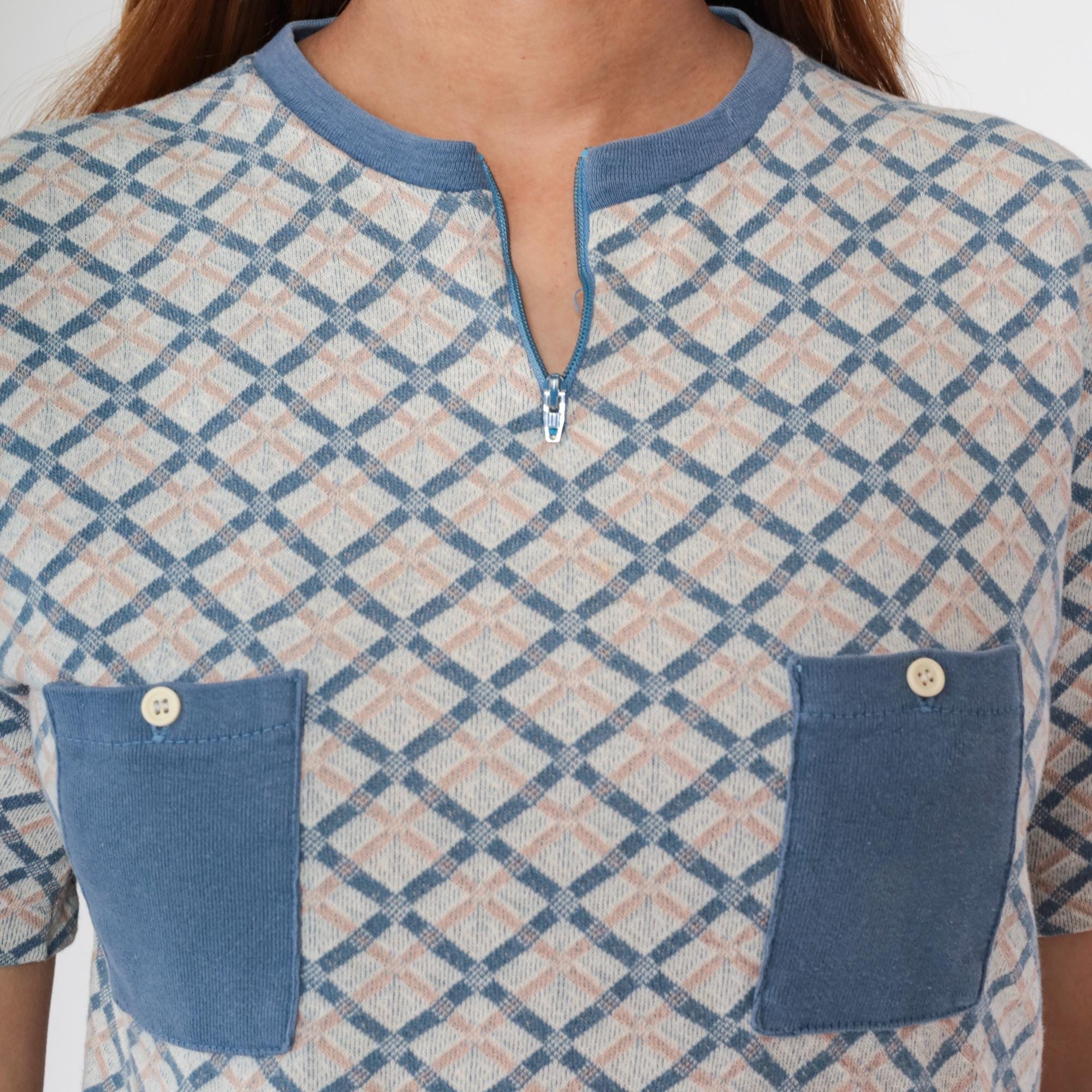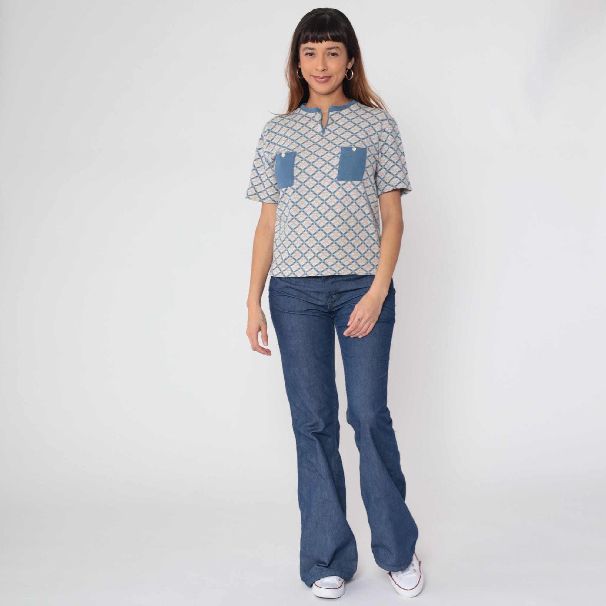 1970s diamond pattern knit top by Mr. Alfred of California. Features a classic henley-style split neckline and two functional chest pockets with button closures. Short sleeves with ribbed blue trim matching the neckline. Distinctive geometric diamond pattern in blue and peach on cream background. Pull-over style with a small zipper closure on neck.
