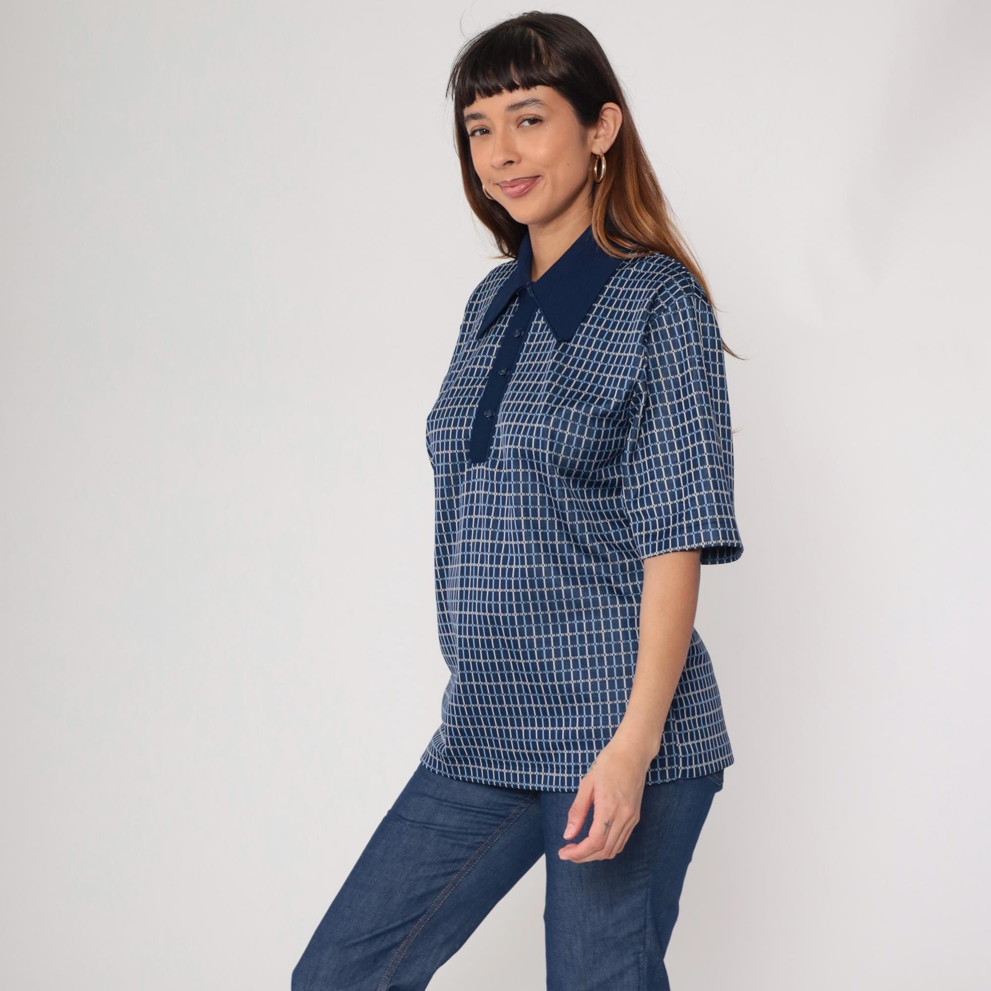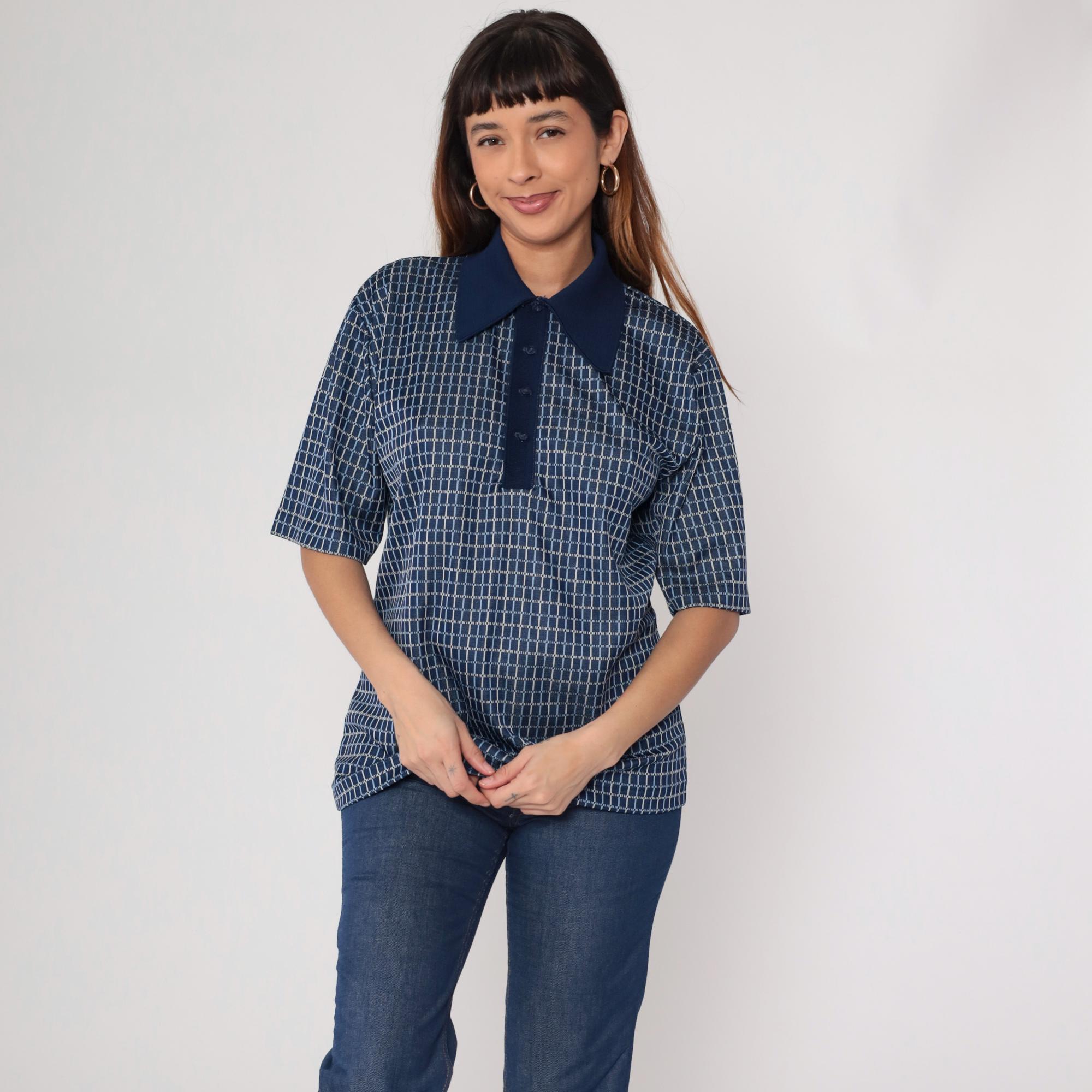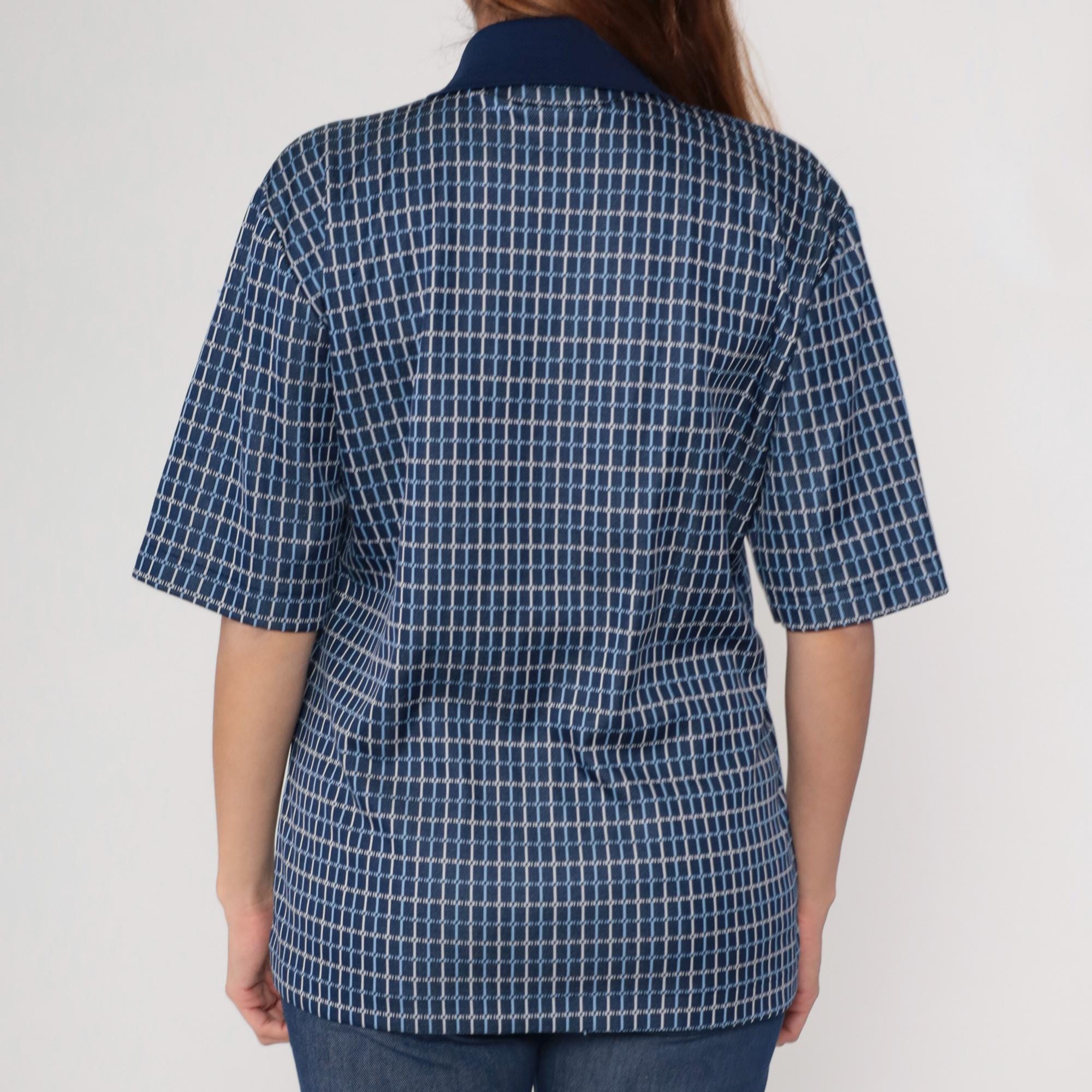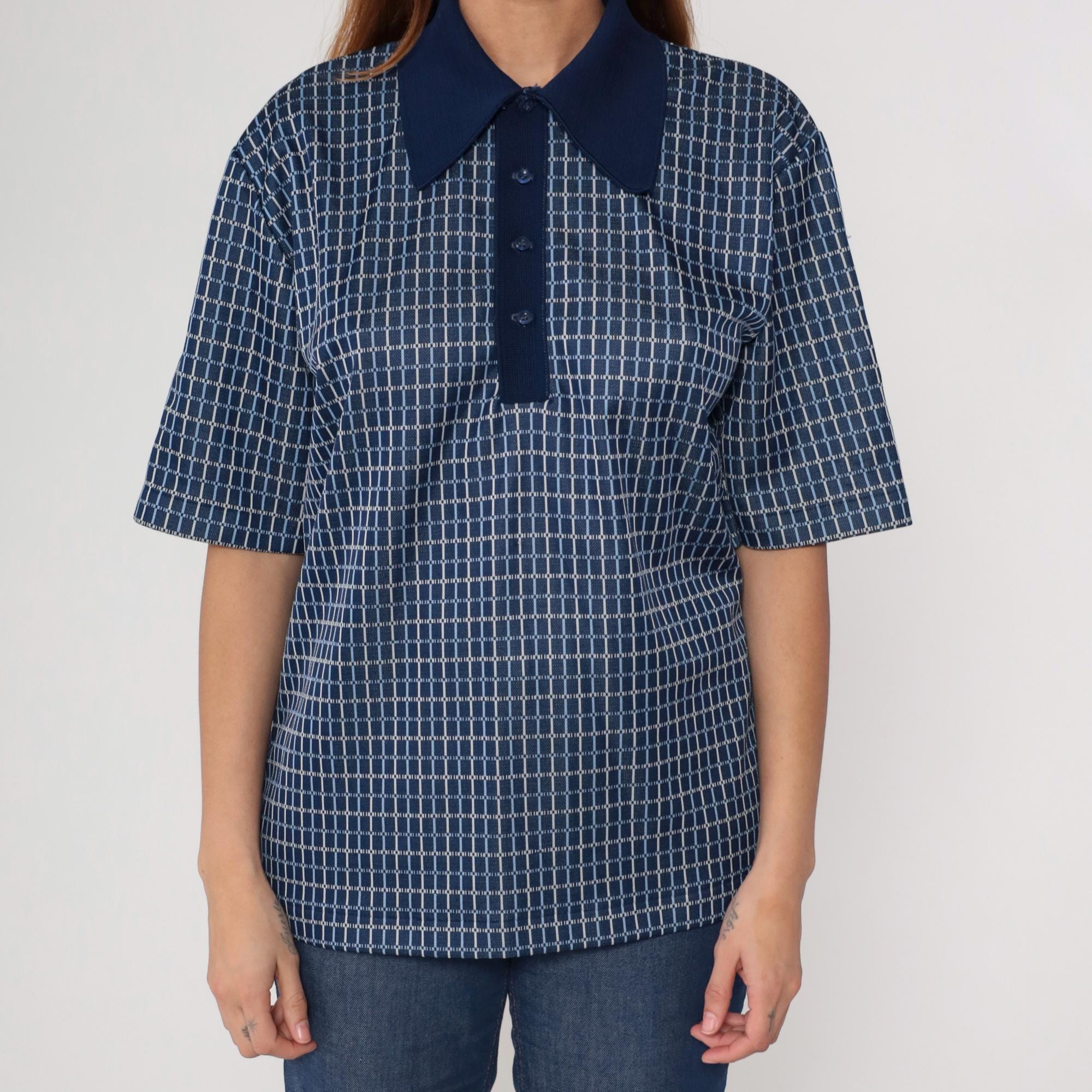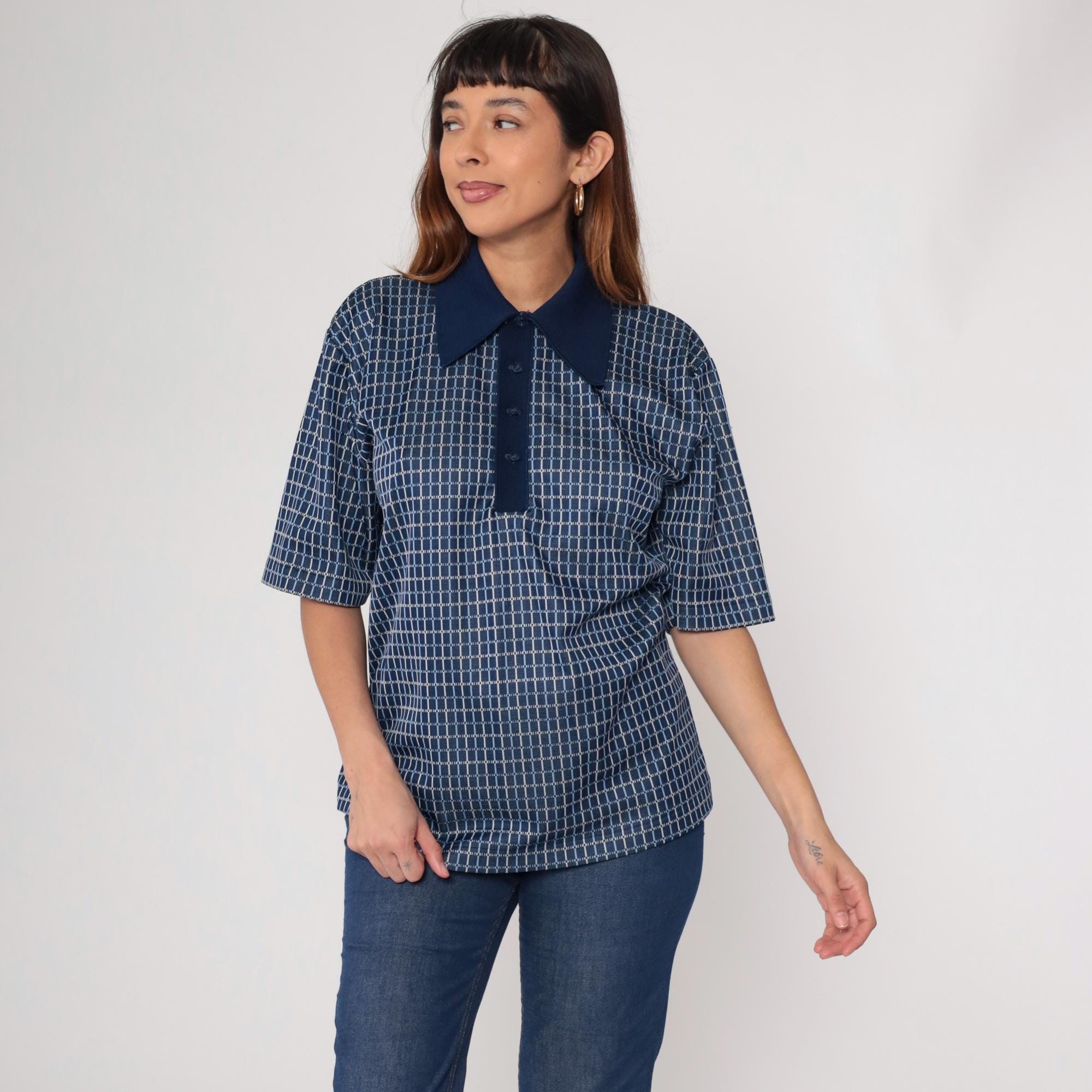 1970s navy blue geometric grid pattern polo top by Leonardo Strassi, an Italian designer brand. Features a classic navy collar with matching four-button placket and short sleeves. All-over distinctive grid pattern in navy blue with white linear detailing creates a sophisticated optical effect.