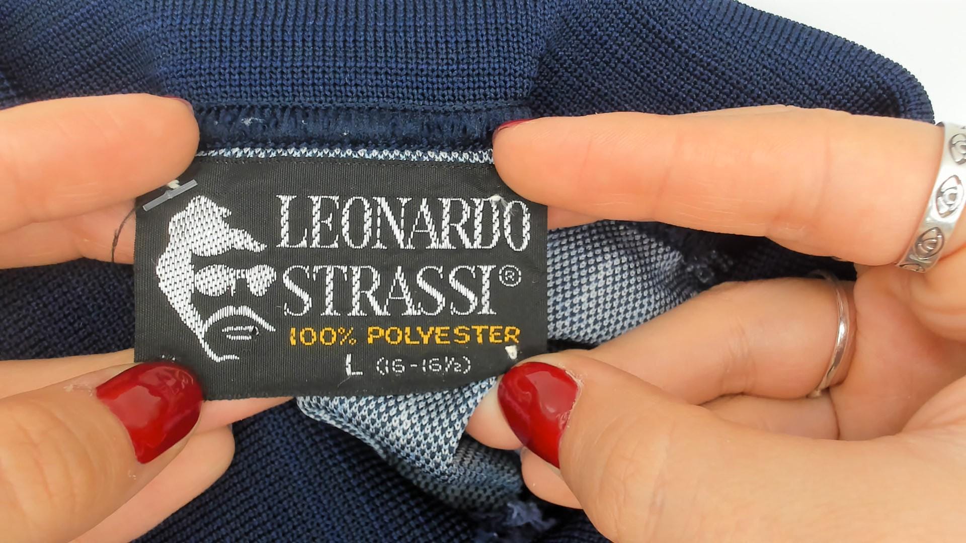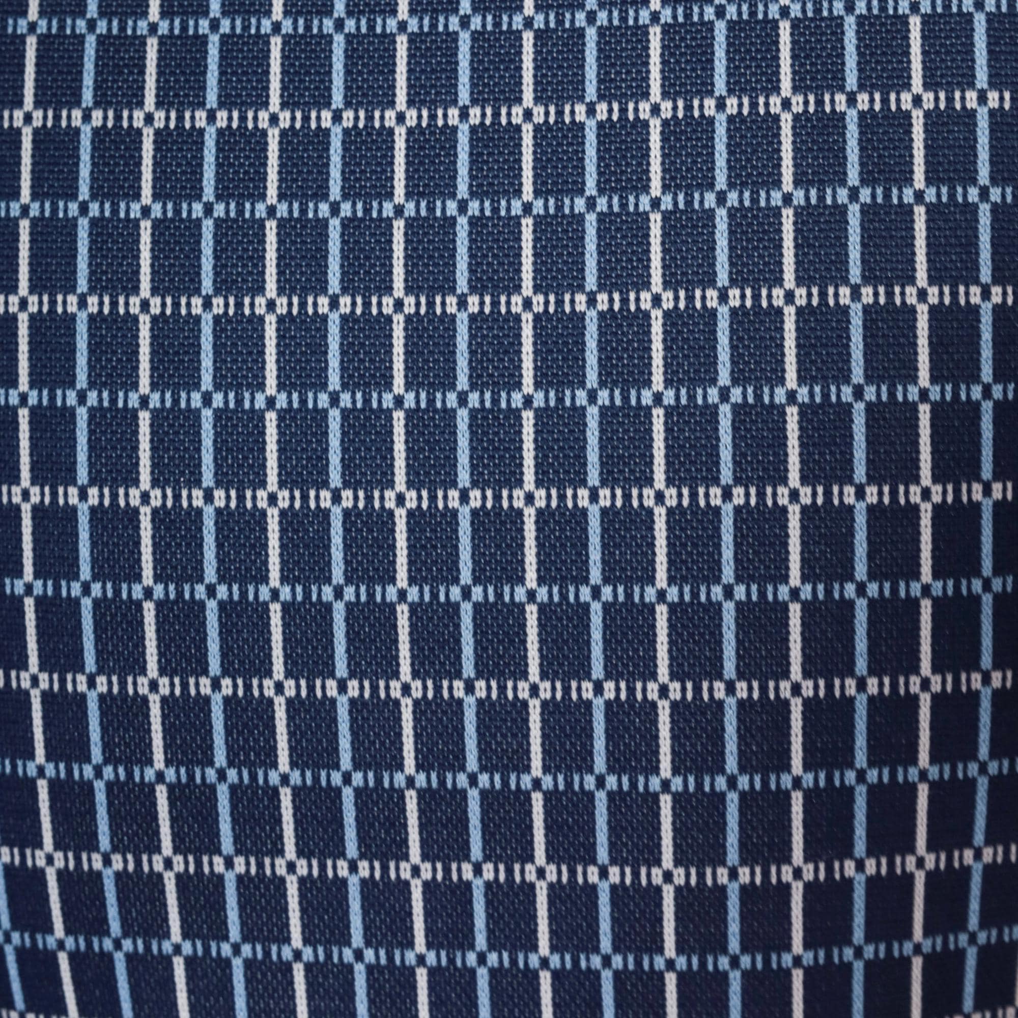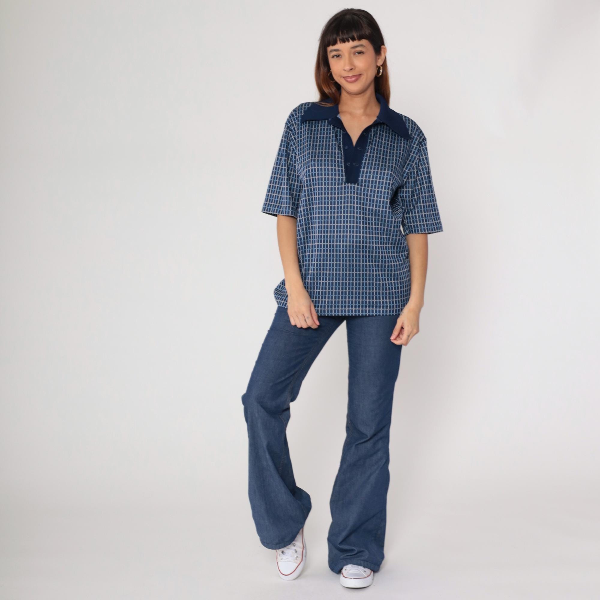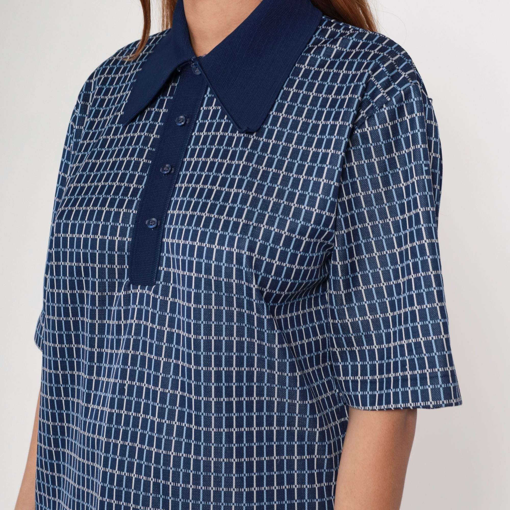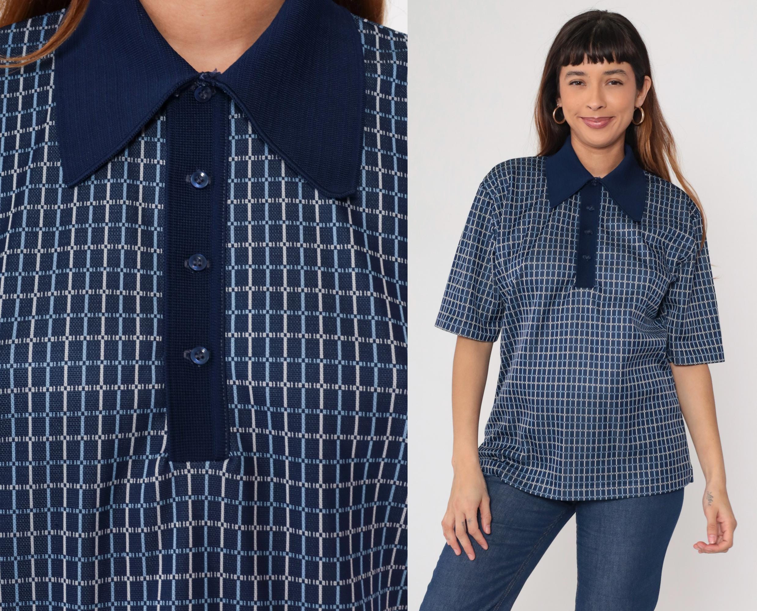 1970s navy blue geometric grid pattern polo top by Leonardo Strassi, an Italian designer brand. Features a classic navy collar with matching four-button placket and short sleeves. All-over distinctive grid pattern in navy blue with white linear detailing creates a sophisticated optical effect.
