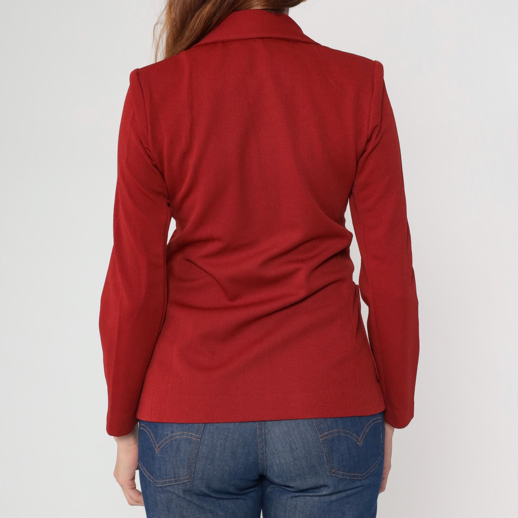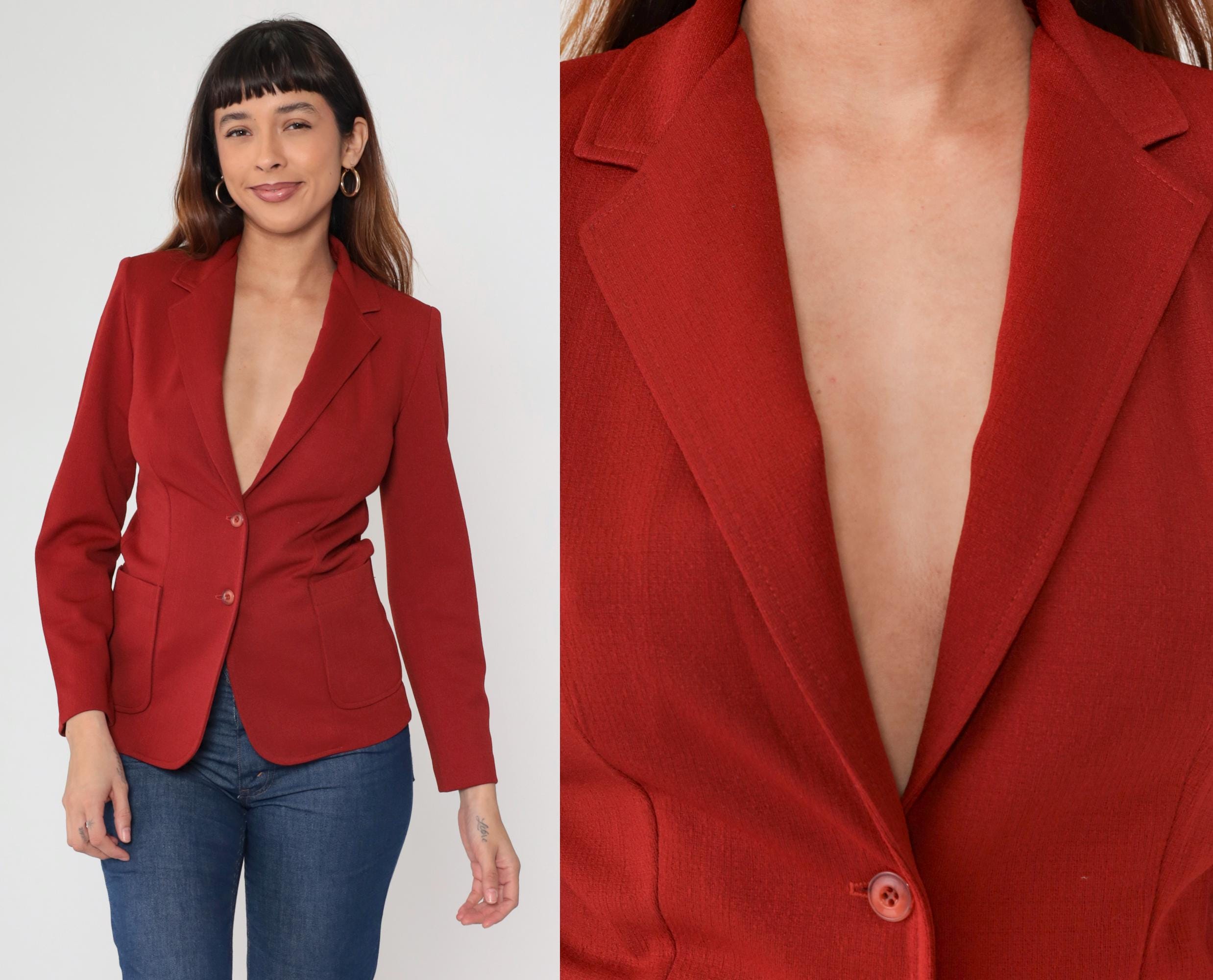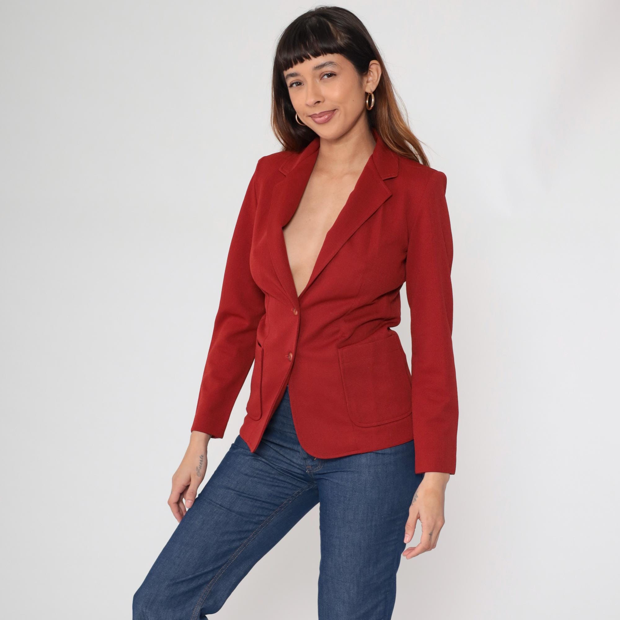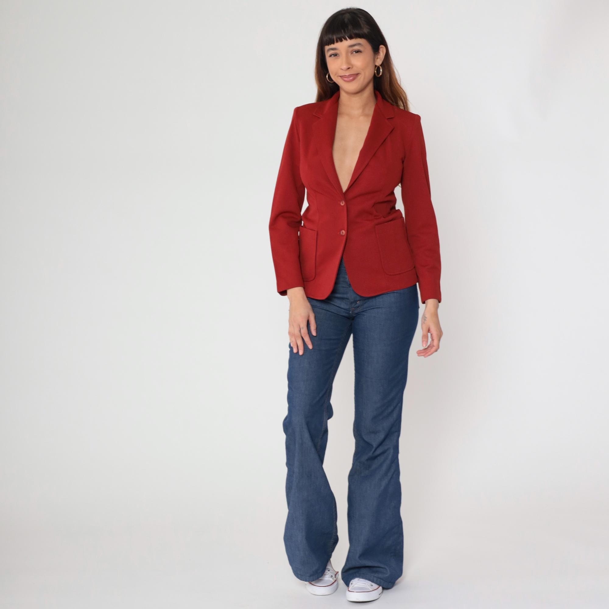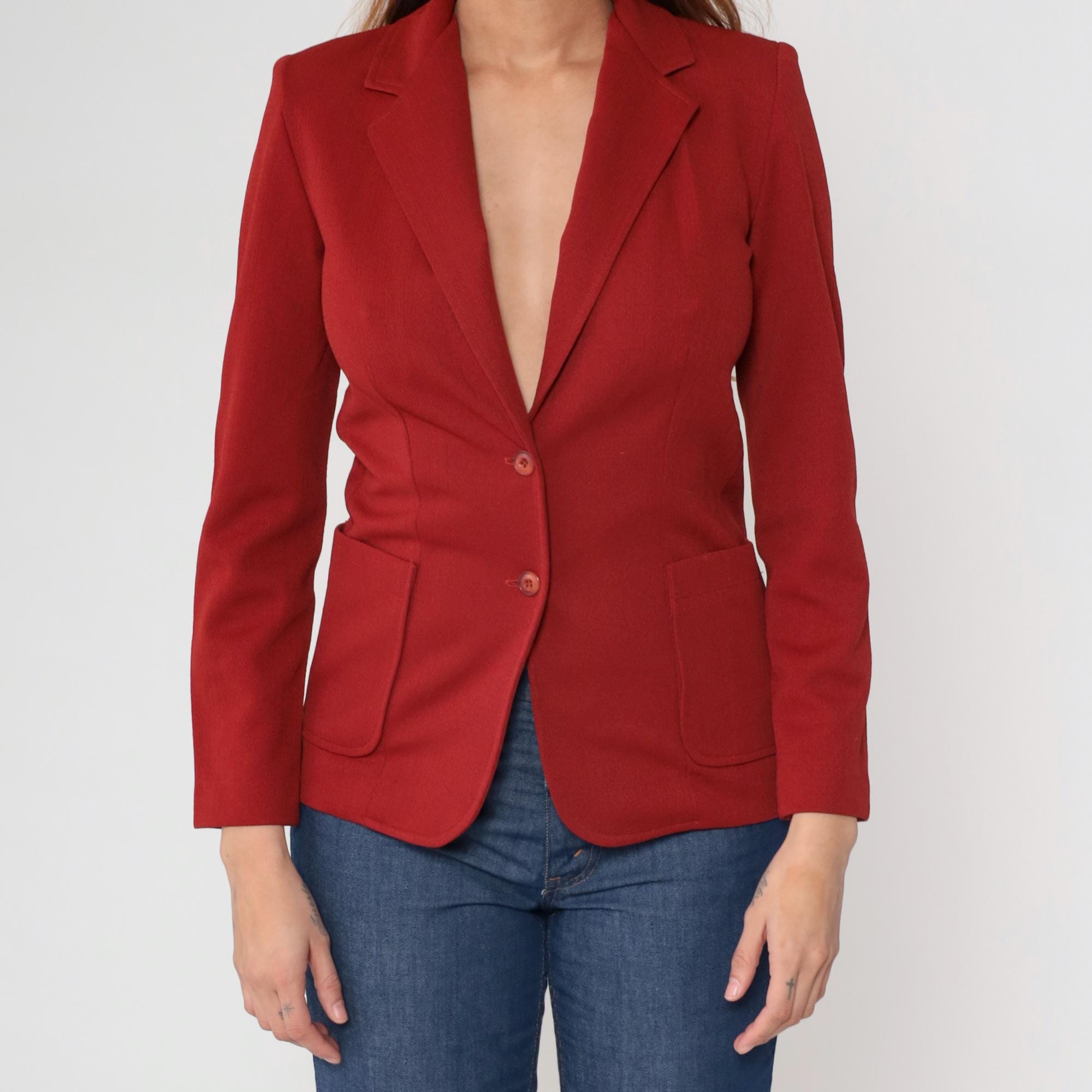 1970s vibrant cherry red blazer from Today's Times. Features a classic tailored fit with notched lapels, two-button front closure with matching red buttons, and two functional front patch pockets. The blazer is fully lined, with structured shoulders and long fitted sleeves.