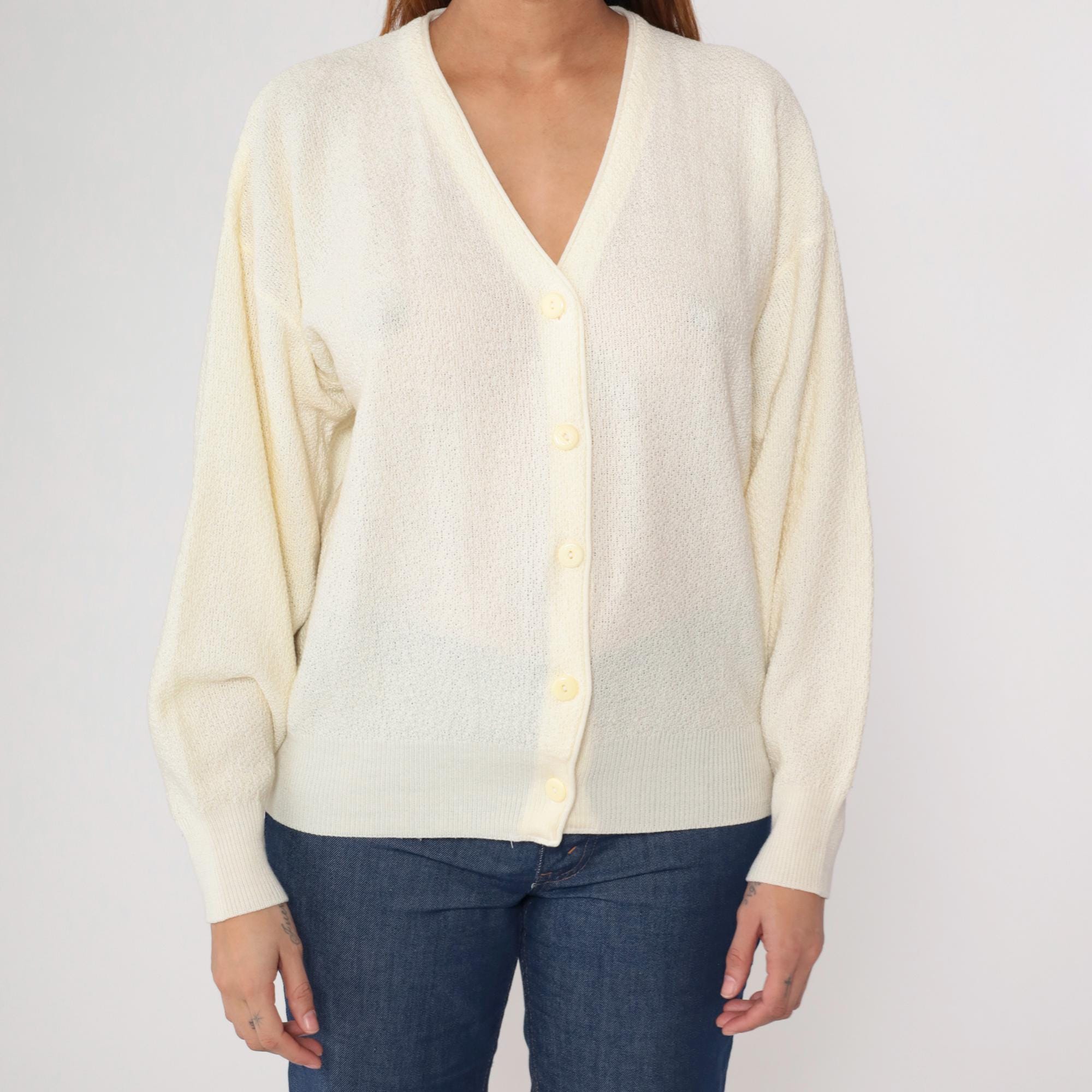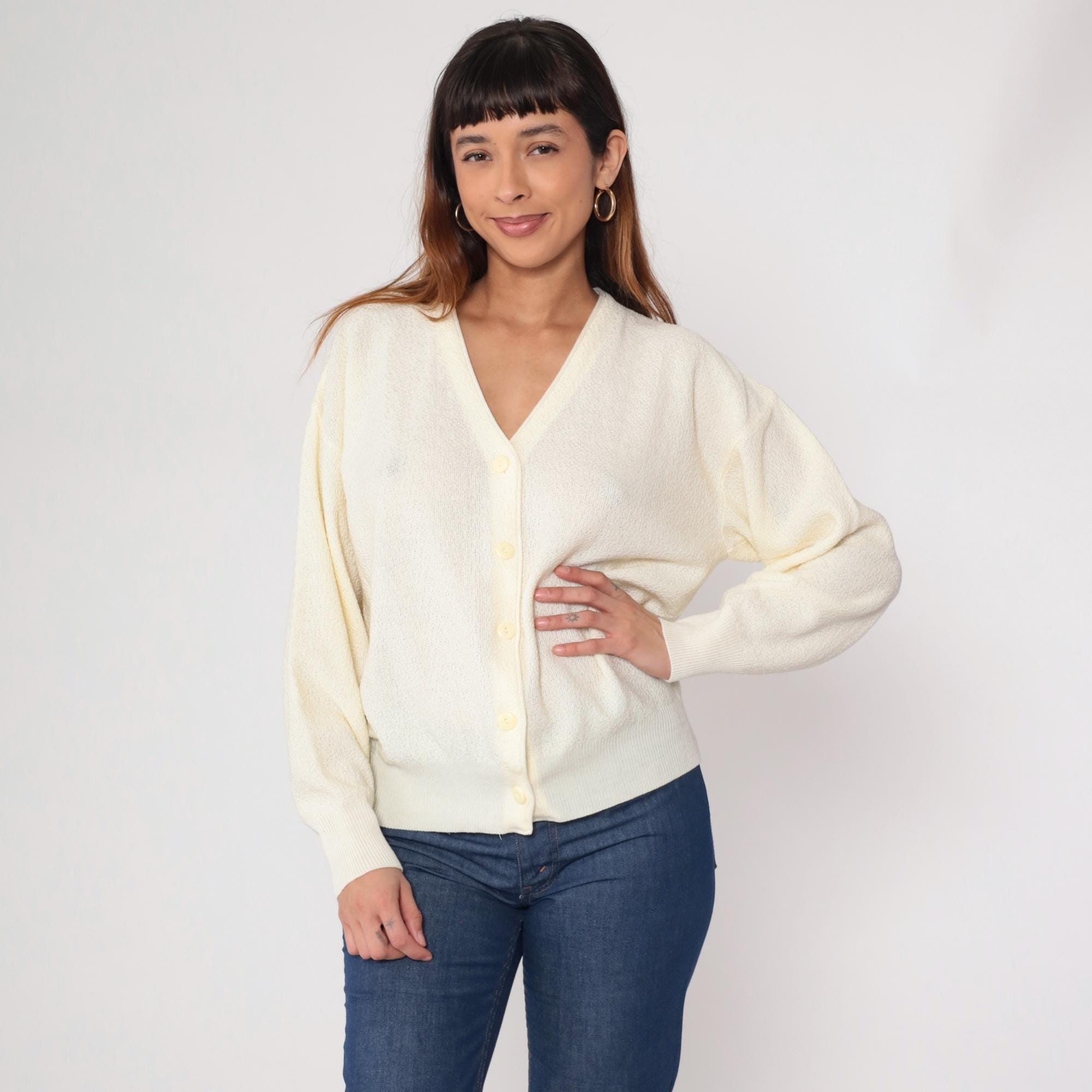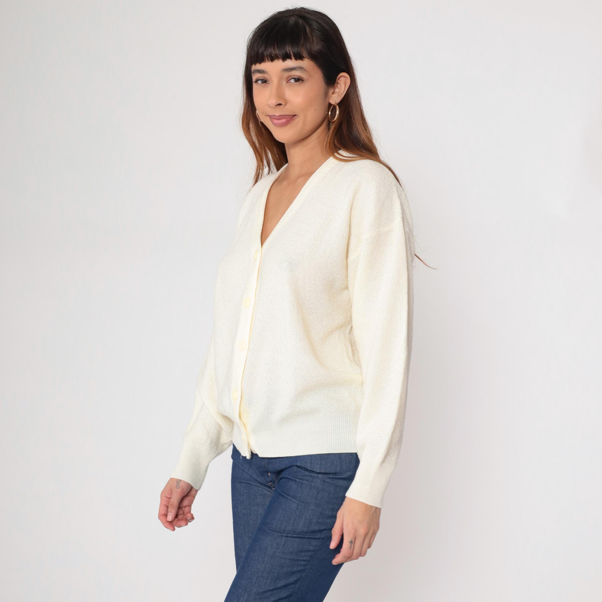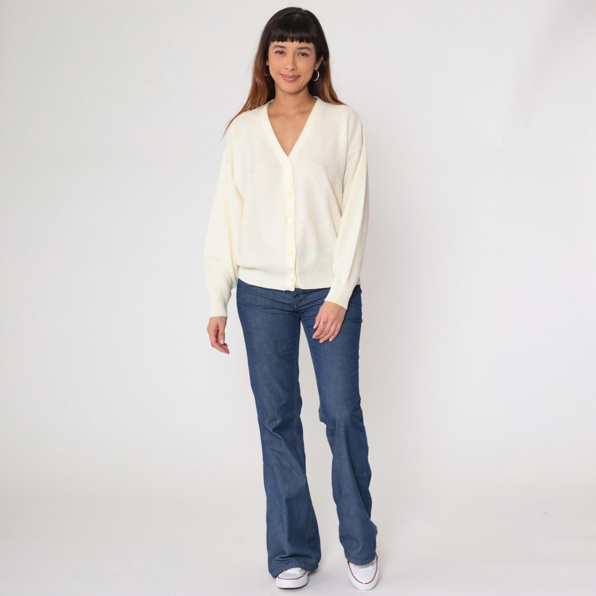 70s cream acrylic cardigan with a V-neckline and button front. Features long sleeves, a soft lightweight knit texture, and a relaxed fit. Finished with ribbed cuffs and hem.