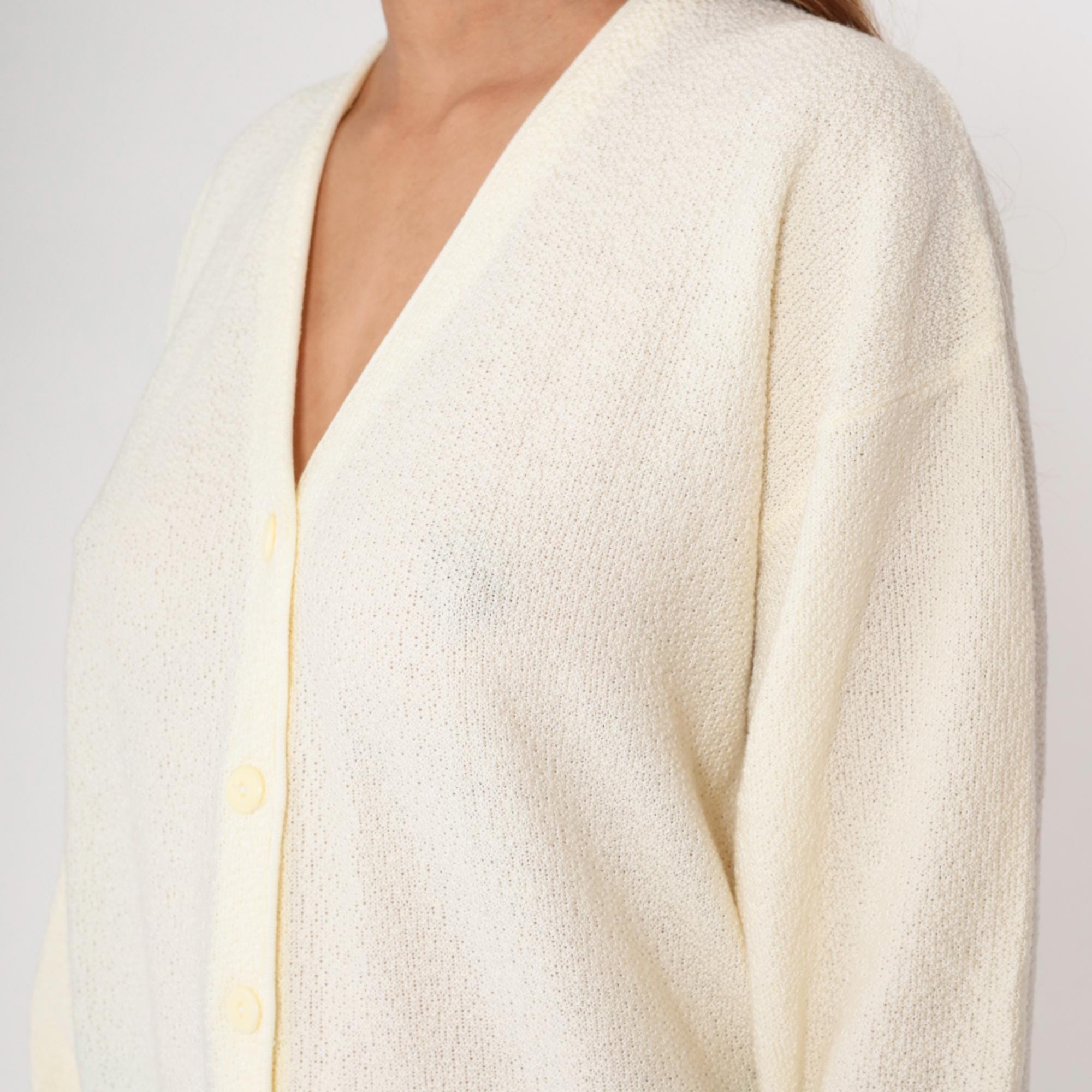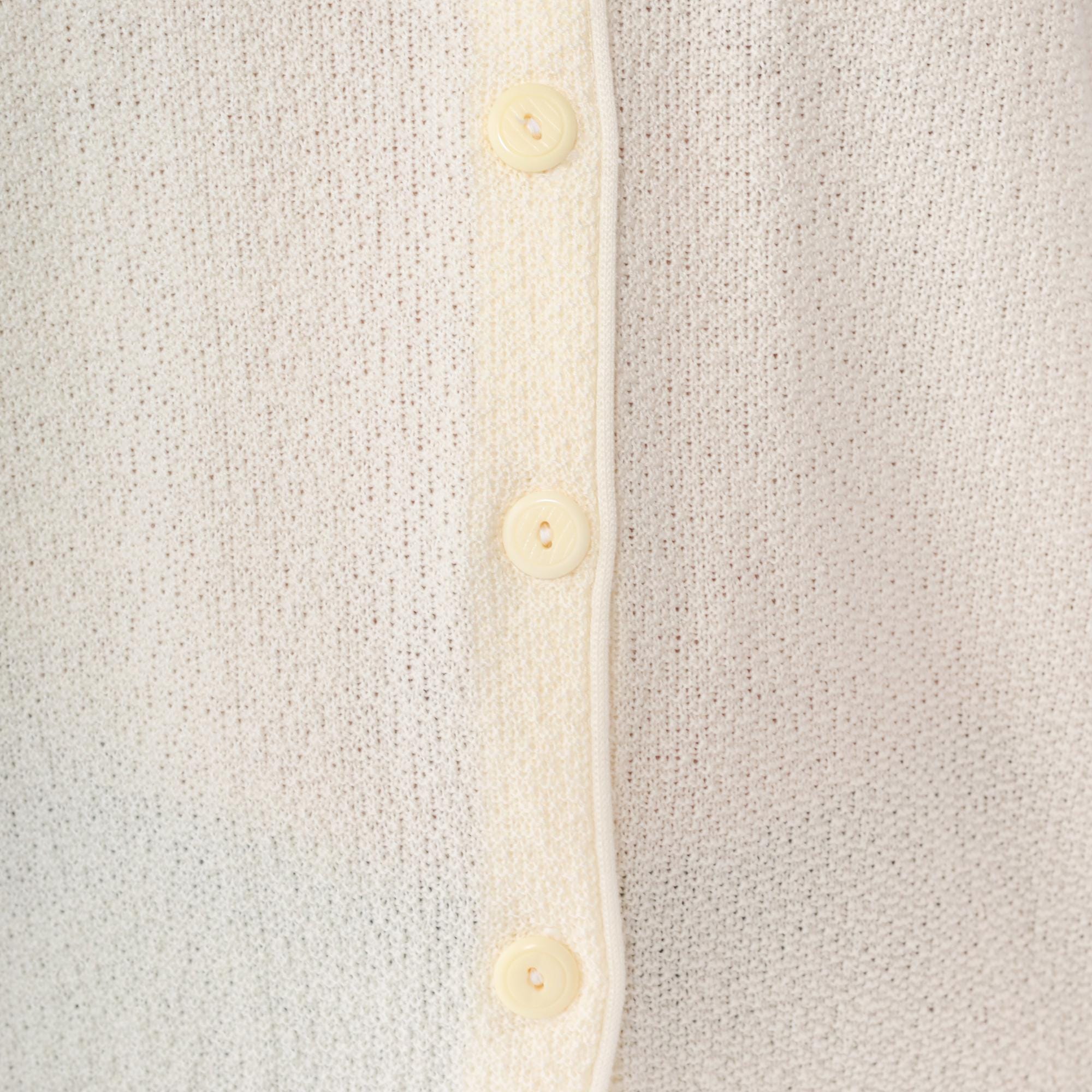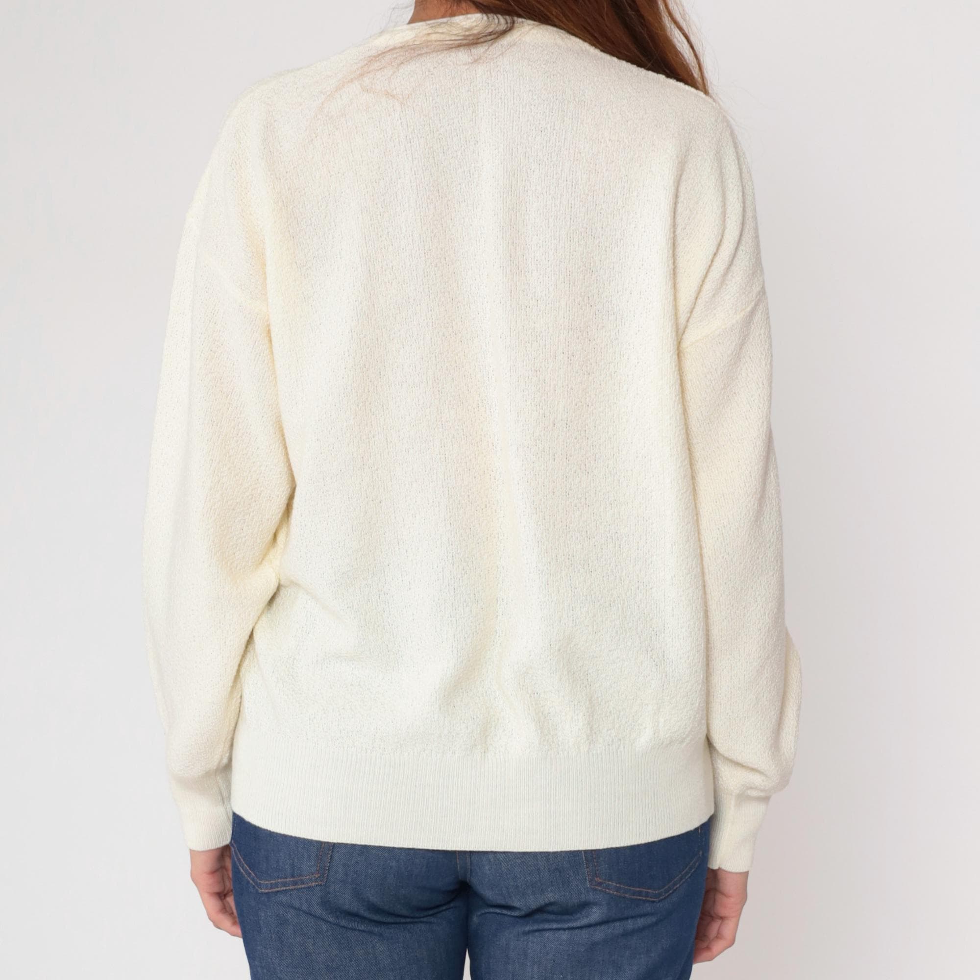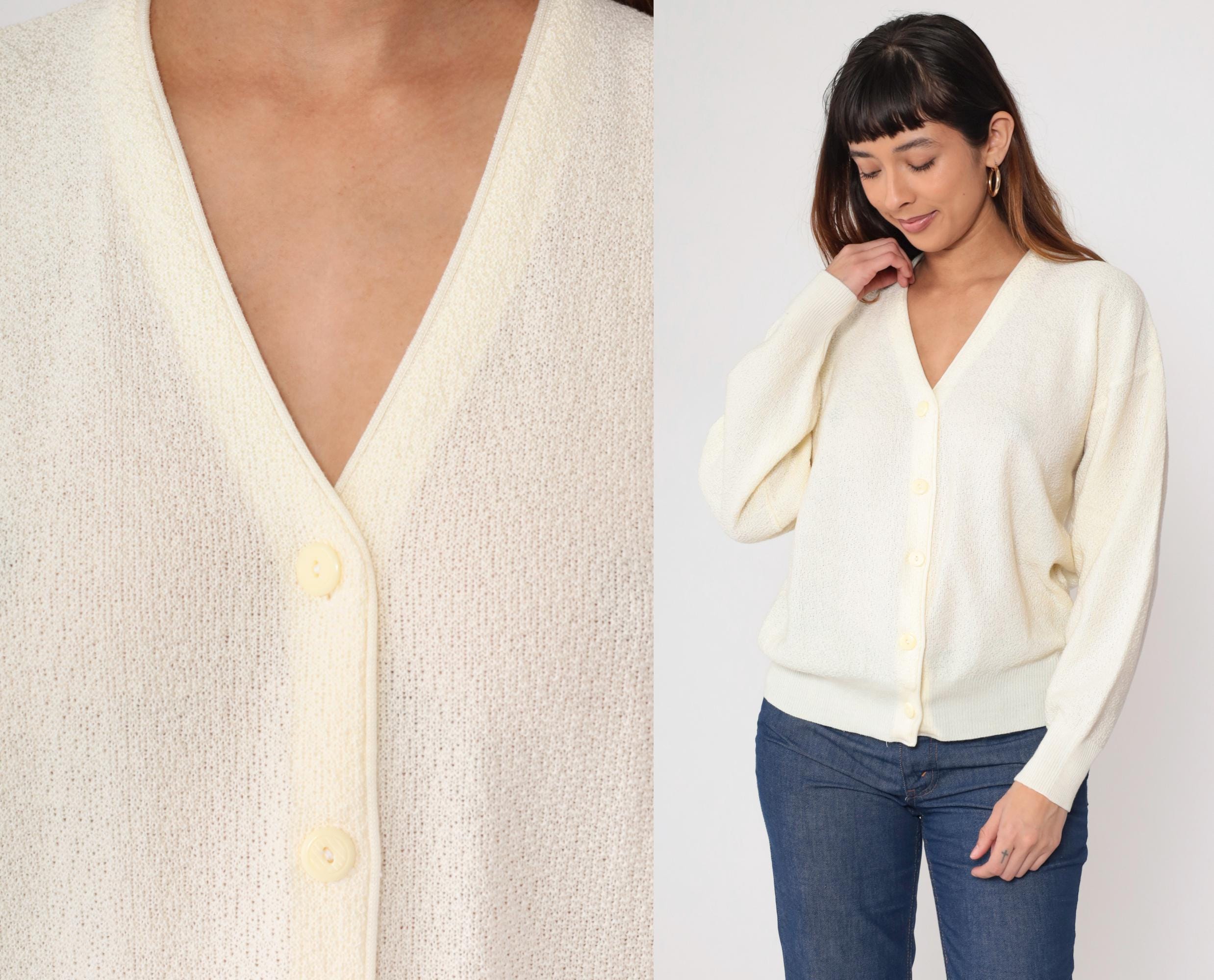 70s cream acrylic cardigan with a V-neckline and button front. Features long sleeves, a soft lightweight knit texture, and a relaxed fit. Finished with ribbed cuffs and hem.